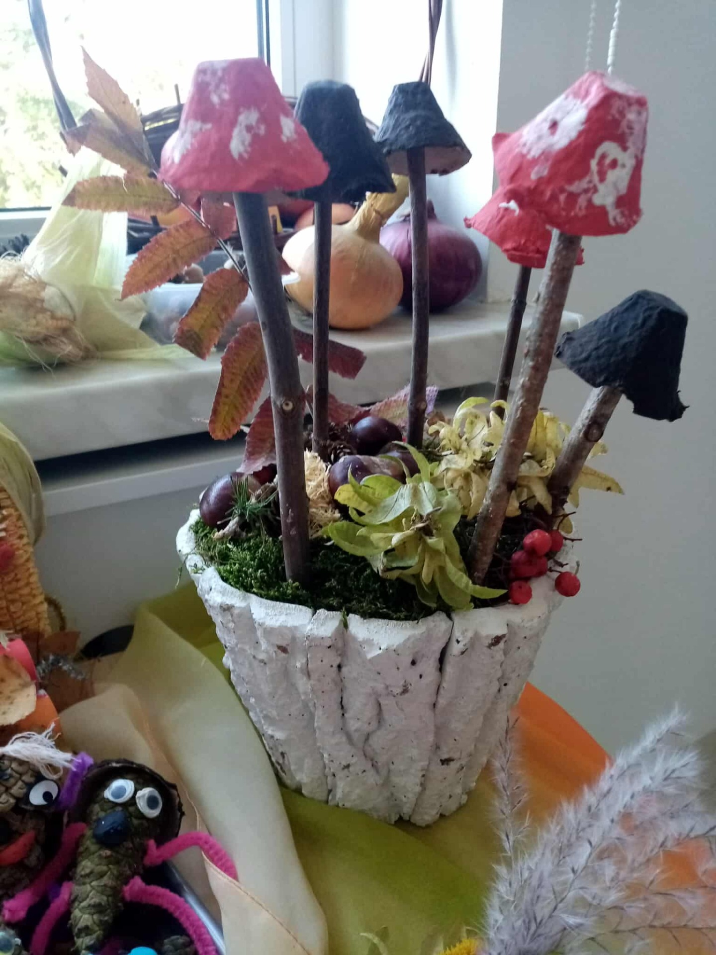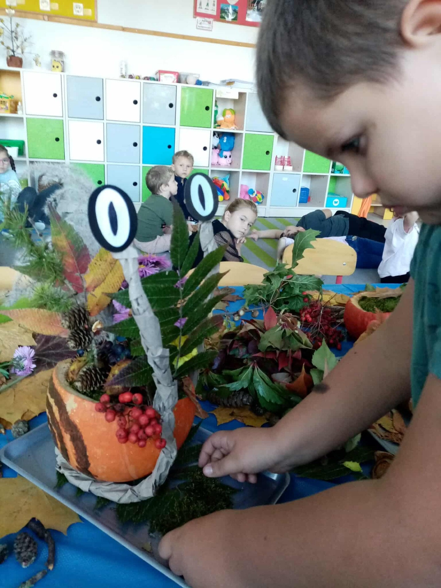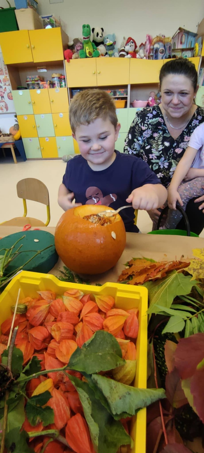 Jesień to taka pora roku, którą dzieci zazwyczaj kojarzą z nudą. Dni stają się coraz krótsze, temperatura spada.....Okazało się, że w naszym Przedszkolu wcale Jesień nie musi być taka nudna.Dni mogą być miłe i wesołe, gdy zaprosimy rodziców do wspólnej zabawy...Dzieci wraz z Rodzicami tworzyły prace z darów jesieni takich jak: mech, kasztany, żołędzie, dynie.....