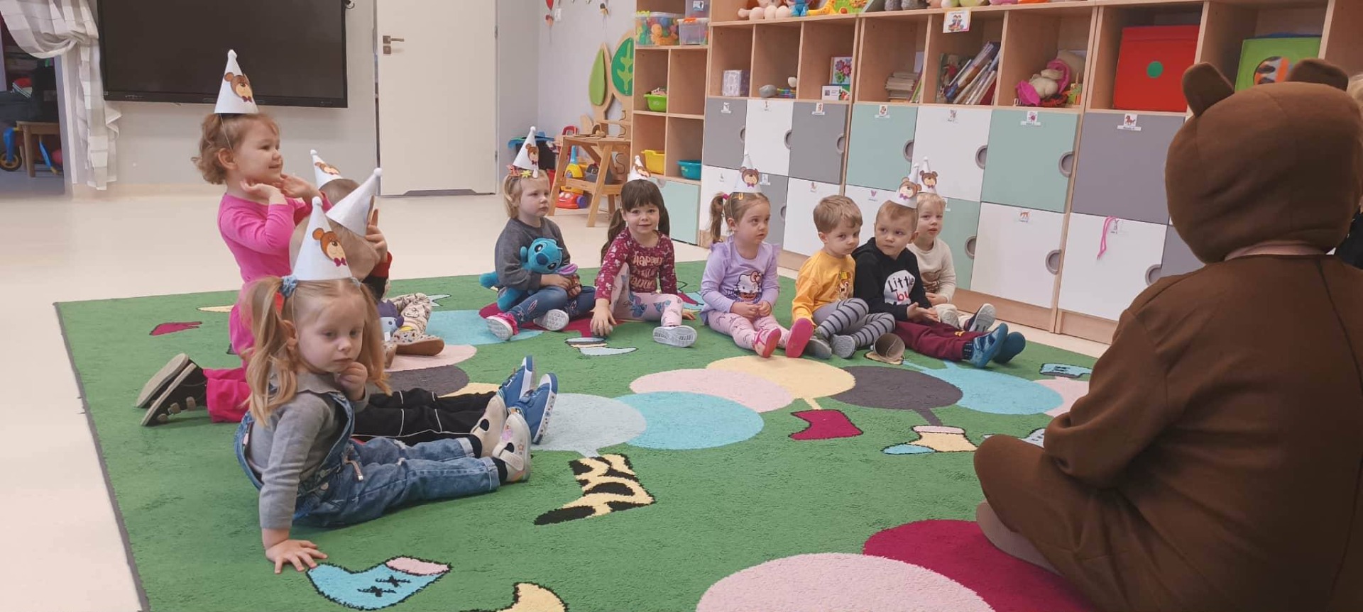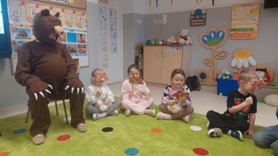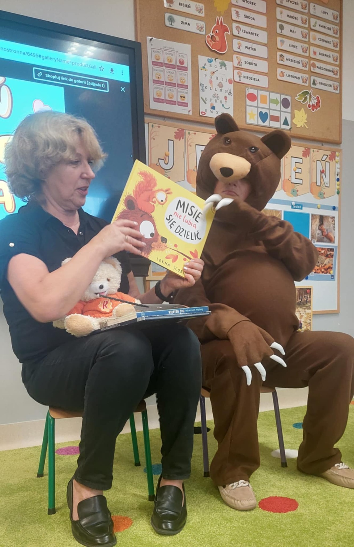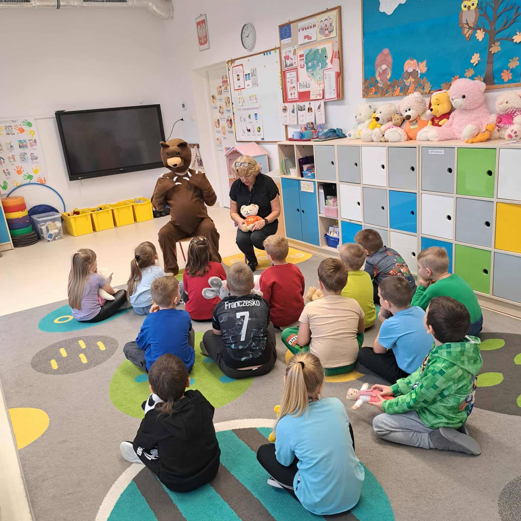Pani Beatka przyniosła ze sobą cudne książki o misiach — tych odważnych, zabawnych i tych trochę rozrabiaków. Dzieci słuchały jak zaczarowane, oglądały ilustracje i od razu dzieliły się historiami o swoich własnych pluszakach 📖✨Oczywiście nie mogło zabraknąć misiowych zabaw: były zgadywanki, zabawy ruchowe, rymowanki i misiowe „przytulasy”, które wywołały tyle śmiechu, że nasz honorowy gość — Pluszowy Miś — aż się „uśmiechał” ze swojego miejsca 😄🧸Całe spotkanie było pełne ciepła, dobrej energii i dziecięcej fantazji. Takie dni przypominają nam, że miś to nie tylko zabawka, ale mały, puchaty przyjaciel, który zna wszystkie dziecięce sekrety i zawsze czeka na przytulenie ❤️