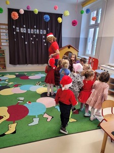 ,, 6 grudnia -jak dobrze wiecie, Święty Mikołaj chodzi świecie. Dźwiga swój worek niezmordowanie i każde dziecko prezent dostanie. A kiedy rozda już prezenty wraca do nieba uśmiechnięty....