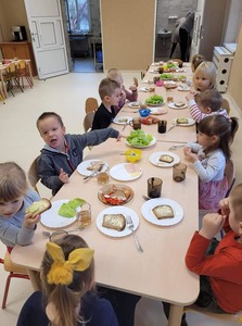 Dzisiaj w naszym przedszkolu obchodziliśmy ,,Dzień Zdrowego Śniadania". W tym dniu dzieci samodzielnie komponowały zdrowe kanapki. Przedszkolaki zapoznały się również z piramidą żywieniową. Akcja ma na celu promocję zasad racjonalnego zdrowego żywienia.