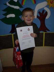 Oliwier Zieliński z grupy czterolatków otrzymał wyróżnienie w ogólnopolskim konkursie plastycznym zorganizowanym przez Komendę Powiatową Straży Pożarnej w Olecku pod hasłem ,,Zapobiegajmy pożarom”.