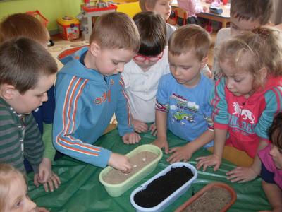 Problem badawczy: czy fasola posadzona w piasku urośnie? Na to pytanie szukają odpowiedzi przedszkolaki.