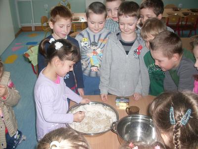 19.02.2013 r. przedszkolaki piekły samodzielnie chleb. Poznały różne rodzaje mąki, składniki potrzebne do wypieku chleba oraz etapy jego powstawania. Dzieci zdecydowały się upiec chleb z mąki żytniej z otrębami i ziarnami. Oba chlebki udały się znakomicie, a i smakowały bardzo :)...