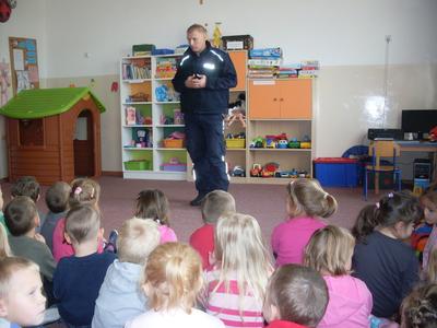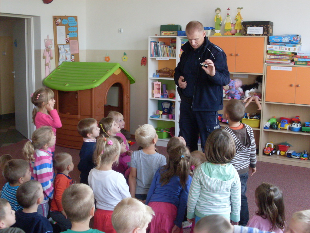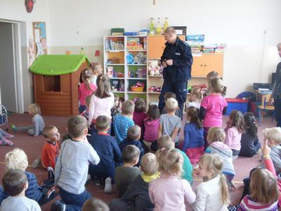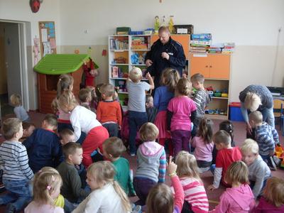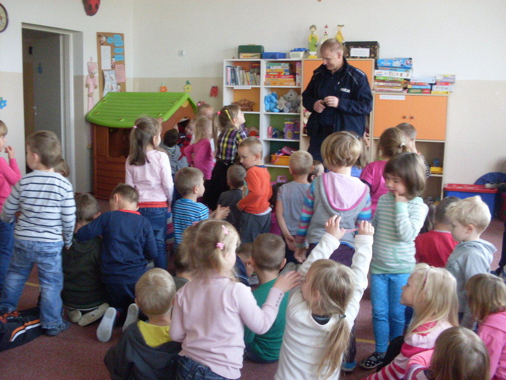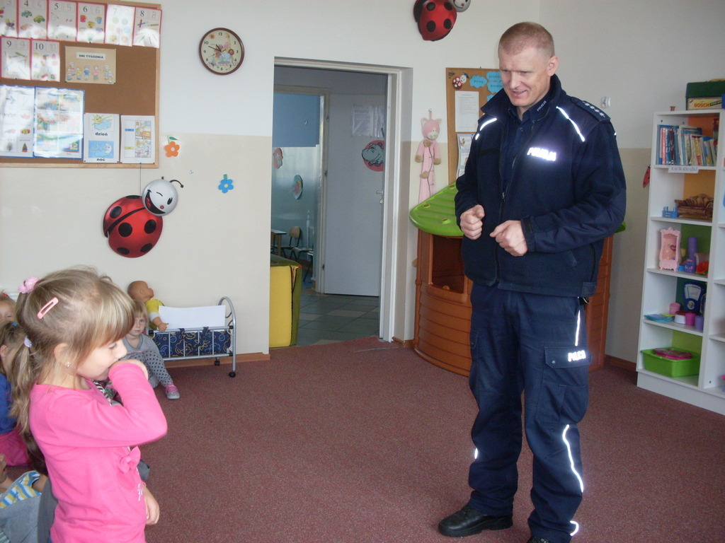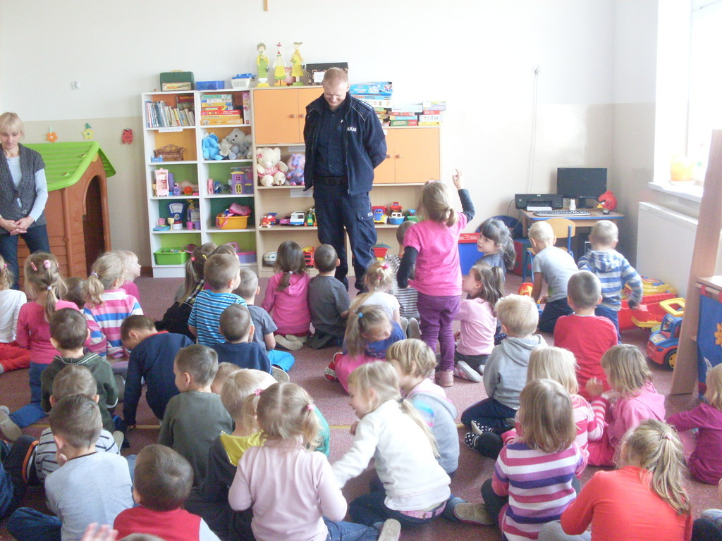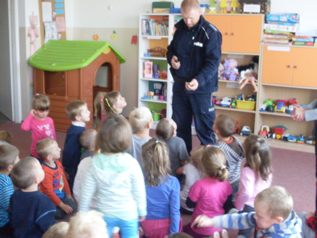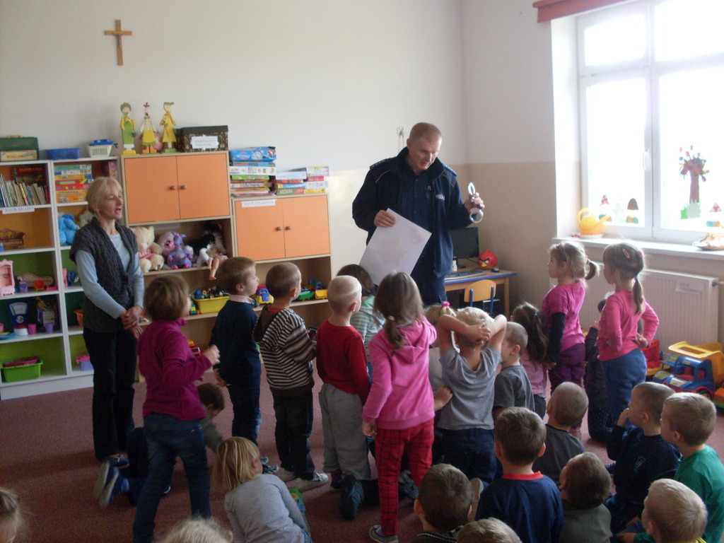 W trosce o bezpieczeństwo naszych podopiecznych przedszkole odwiedził dzielnicowy Kowali Oleckich. Uświadomił dzieciom jakie zachowania są źródłem zagrożeń i jak ich unikać. Wyjaśnił, dlaczego zakazy i zasady są ważne i czemu one służą. Dotyczyły one m.in. ruchu drogowego i miejsc zabaw dla dzieci.