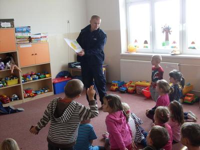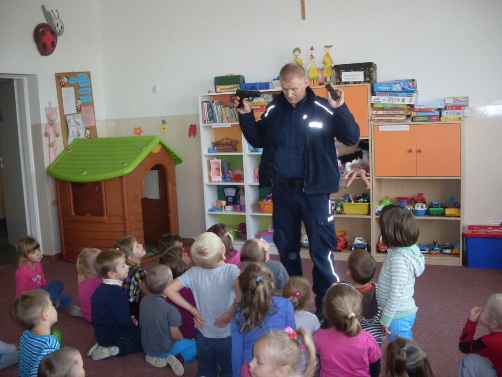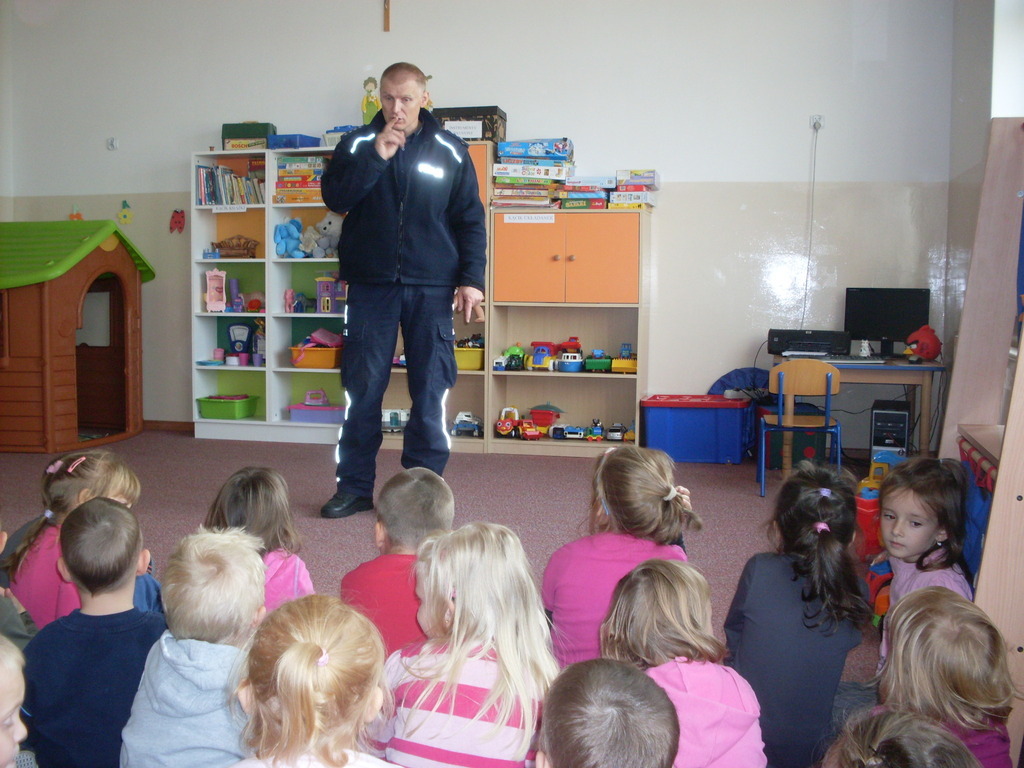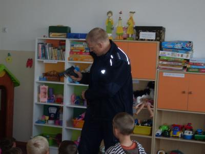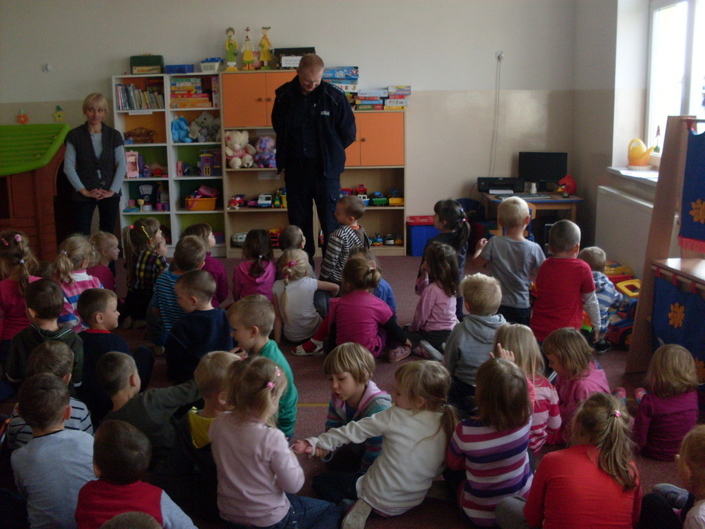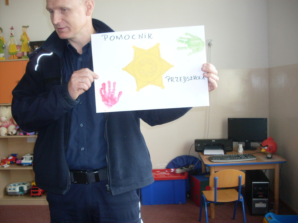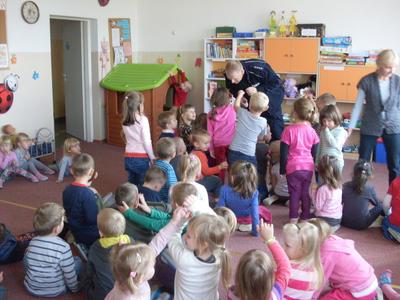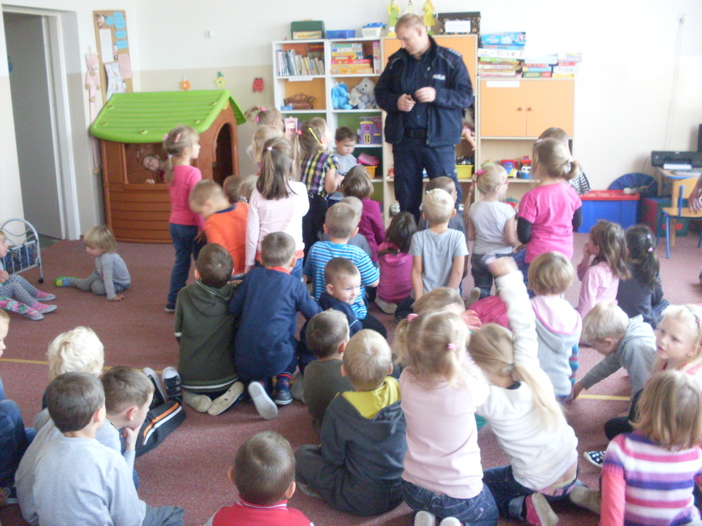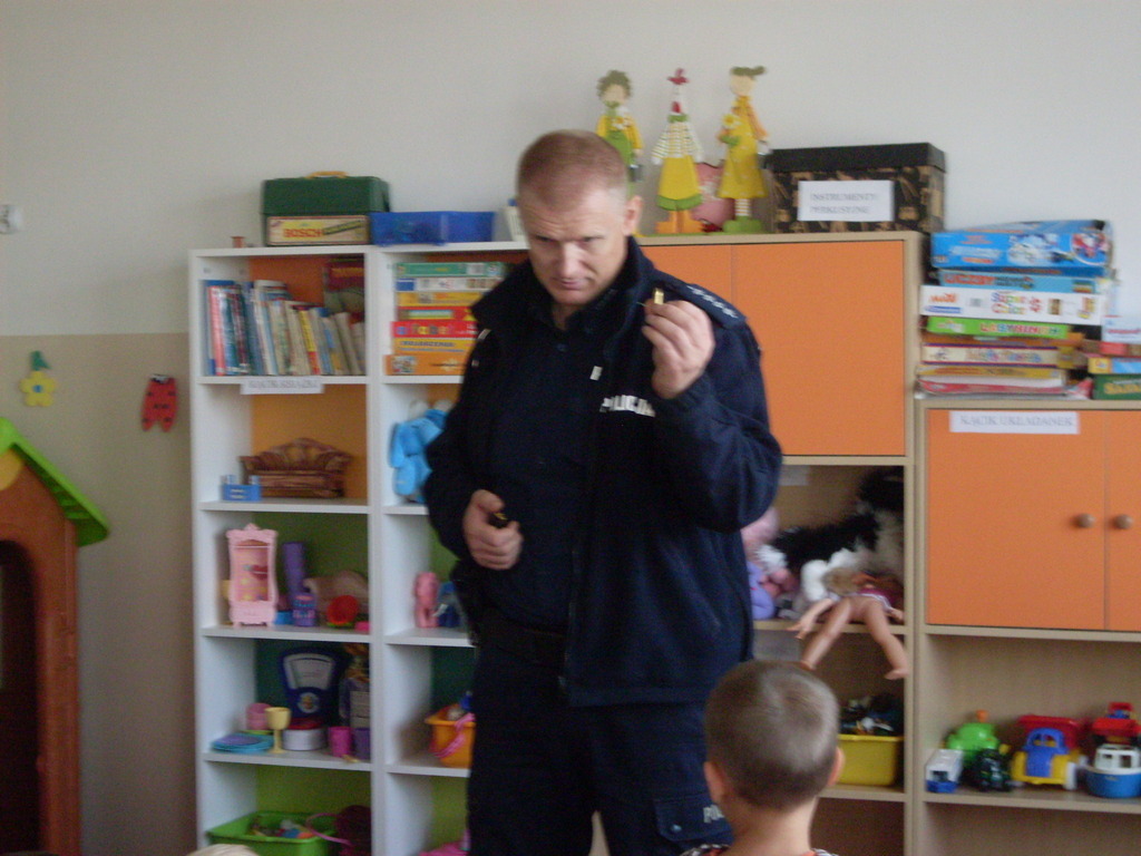 W trosce o bezpieczeństwo naszych podopiecznych przedszkole odwiedził dzielnicowy Kowali Oleckich. Uświadomił dzieciom jakie zachowania są źródłem zagrożeń i jak ich unikać. Wyjaśnił, dlaczego zakazy i zasady są ważne i czemu one służą. Dotyczyły one m.in. ruchu drogowego i miejsc zabaw dla dzieci.