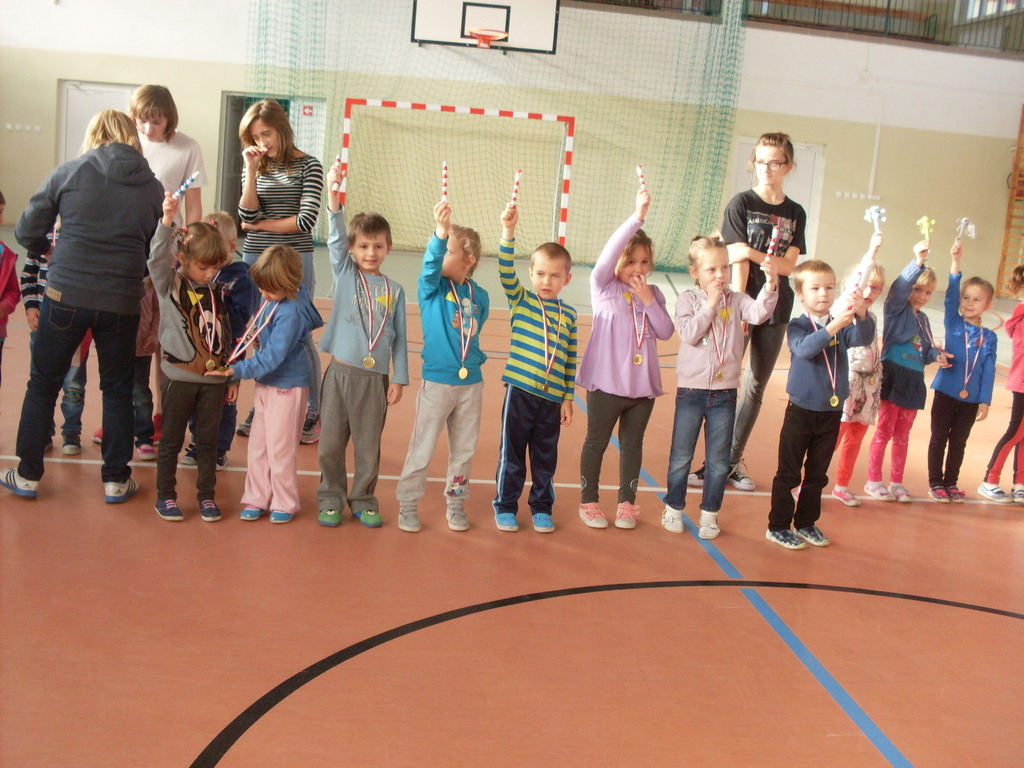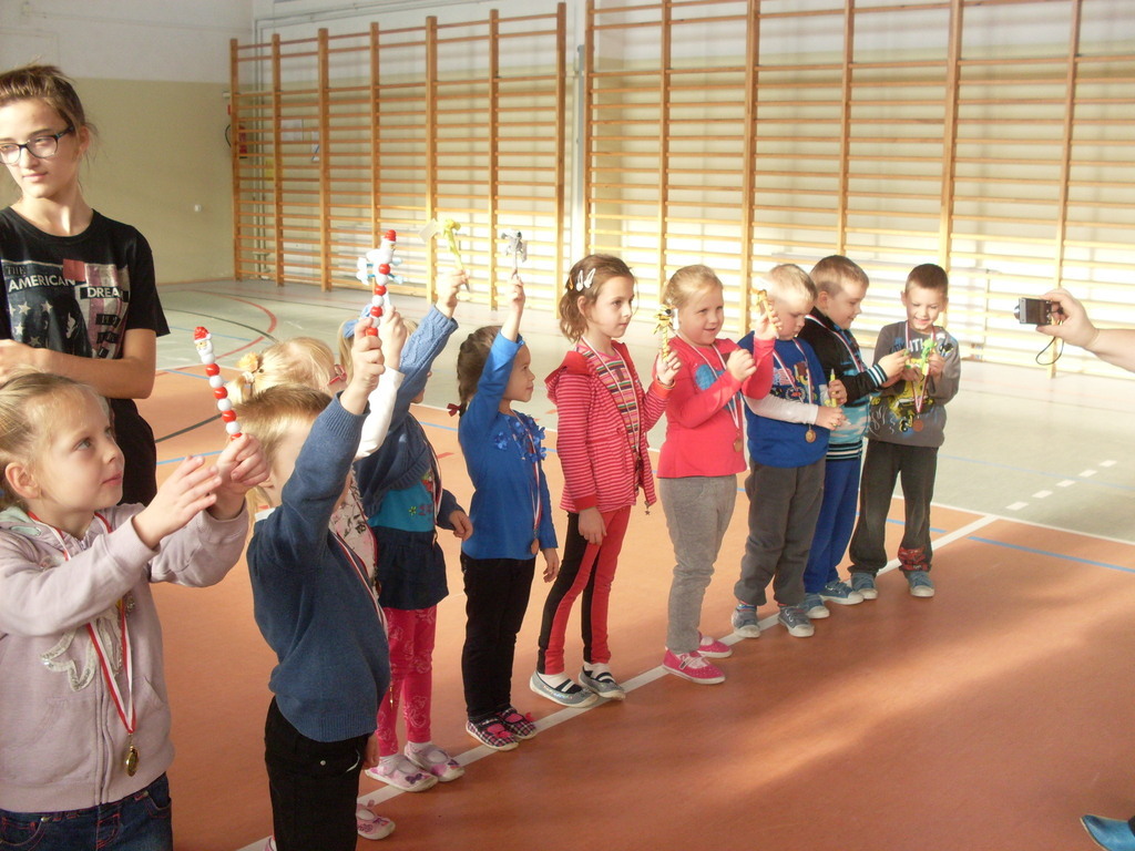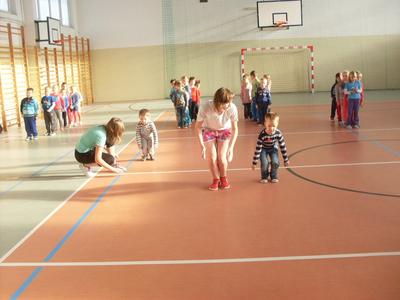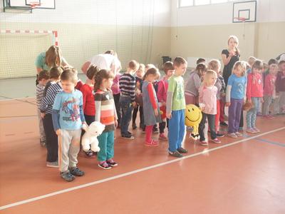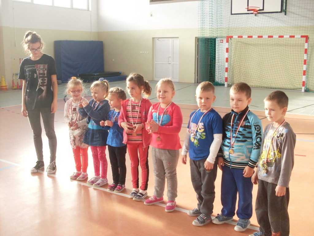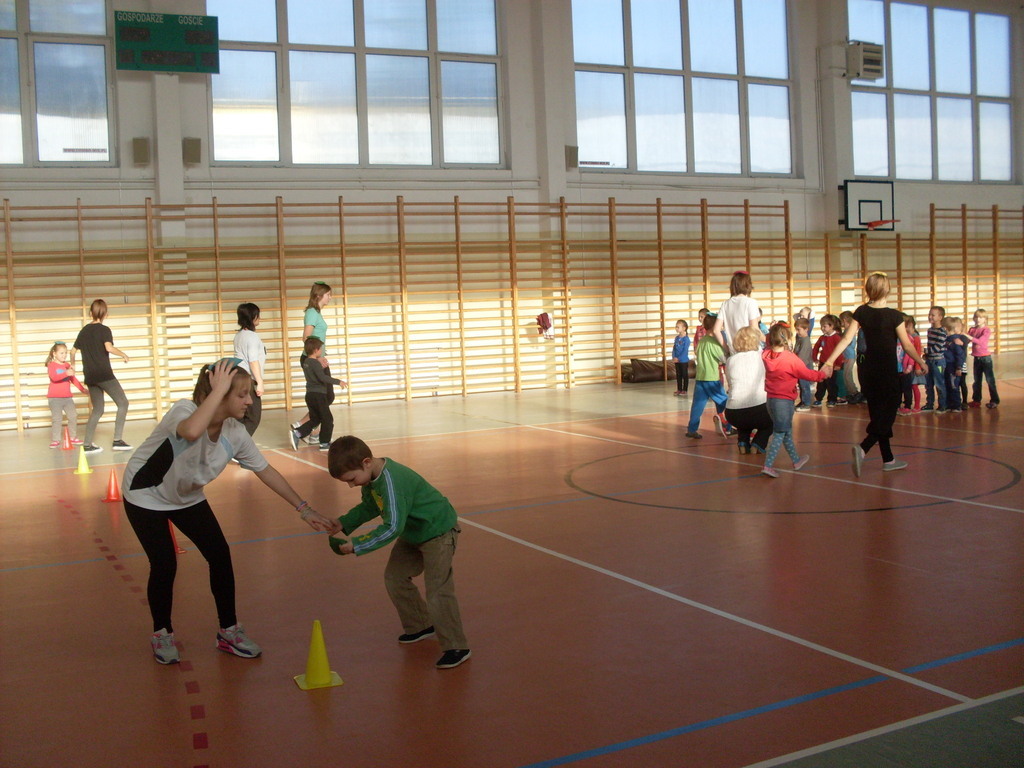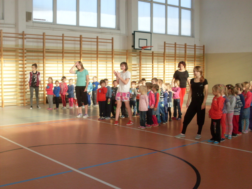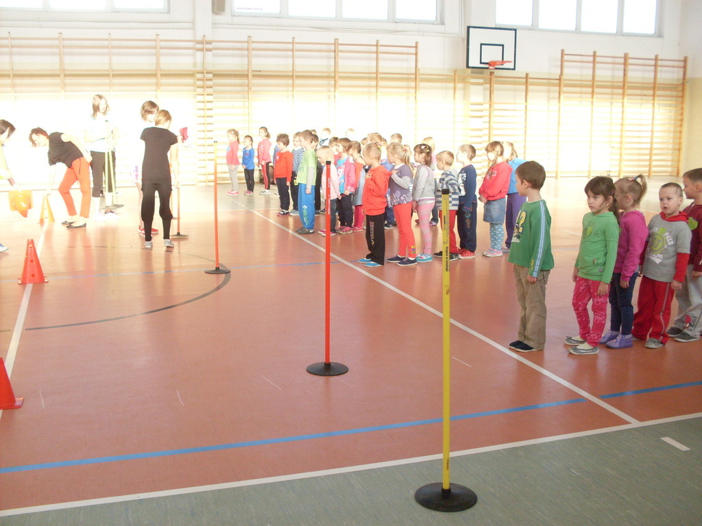 Dzieci aktywnie spędziły czas w sali gimnastycznej Publicznego Gimnazjum. Wzięły udział w zawodach sportowych, w których ważny udział mieli gimnazjaliści, pomagający im w konkurencjach sportowych. Dzieci świetnie się bawiły i doskonale wykonywały zadania.