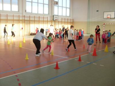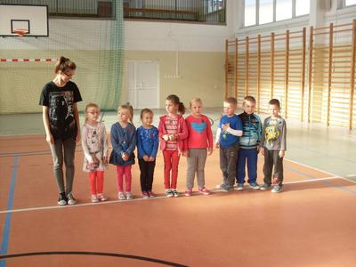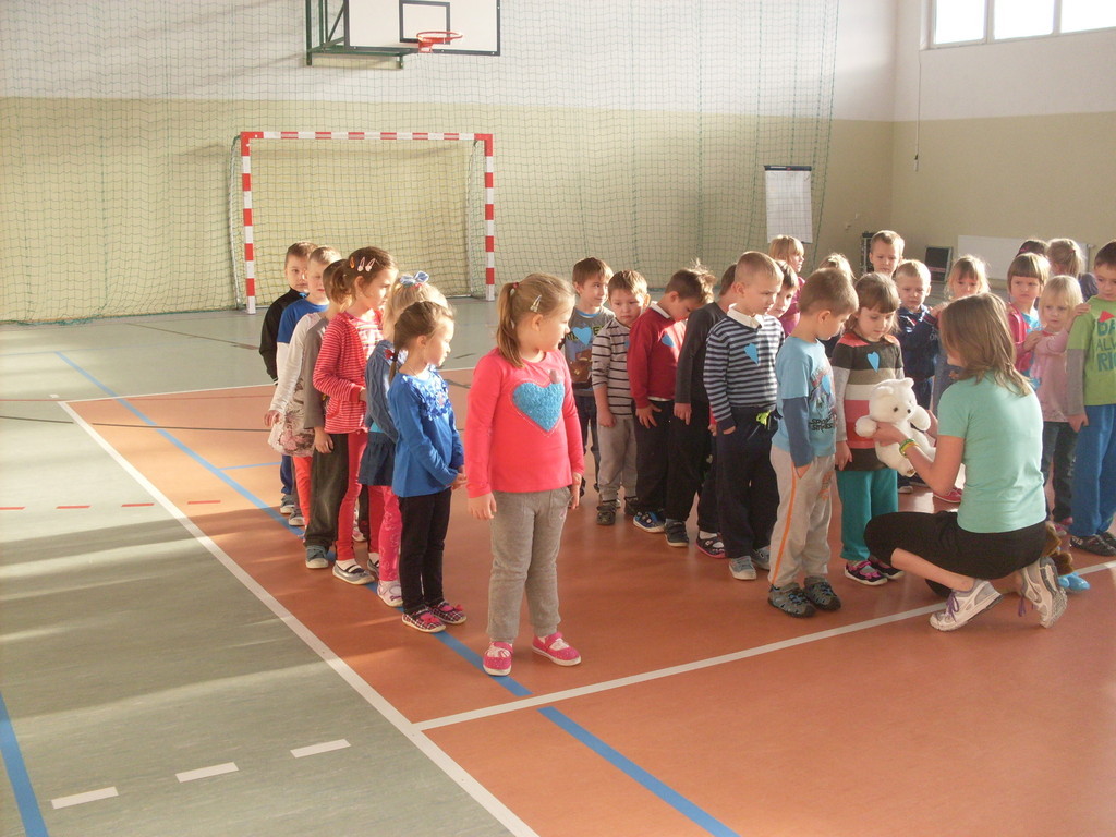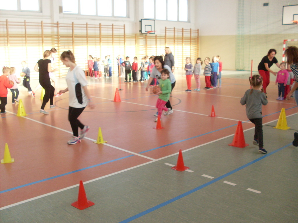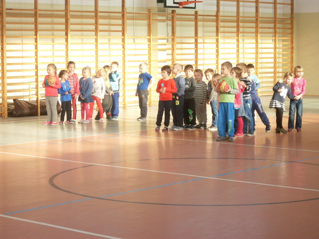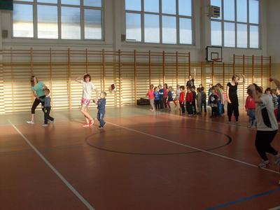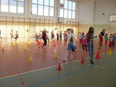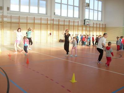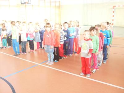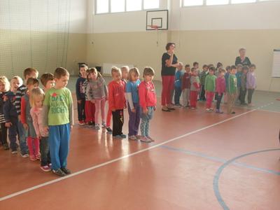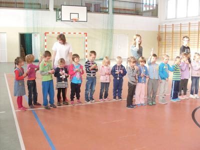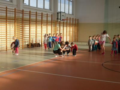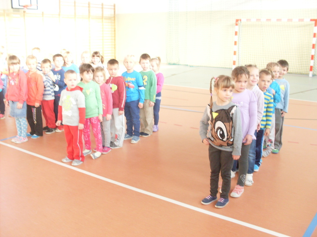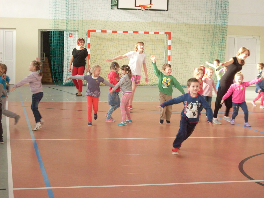 Dzieci aktywnie spędziły czas w sali gimnastycznej Publicznego Gimnazjum. Wzięły udział w zawodach sportowych, w których ważny udział mieli gimnazjaliści, pomagający im w konkurencjach sportowych. Dzieci świetnie się bawiły i doskonale wykonywały zadania.