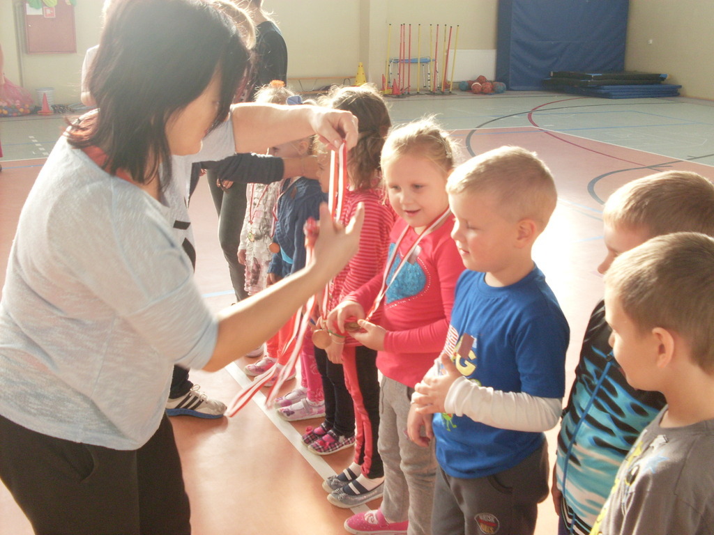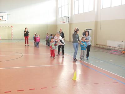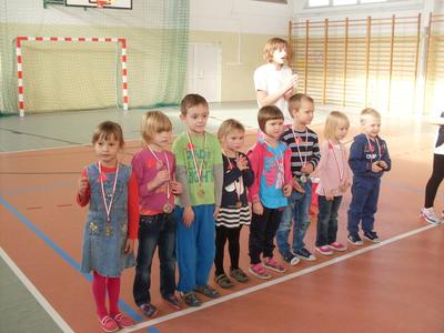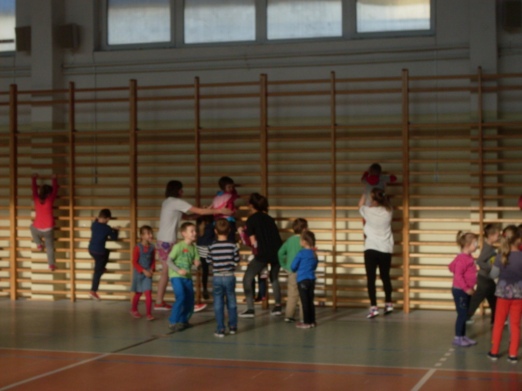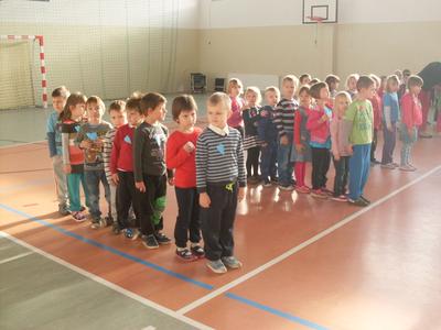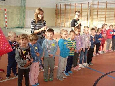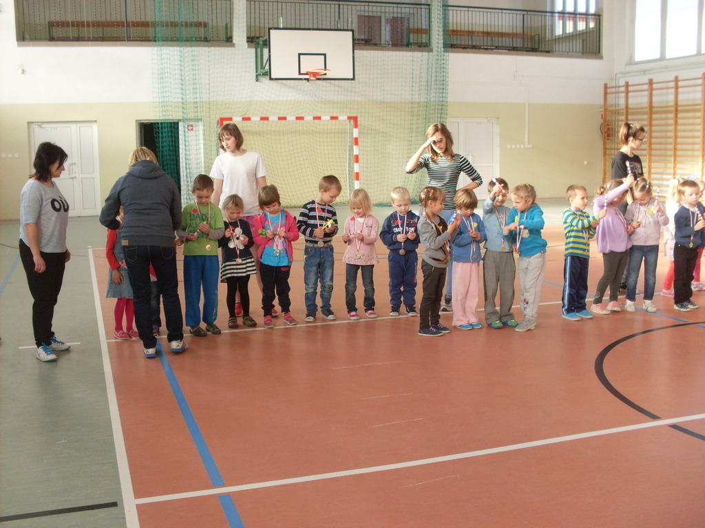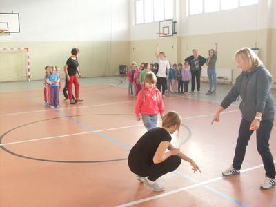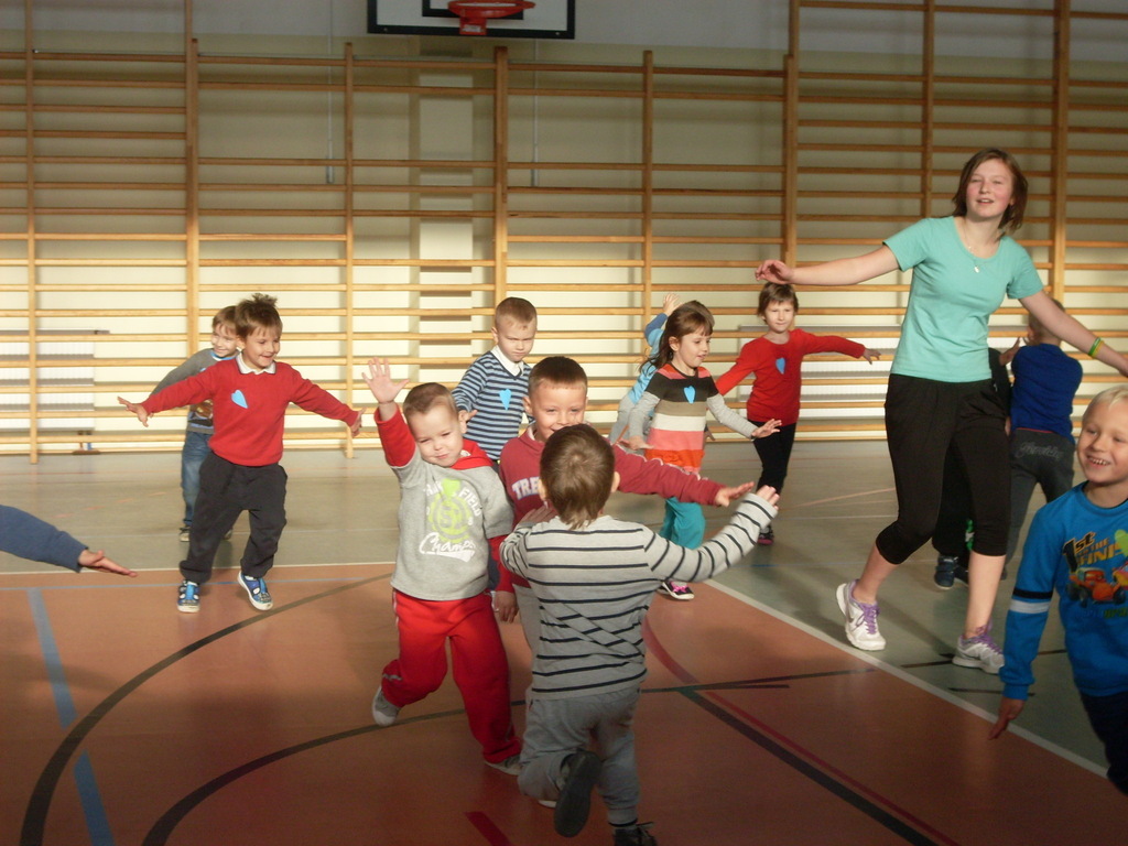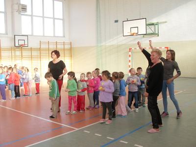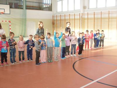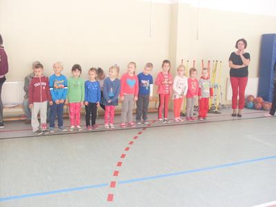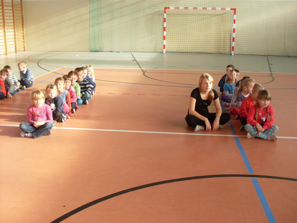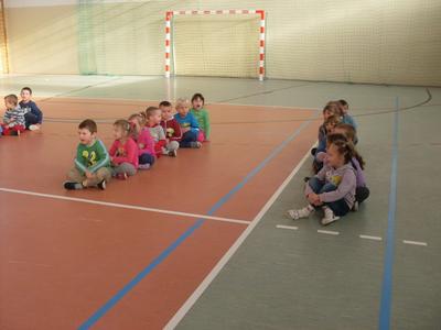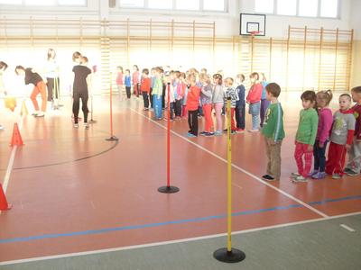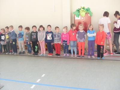 Dzieci aktywnie spędziły czas w sali gimnastycznej Publicznego Gimnazjum. Wzięły udział w zawodach sportowych, w których ważny udział mieli gimnazjaliści, pomagający im w konkurencjach sportowych. Dzieci świetnie się bawiły i doskonale wykonywały zadania.