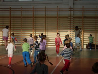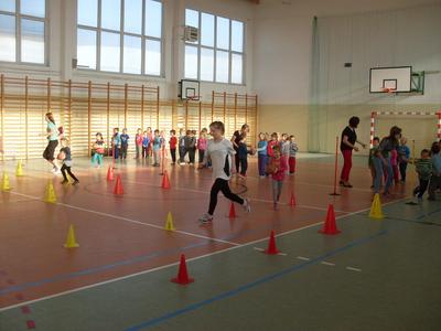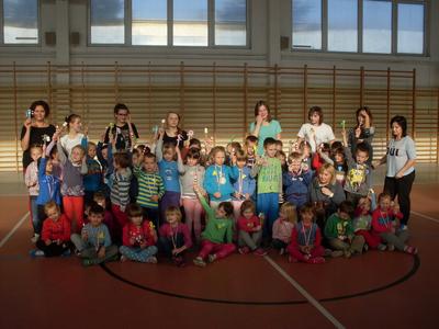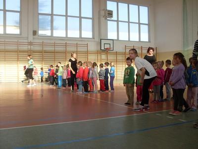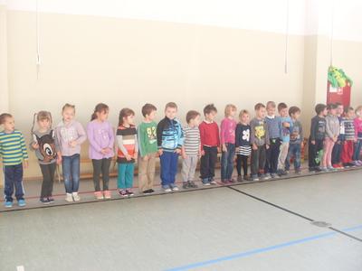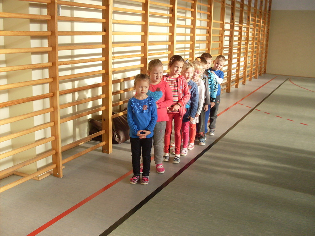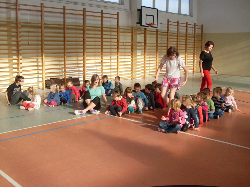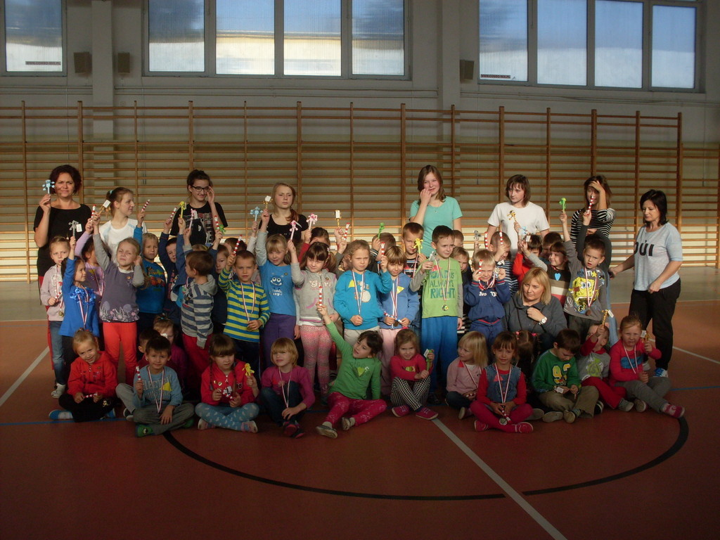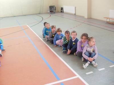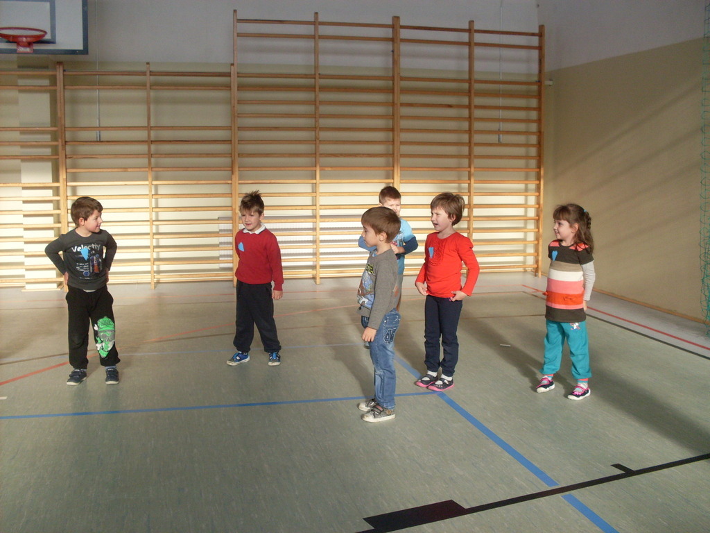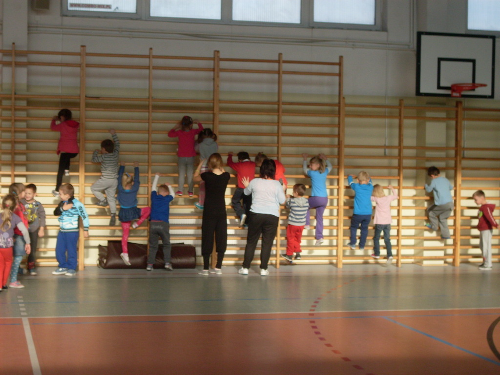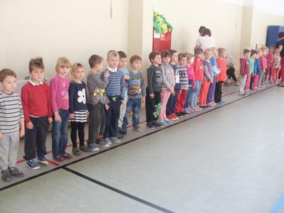 Dzieci aktywnie spędziły czas w sali gimnastycznej Publicznego Gimnazjum. Wzięły udział w zawodach sportowych, w których ważny udział mieli gimnazjaliści, pomagający im w konkurencjach sportowych. Dzieci świetnie się bawiły i doskonale wykonywały zadania.