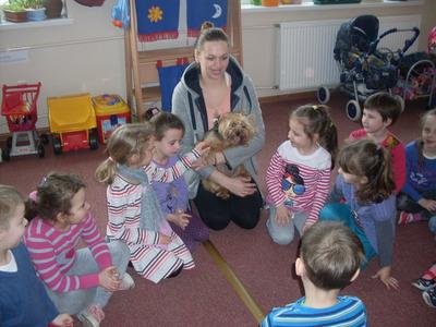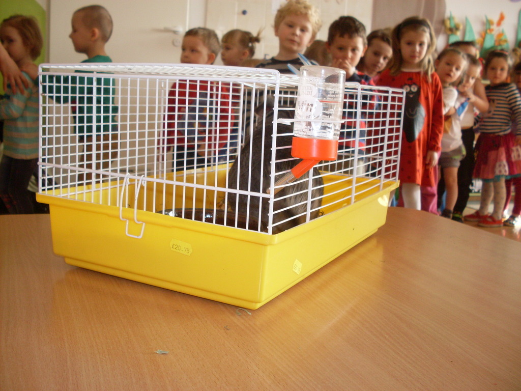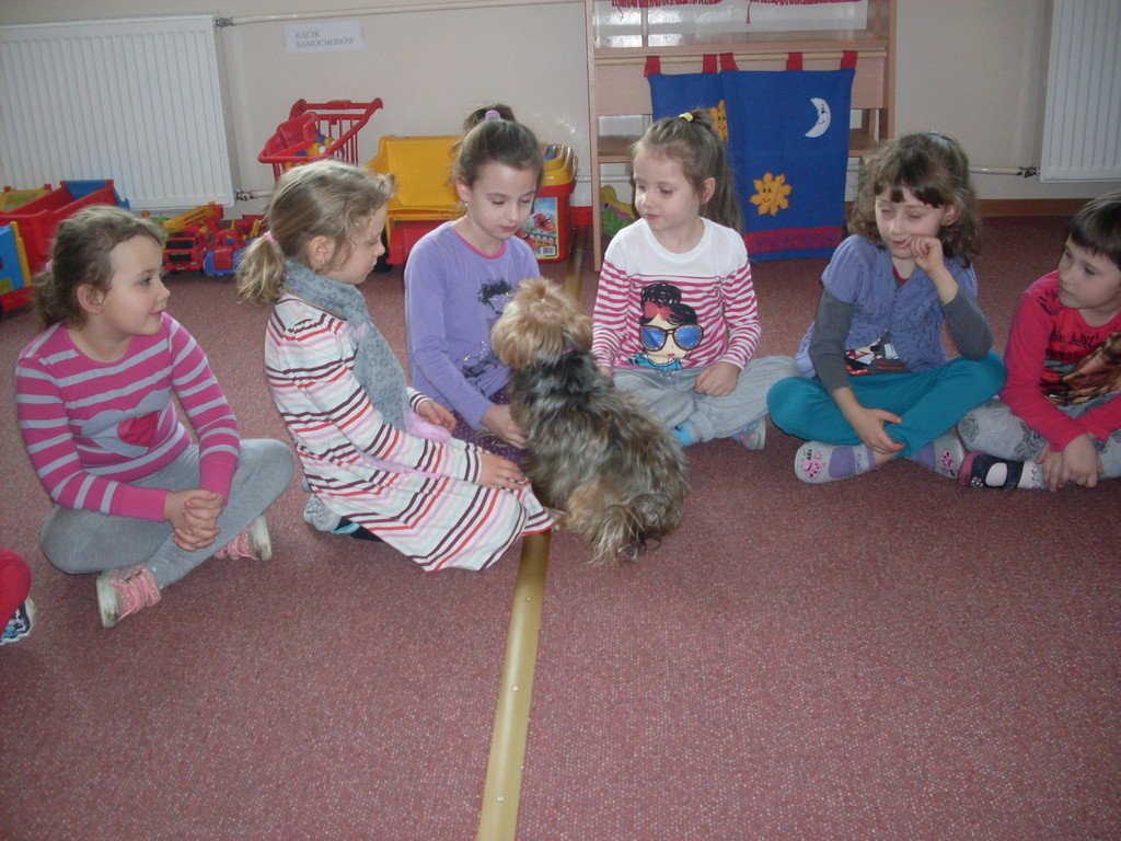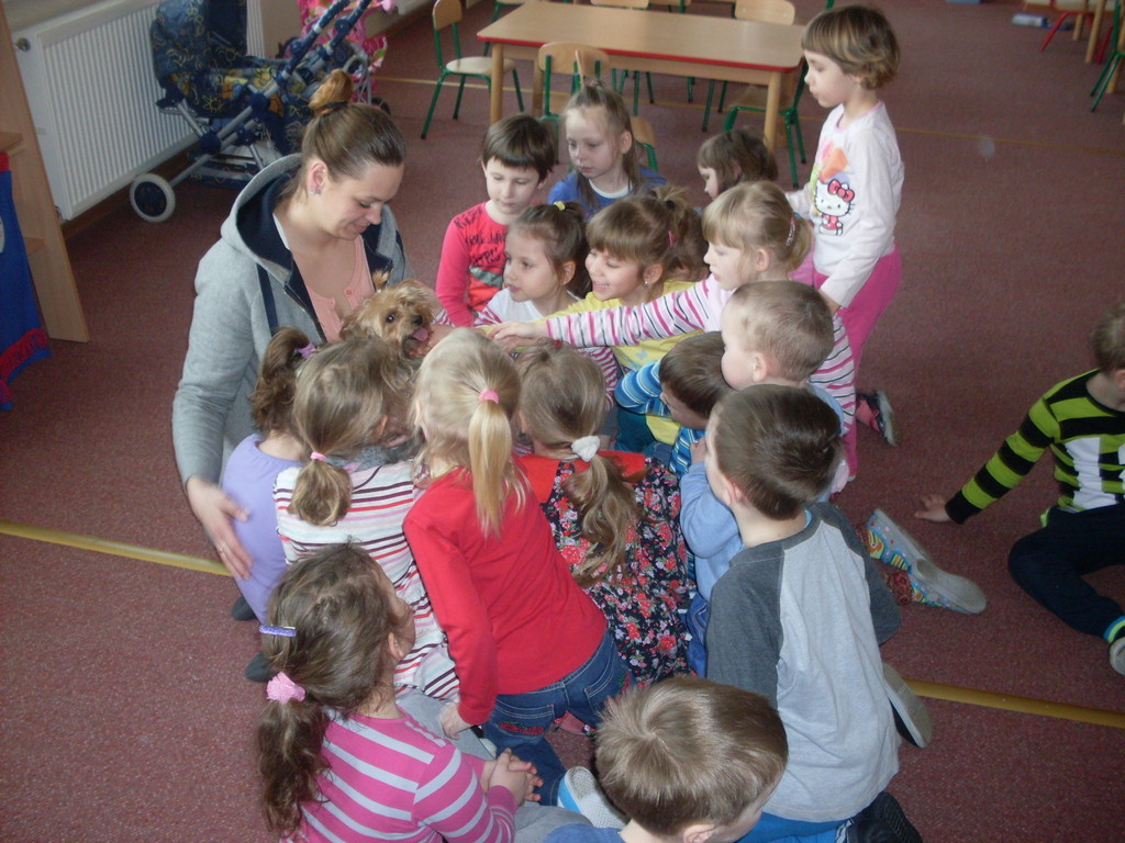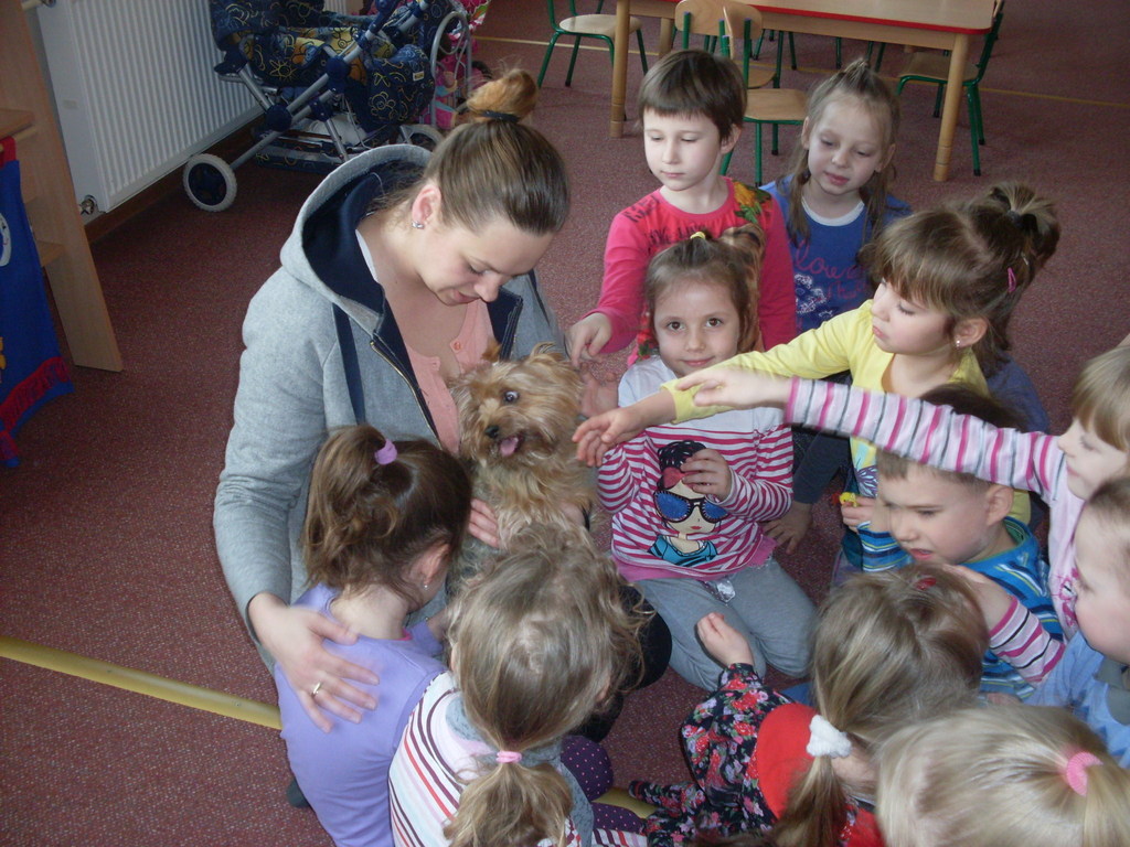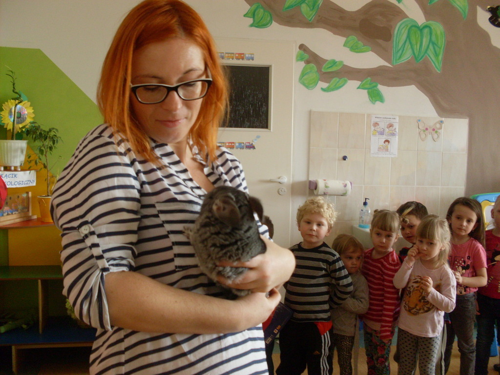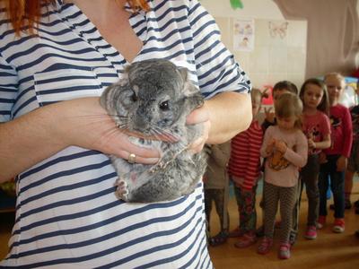 Pasją do zwierząt domowych zarazili dzisiaj przedszkolaków Dawid i Kornelia. Dzięki uprzejmości swoich rodziców stworzyli w przedszkolu radosną atmosferę. Dzieci  dowiedziały się jak należy dbać o pieska i szynszyla. Zadawały pytania dotyczące higieny, sposobu żywienia i zwyczajów swoich pupilów. Dowiedziały się, że pasja ta nie tylko cieszy, ale też zobowiązuje do odpowiedzialności. Wydarzenie to wywołało wśród dzieci bardzo pozytywne emocje.