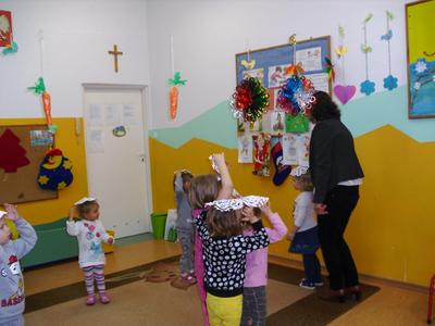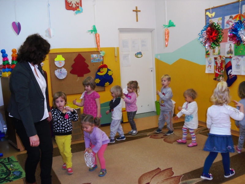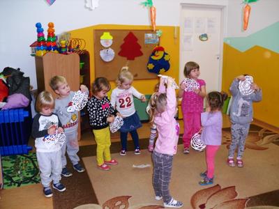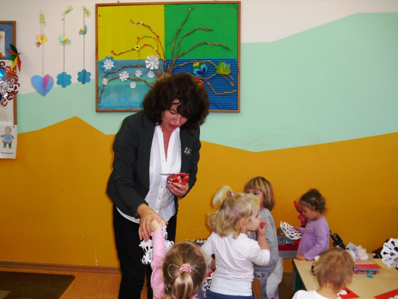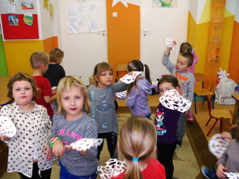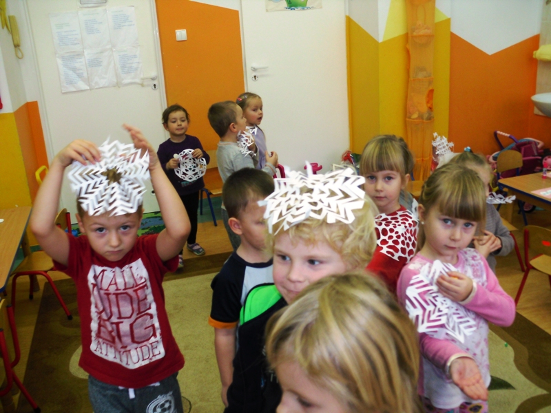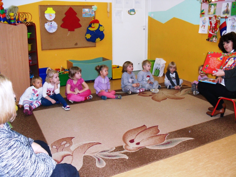 Inspiracją do działań 3-4-latków była dzisiaj nie tylko atmosfera zbliżających się Świąt Bożego Narodzenia, ale też odwiedziny pani bibliotekarki – z książką w roli głównej. Pani Beata, jak dobra wróżka przyśpieszyła nadejście zimy, a mikołajkowe słodycze były ukoronowaniem spotkania.
