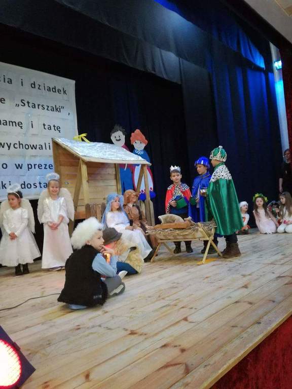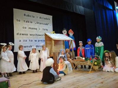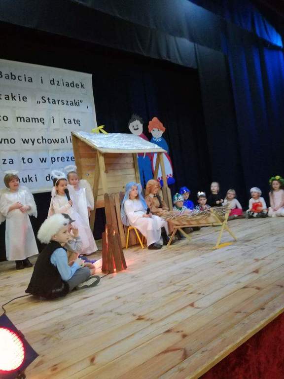 Przedszkolaki wprowadziły publiczność w świąteczny i radosny nastrój przedstawiając jasełka oraz wygłaszając wiersze i śpiewając piosenki dla swoich Babć i Dziadków.