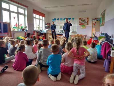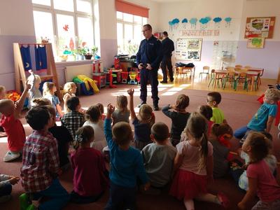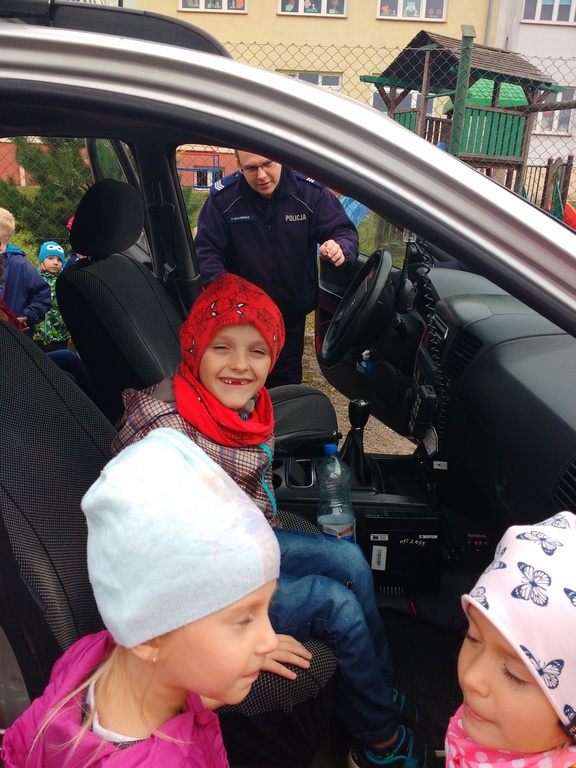 Spotkanie przebiegało w bardzo miłej atmosferze. Policjanci przybliżyli dzieciom zasady bezpiecznego poruszania się po drodze, zasady bezpieczeństwa podczas zabaw w ogrodzie przedszkolnym i w domu oraz zasady ograniczonego zaufania w stosunku do obcych. Przedszkolaki utrwaliły sobie ważne numer alarmowe i z zaciekawieniem słuchały cennych rad gościa na temat przewożenia dzieci.