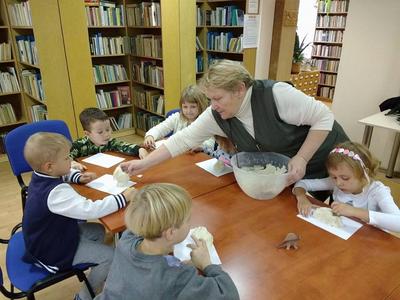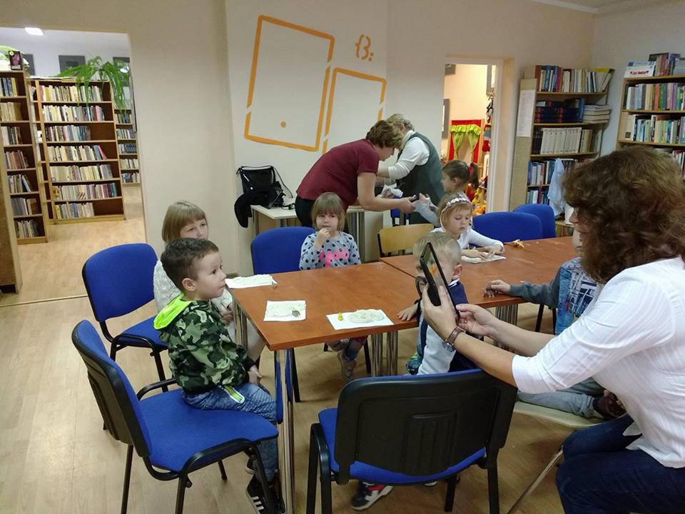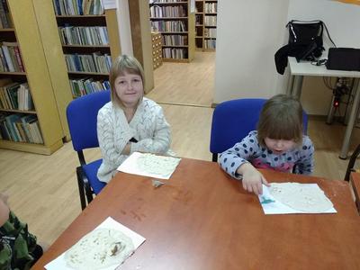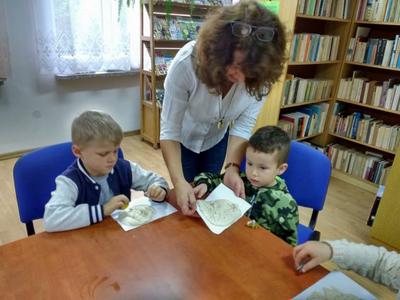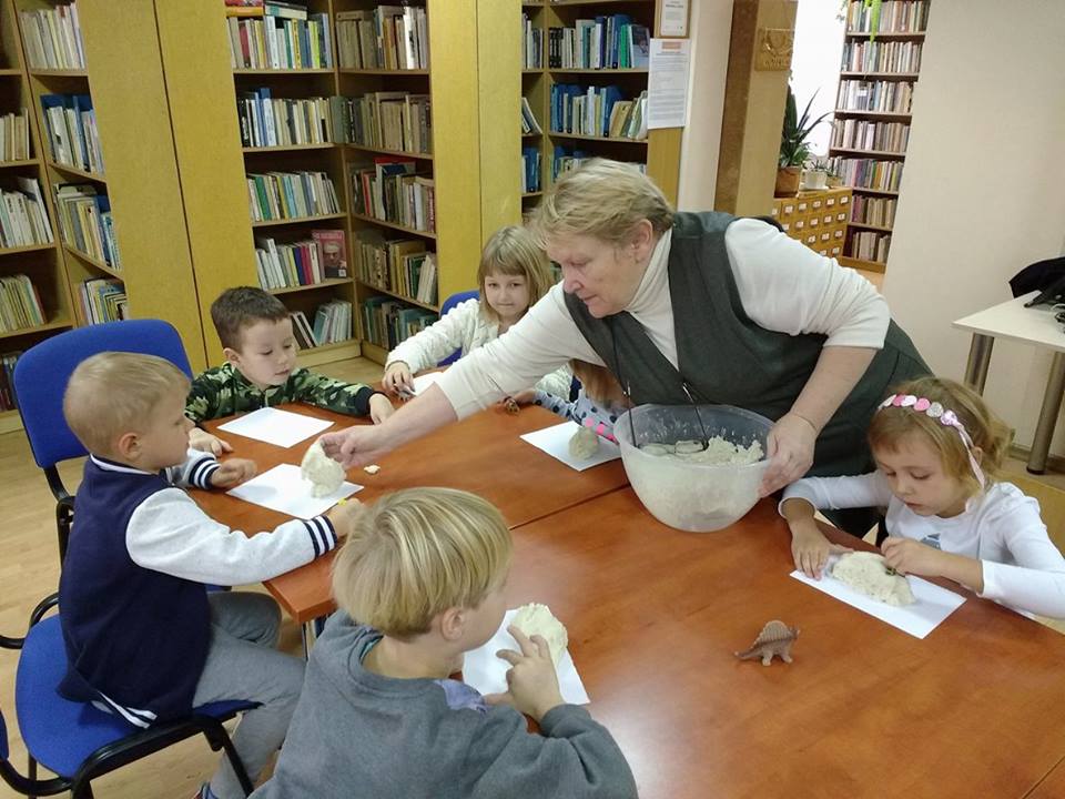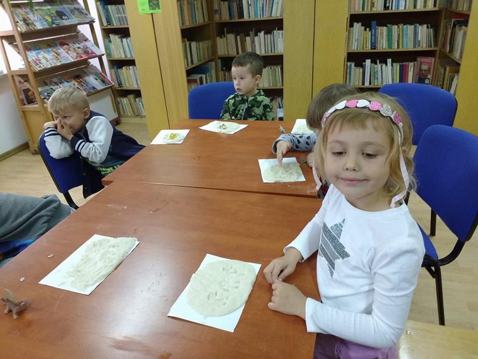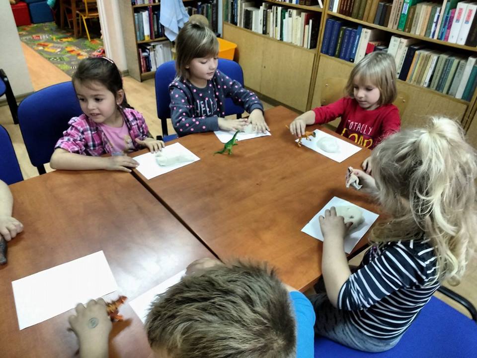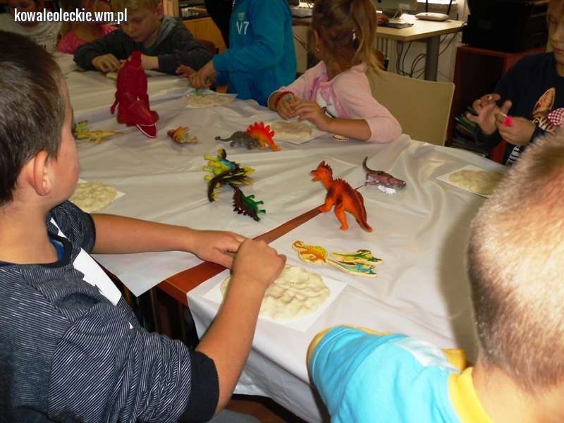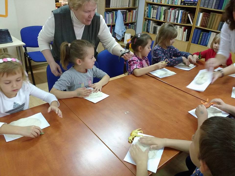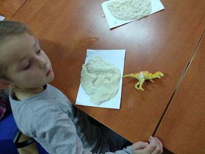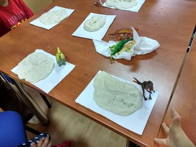 Odgłosy stworzeń, wzbudzały wśród słuchaczy okrzyki strachu lub wybuchy śmiechu i radości. Kolejnym i ostatnim już punktem spotkania była zabawa w małych paleontologów, którzy w masie solnej odciskali figurki dinozaurów albo ich ślady, a po umyciu rąk, robili zdjęcia z wybranymi gadami w aplikacji 4D.