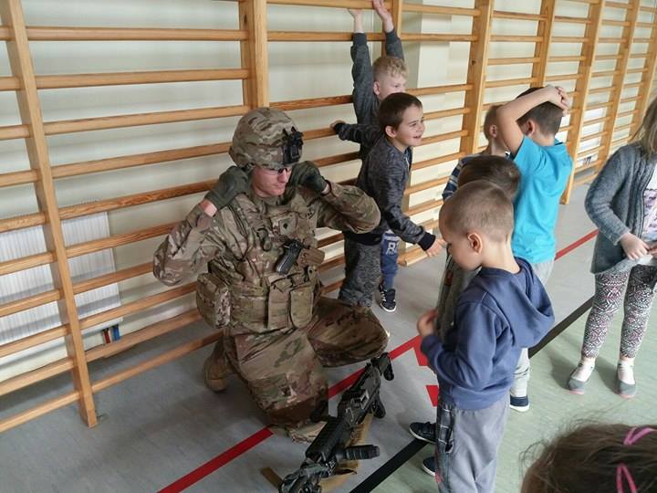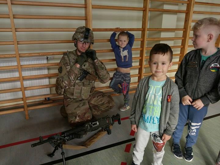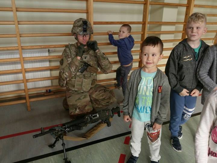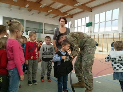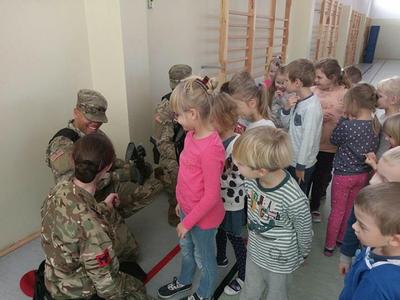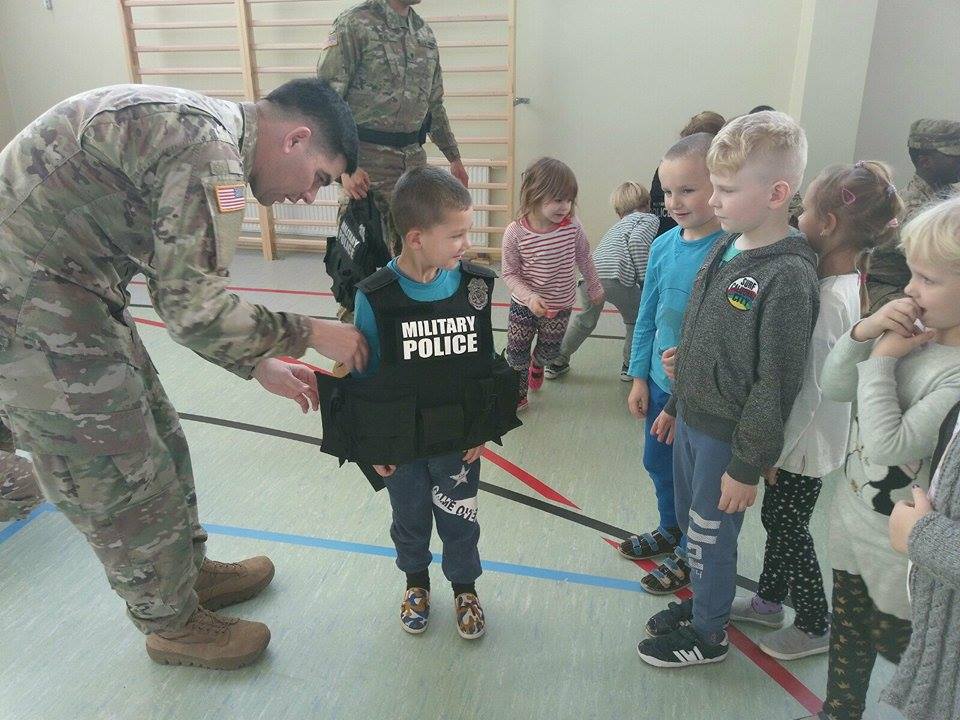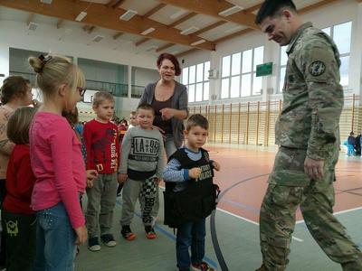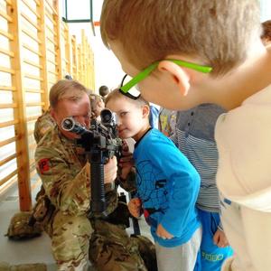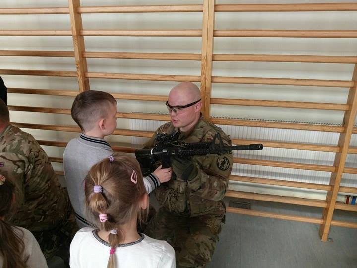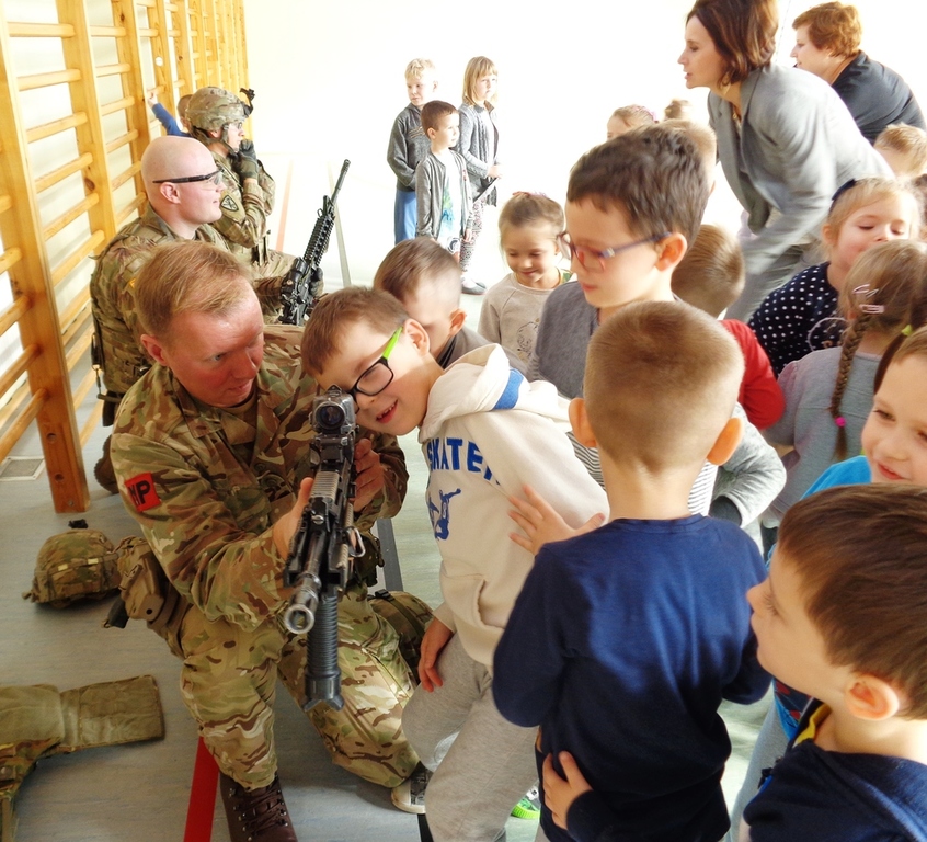 Spotkanie z żołnierzami amii Brytyjskiej oraz USA wywołały w dzieciach wielkie emocje i ogromne wrażenie. Żołnierze zaprezentowali przedszkolakom wyposażenie wykorzystywane w codziennej służbie. Dzieci miały okazję zobaczyć broń i przymierzyć kamizelkę czy hełm.