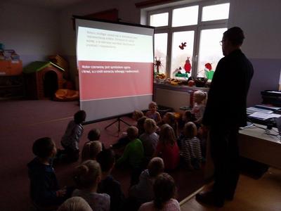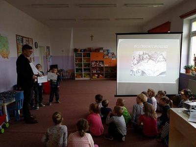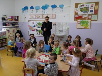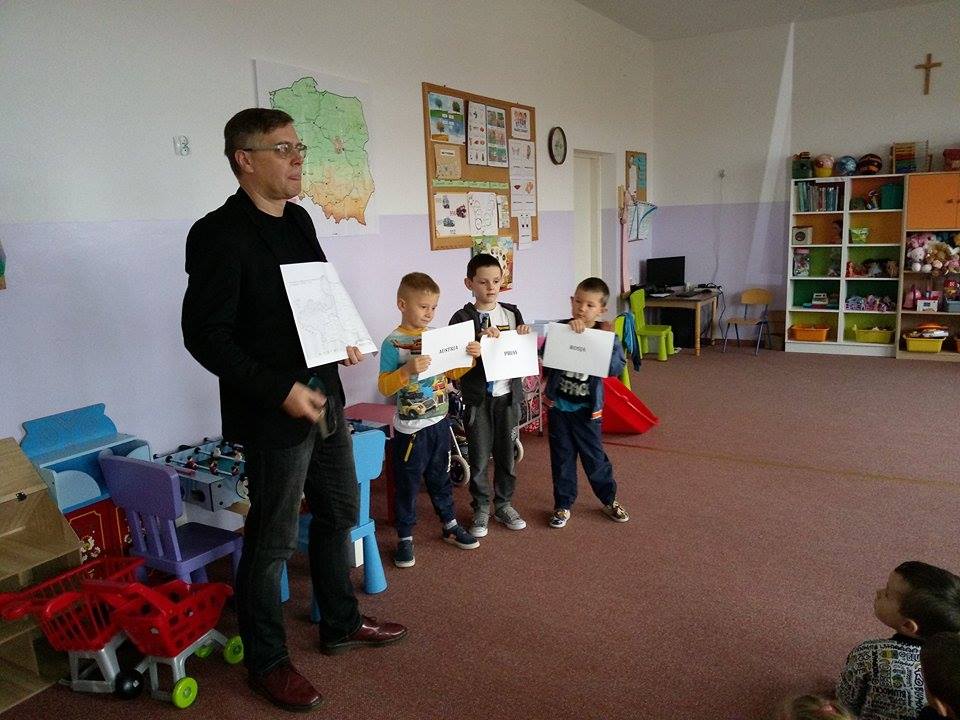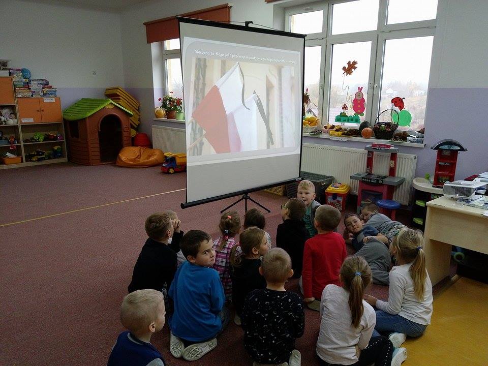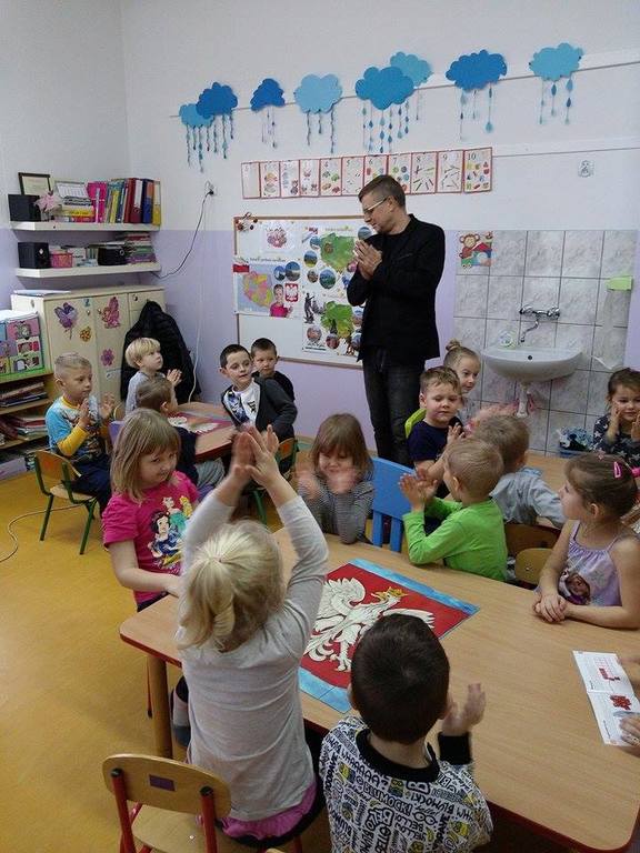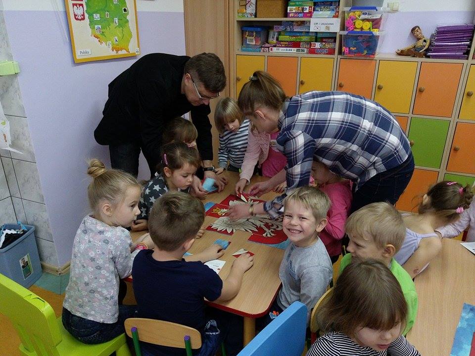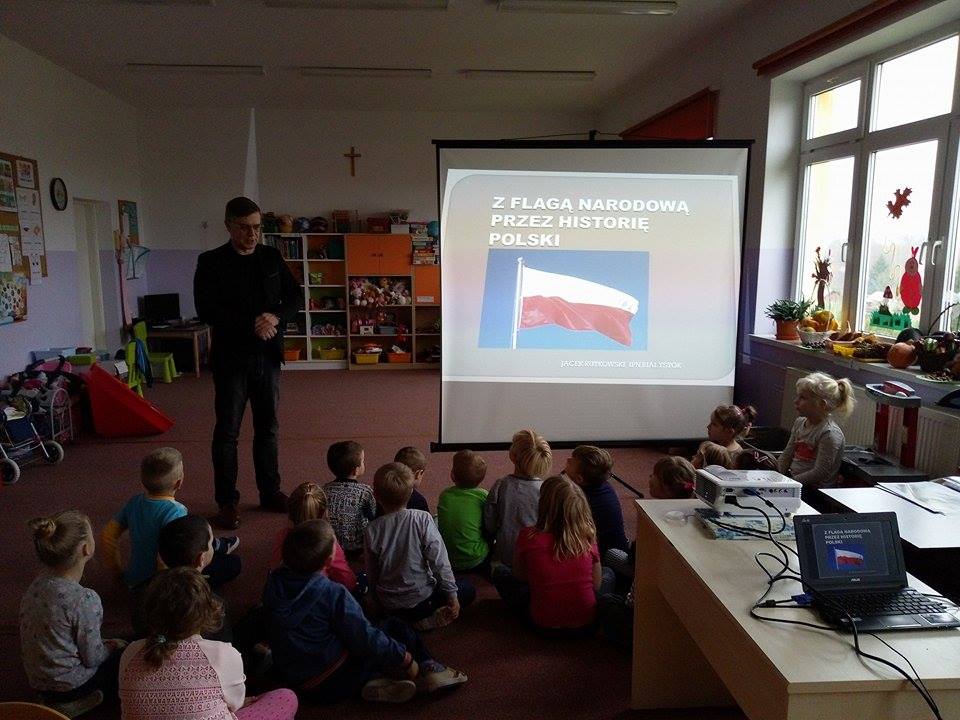 Już od najmłodszych lat uczymy dzieci patriotyzmu. Jednym z ważnych elementów tej nauki jest obchodzenie Dnia Niepodległości. W tym roku z tej okazji odwiedził nas mgr Jacek Rutkowski historyk, nauczyciel-konsultant W-M ODN w Olsztynie, który przeprowadził z przedszkolakami ”lekcje”. Dzieci dowiedziały się ciekawostek na temat historii naszego państwa, zobaczyły jak zmieniał się wygląd orła polskiego, poznały znaczenie świętowania Dnia Niepodległości oraz utrwaliły symbole narodowe.