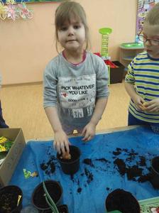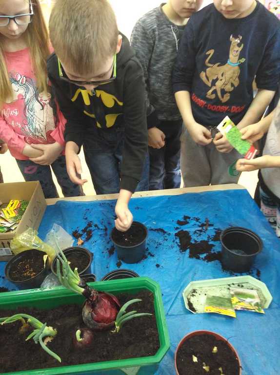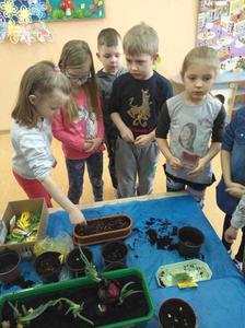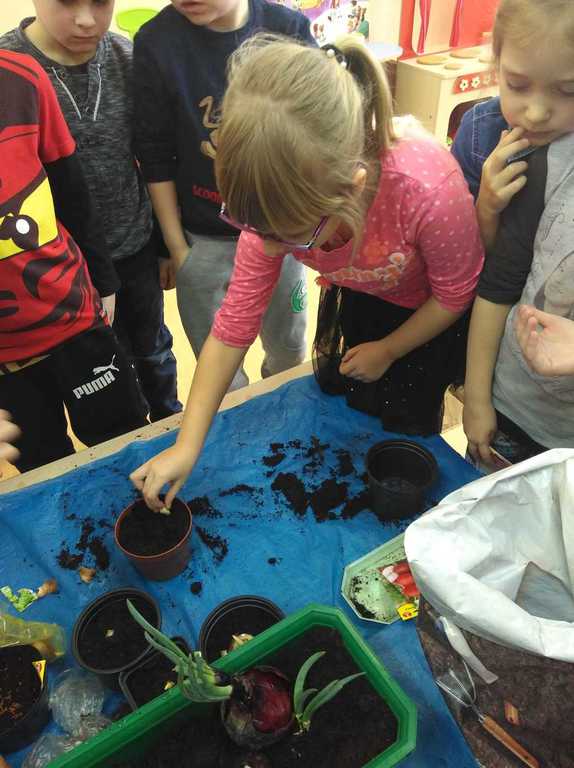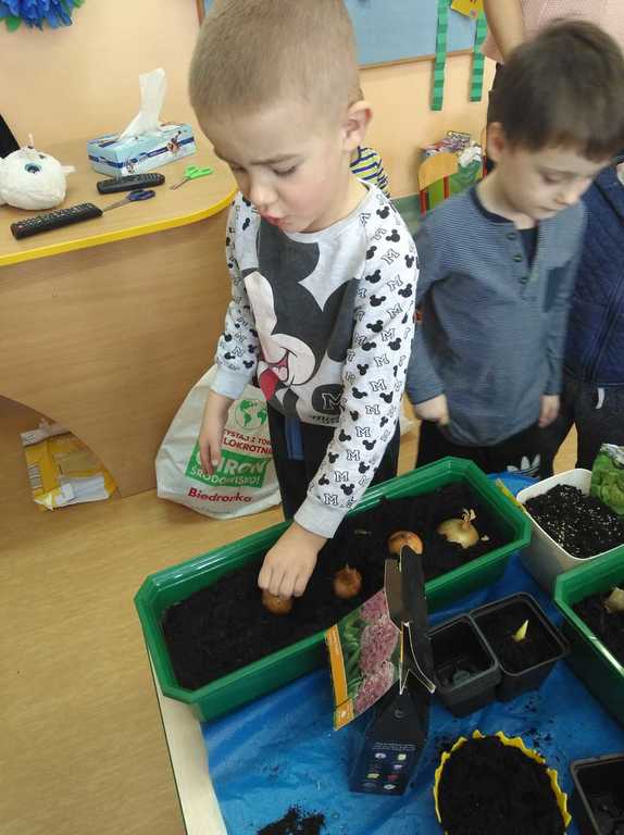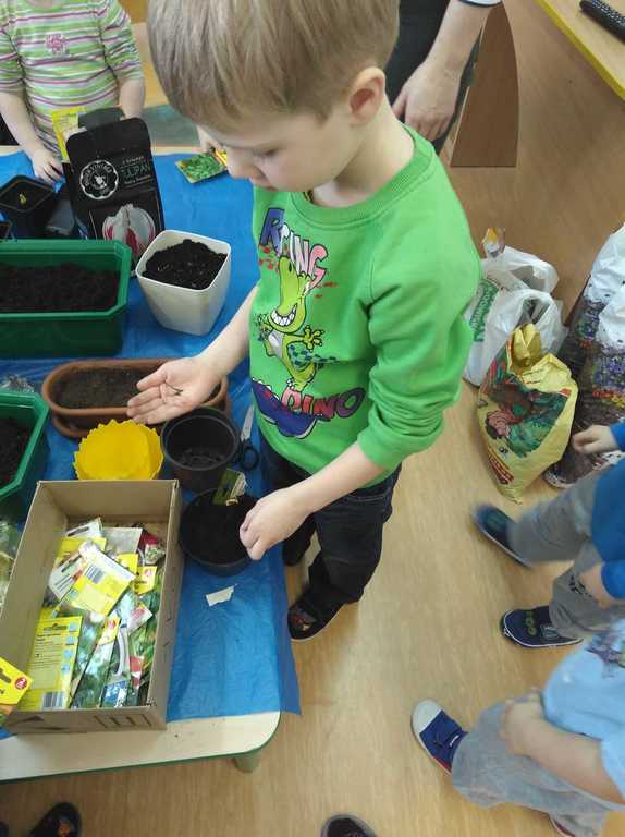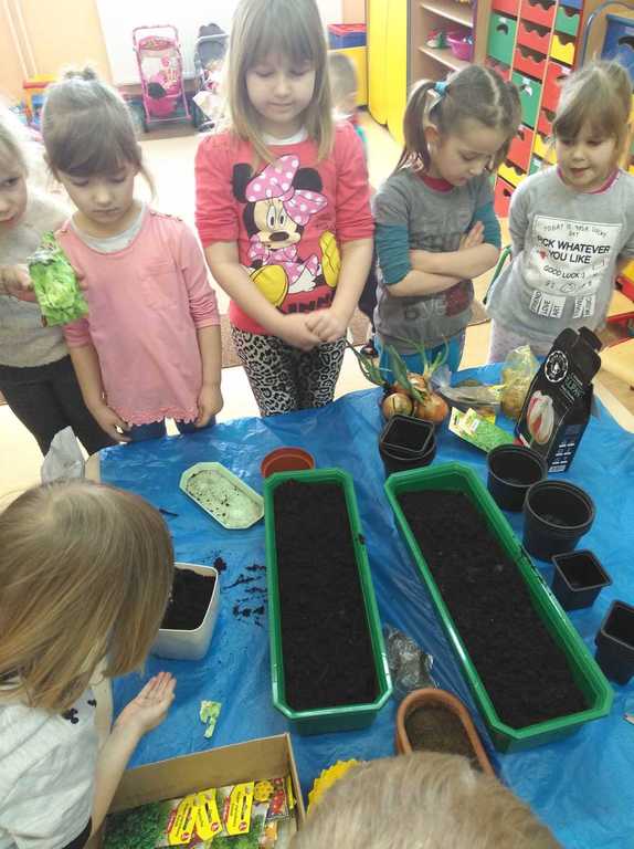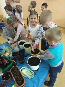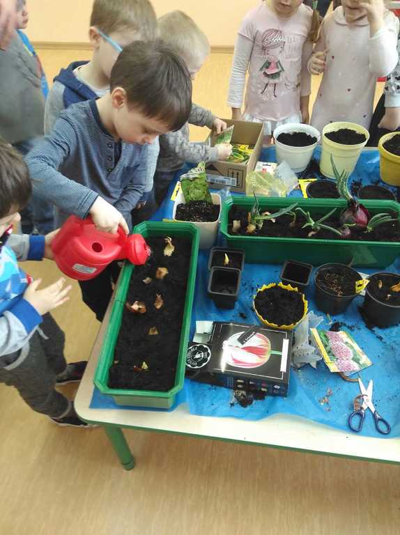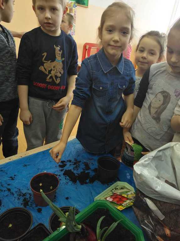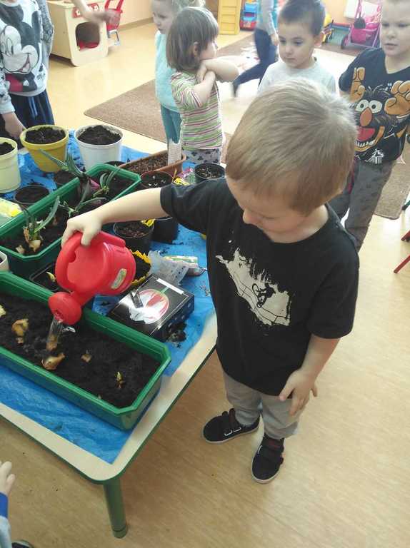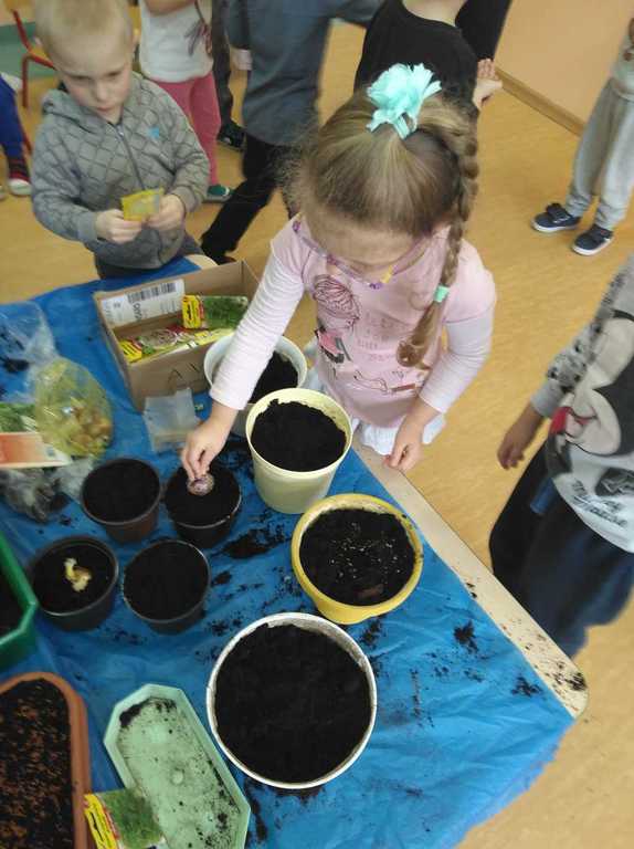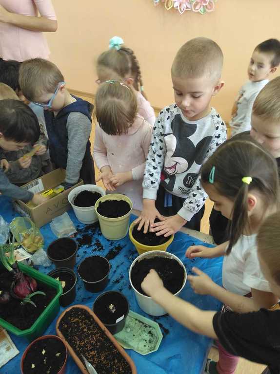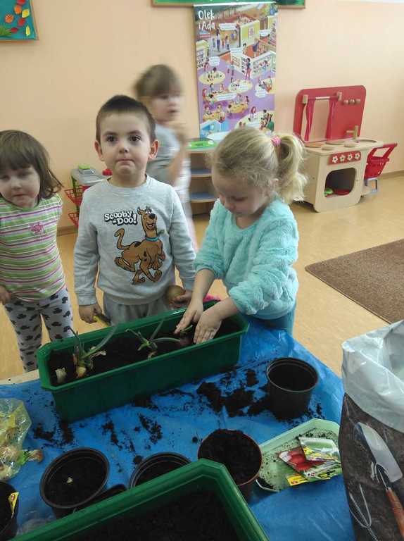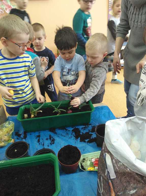 Podjęte przez nas czynności służą wprowadzeniu dzieci w obszar edukacji przyrodniczej oraz obserwacji rozwoju roślin. Praktyczne działanie jest jednym z najlepszych sposobów uczenia się, dzięki czemu dajemy dzieciom możliwość samodzielnego wykonania określonej czynności, a potem wyciągania wniosków na podstawie obserwacji. Nasze przedszkole daje dzieciom wiele okazji do kształtowania wrażliwości ekologicznej. Przedszkolaki wspólnymi siłami stworzyły wiosenny kąciki przyrody, który już niebawem ozdobi nasze przedszkole. Każda grupa zgromadziła materiały niezbędne do założenia kącika: skrzynki, doniczki, nasiona, ziemię. Jednak przed rozpoczęciem pracy dzieci dowiedziały się, czego potrzeba roślinom do prawidłowego wzrostu, jak należy o nie dbać. Po zdobyciu niezbędnej wiedzy oraz przygotowaniu miejsca pracy przedszkolaki były gotowe do wykonania zadania. Samodzielnie napełniały doniczki i skrzynki ziemią, aby później wrzucać do nich nasiona oraz cebulki. Następnie podlały swoje sadzonki i ustawiły je w wyznaczonym miejscu. Dla naszych podopiecznych był to dzień pełen wrażeń. Teraz wszyscy cierpliwie czekamy na efekty naszej pracy.