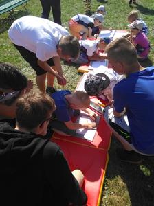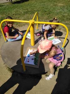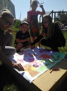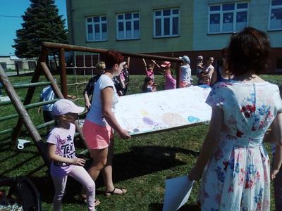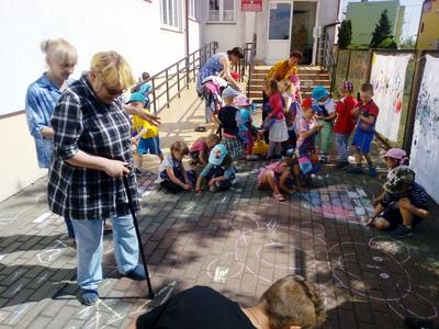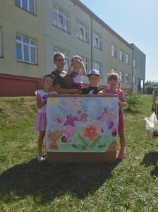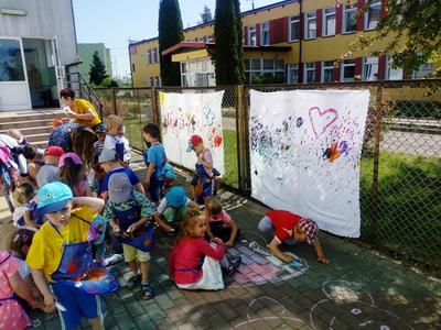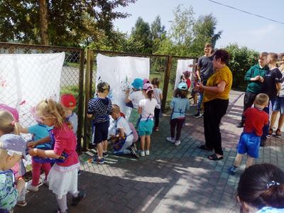 Ciąg dalszy innowacyjnej imprezy odbył się w piątek, 11 maja na przedszkolnym placu zabaw pod hasłem ,,Plener Literacko – Malarski”. Po wysłuchaniu zagadek literackich oraz wierszy o tematyce przyrodniczej i wiosennej przedszkolaki zmierzyły się ze swoimi plastycznymi możliwościami. Wspomagali ich w tym rodzice, młodzież gimnazjalna i opiekunowie. Dzieci starsze rysowały pastelami pod czujnym okiem pani plastyczki, a trzy- i czterolatki treści zawarte w utworach zamieniały w dzieła plastyczne farbami plakatowymi na dużych, białych płótnach za pomocą paluszków. Okazało się, że dzieci czuły niedosyt tej literacko- malarskiej zabawy i skorzystały z kredy, żeby ożywić kolorami przedszkolny chodnik.