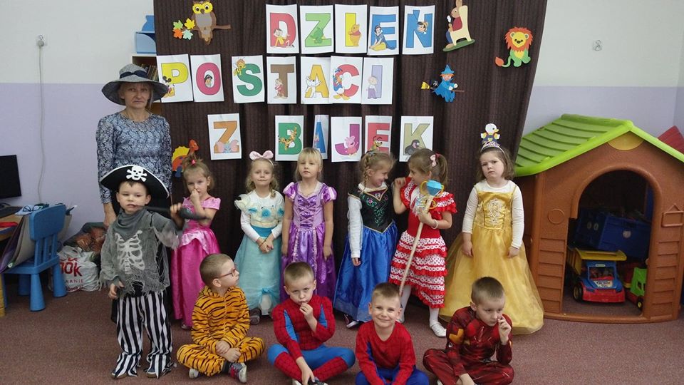 Okazało się jednak, że wszystkie postacie bardzo dobrze się znają i znalazły wspólny język podczas zabaw przy muzyce. Czerwony Kapturek bawił się z wilkiem, Baba Jaga z Jasiem i Małgosią, … Dzieci prezentowały swoje stroje, brały udział m.in. w ,, Konkursie na ,,Super Znawcę Bajek”, rozwiązując zagadki z ,,Wielkiej Księgi Zagadek” oraz w wielu innych zabawach. Za wspaniałą zabawę wszystkie postacie bajkowe otrzymały pamiątkowe medale: ,,Dzień Postaci z Bajek”.