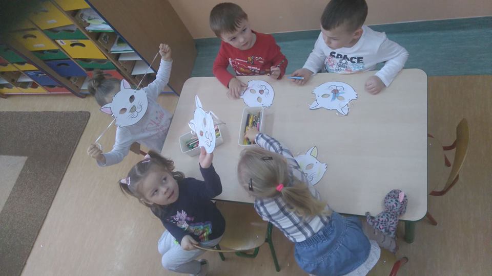 W poniedziałek, 18 lutego przedszkolaki obchodziły Dzień Kota, który był inspiracją do różnych zabaw. Dzieci opowiadały o swoich pupilach, a w zabawie muzyczno-ruchowej ,,My jesteśmy kotki dwa” pokazywały , gdzie kot ma oczy, uszy, wąsy, pazurki. Według własnego pomysłu kolorowały maskę kota i rysowały swoich ulubieńców, a inscenizacja wiersza Stanisława Jachowicza pt. ,,Chory kotek” inspirowała je do zabaw tematycznych. Dzieci utrwaliły wiedzę o kotach: czym się żywią, jak się bawią. Zwijały też włóczkę w kłębek, za którym koty lubią ganiać.