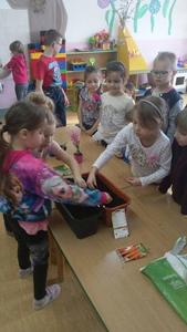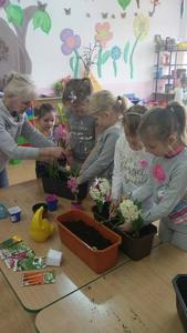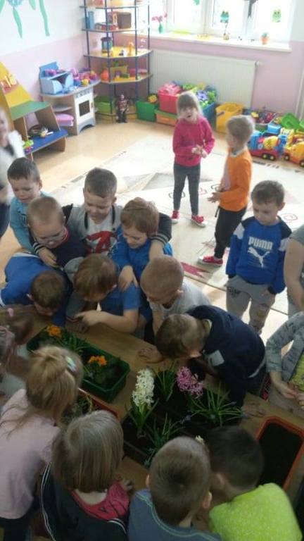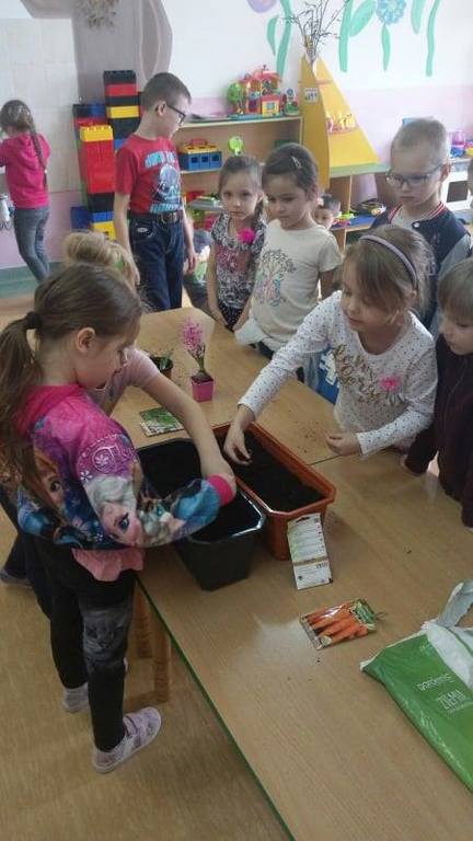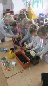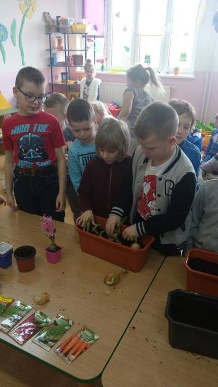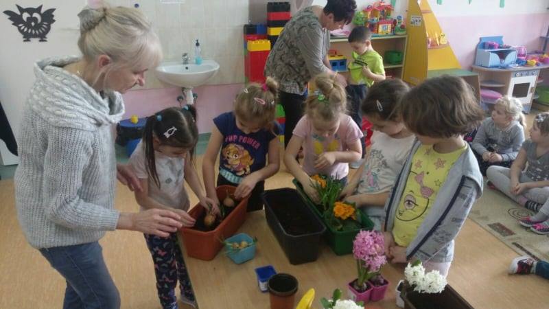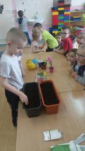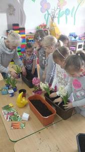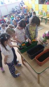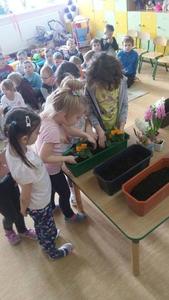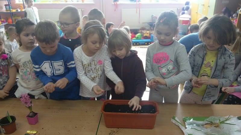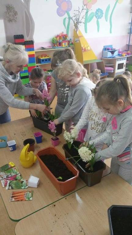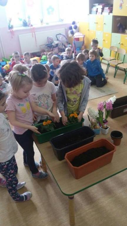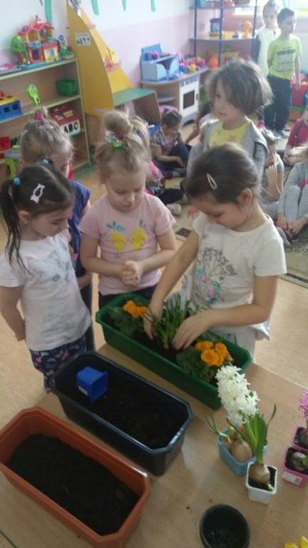 Podjęte przez nas czynności służą wprowadzeniu dzieci w obszar edukacji przyrodniczej oraz obserwacji rozwoju roślin. Praktyczne działanie jest jednym z najlepszych sposobów uczenia się, dzięki czemu dajemy dzieciom możliwość samodzielnego wykonania określonej czynności, a potem wyciągania wniosków na podstawie obserwacji. Nasze przedszkole daje dzieciom wiele okazji do kształtowania wrażliwości ekologicznej. Przedszkolaki wspólnymi siłami stworzyły wiosenny kąciki przyrody, który już niebawem ozdobi nasze przedszkole. Przed rozpoczęciem pracy dzieci dowiedziały się, czego potrzeba roślinom do prawidłowego wzrostu, jak należy o nie dbać. Po zdobyciu niezbędnej wiedzy oraz przygotowaniu miejsca pracy przedszkolaki były gotowe do wykonania zadania. Napełniały doniczki i skrzynki ziemią, aby później wrzucać do nich nasiona oraz cebulki. Następnie podlały swoje sadzonki i ustawiły je w wyznaczonym miejscu. Dla naszych podopiecznych był to dzień pełen wrażeń. Teraz wszyscy cierpliwie czekamy na efekty naszej pracy.