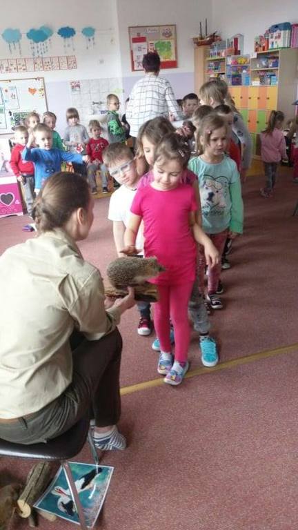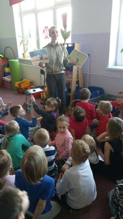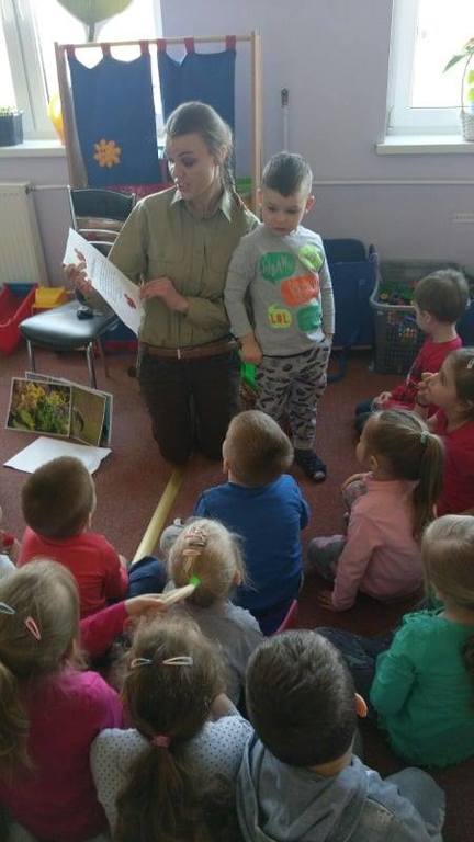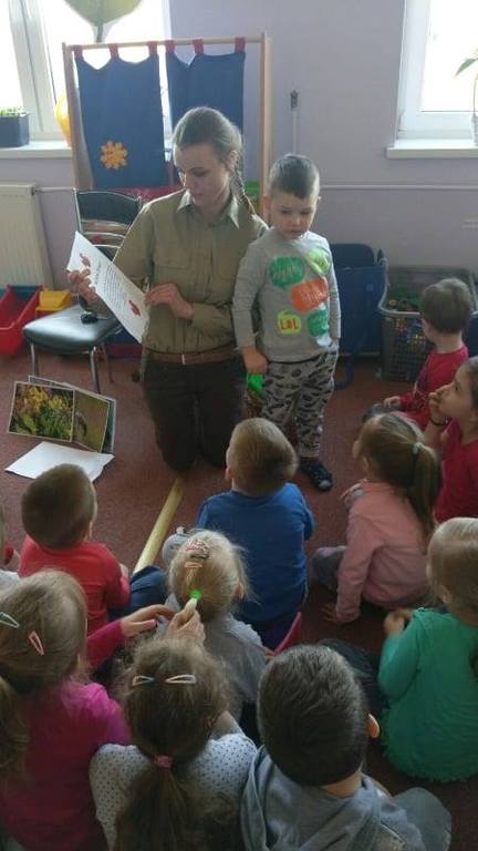 Na początku spotkania pani leśniczka zaprezentowała dzieciom swój mundur, a potem opowiedziała nam o swojej pracy oraz o mieszkańcach lasu. Podkreśliła, że człowiek jest gościem w lesie i musi szanować zwyczaje gospodarzy, czyli zwierząt w nim mieszkających. Podczas spotkania dzieci miały okazję poznać zwyczaje wybranych zwierząt zamieszkujących lasy naszej okolicy. Utrwaliły nazwy kwiatów i zwierząt zwiastujących wiosnę. Dowiedziały się wielu ciekawostek z życia zwierząt leśnych. Dziękujemy za odwiedzenie naszego przedszkola i zapraszamy ponownie Panią leśniczkę.