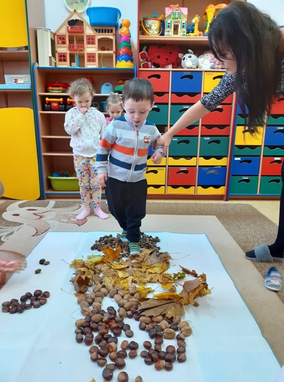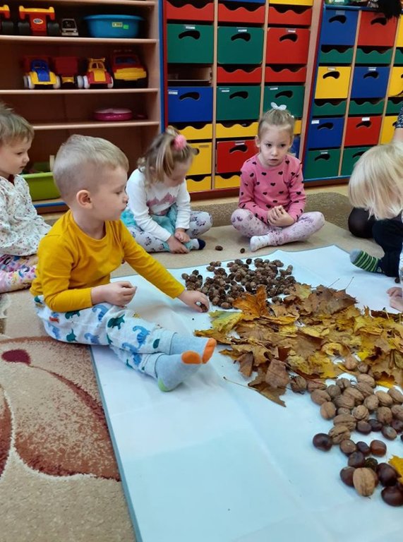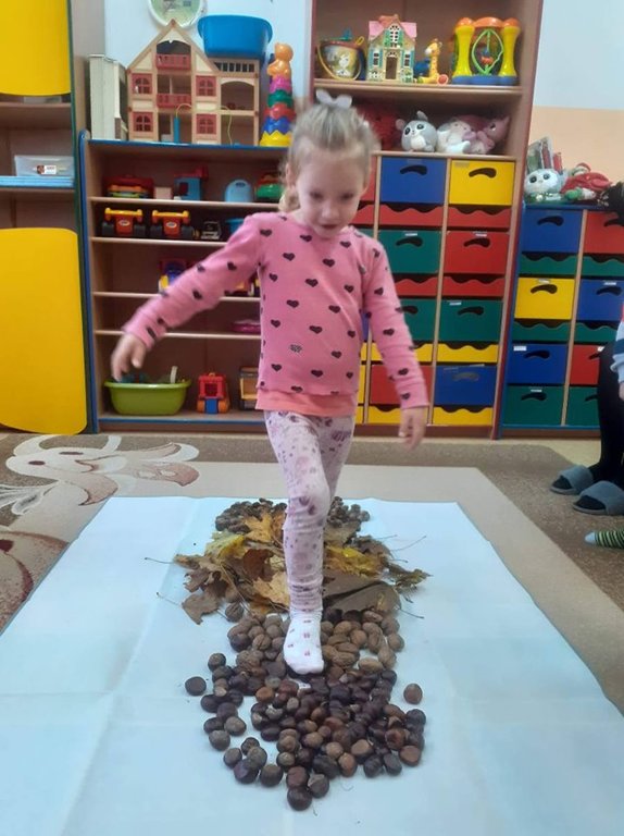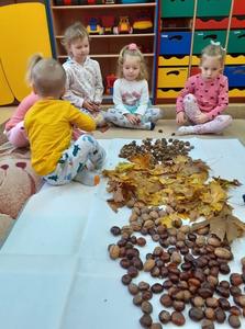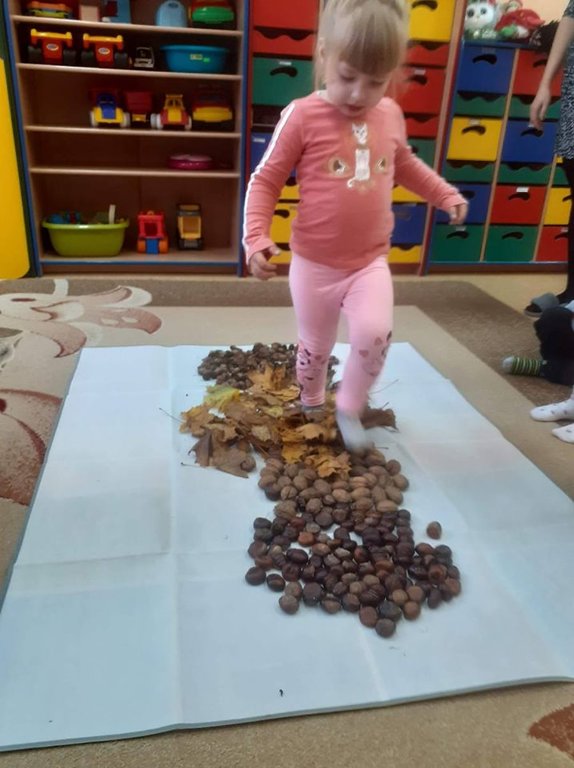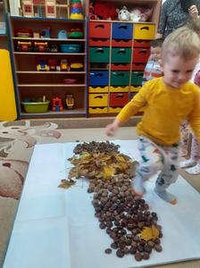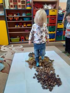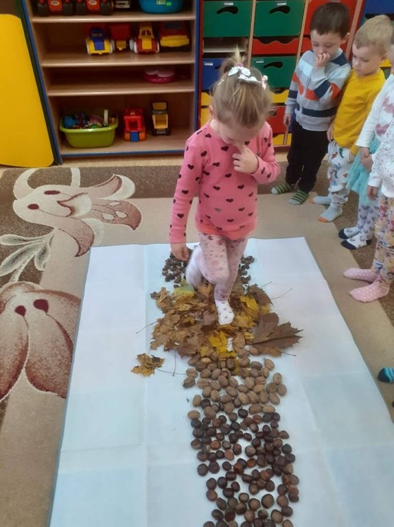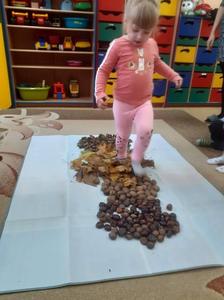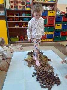 ,,Krasnoludki" pokonują ścieżkę sensoryczną, oraz uczą się rozpoznawać i liczyć jesienne dary lasu.