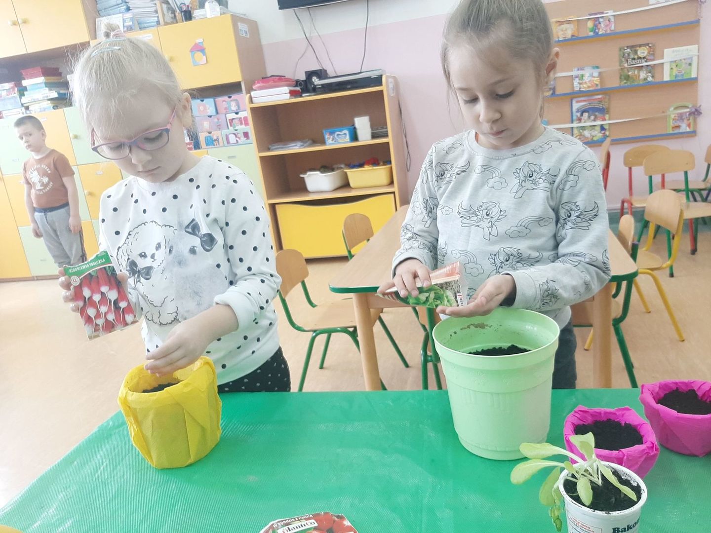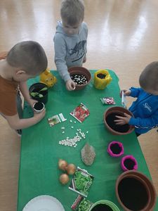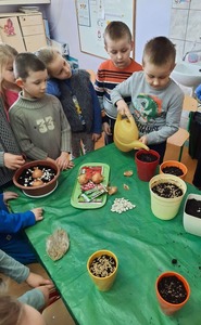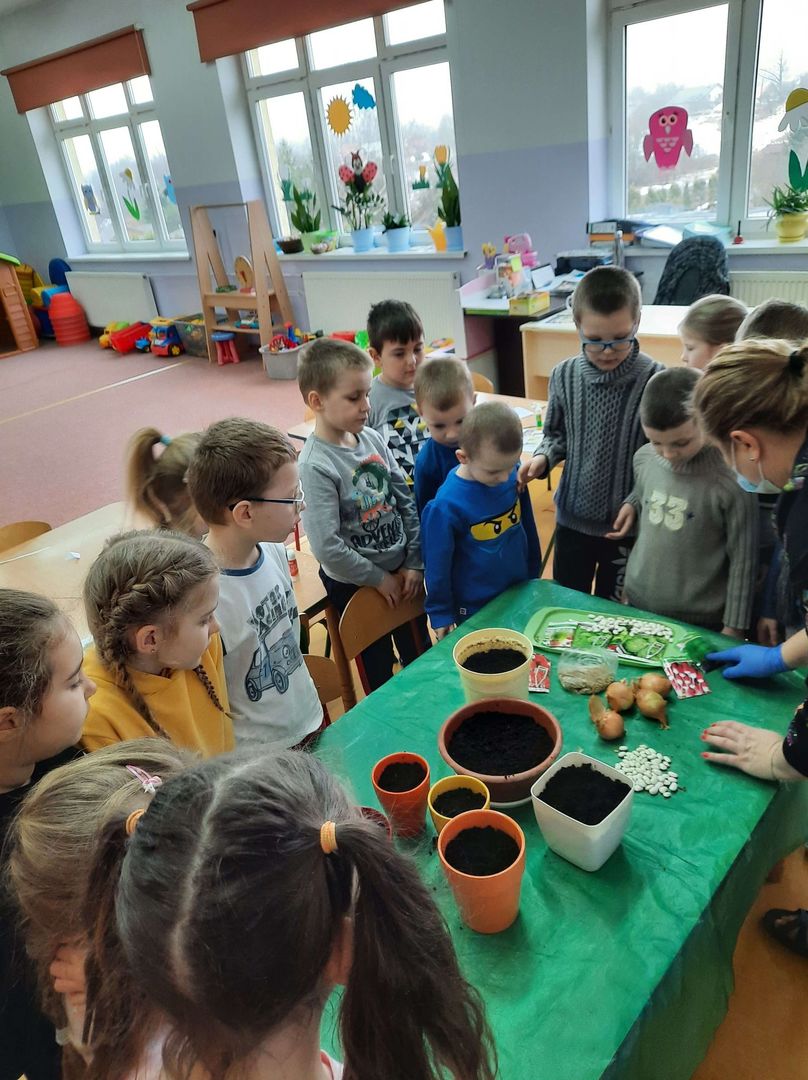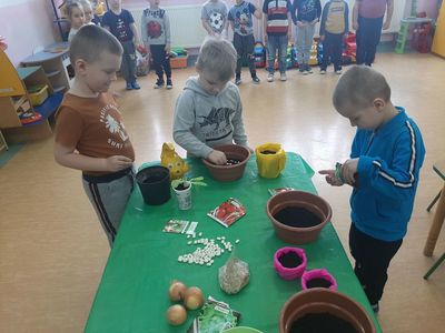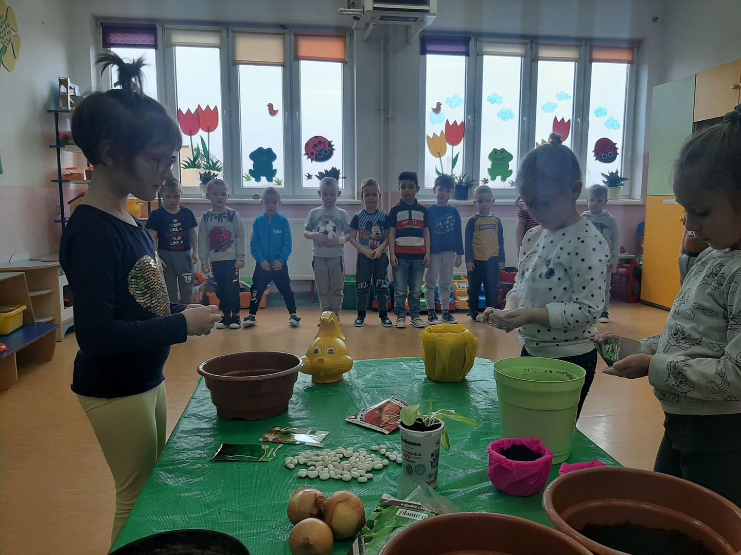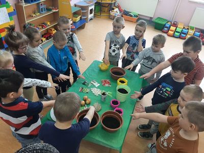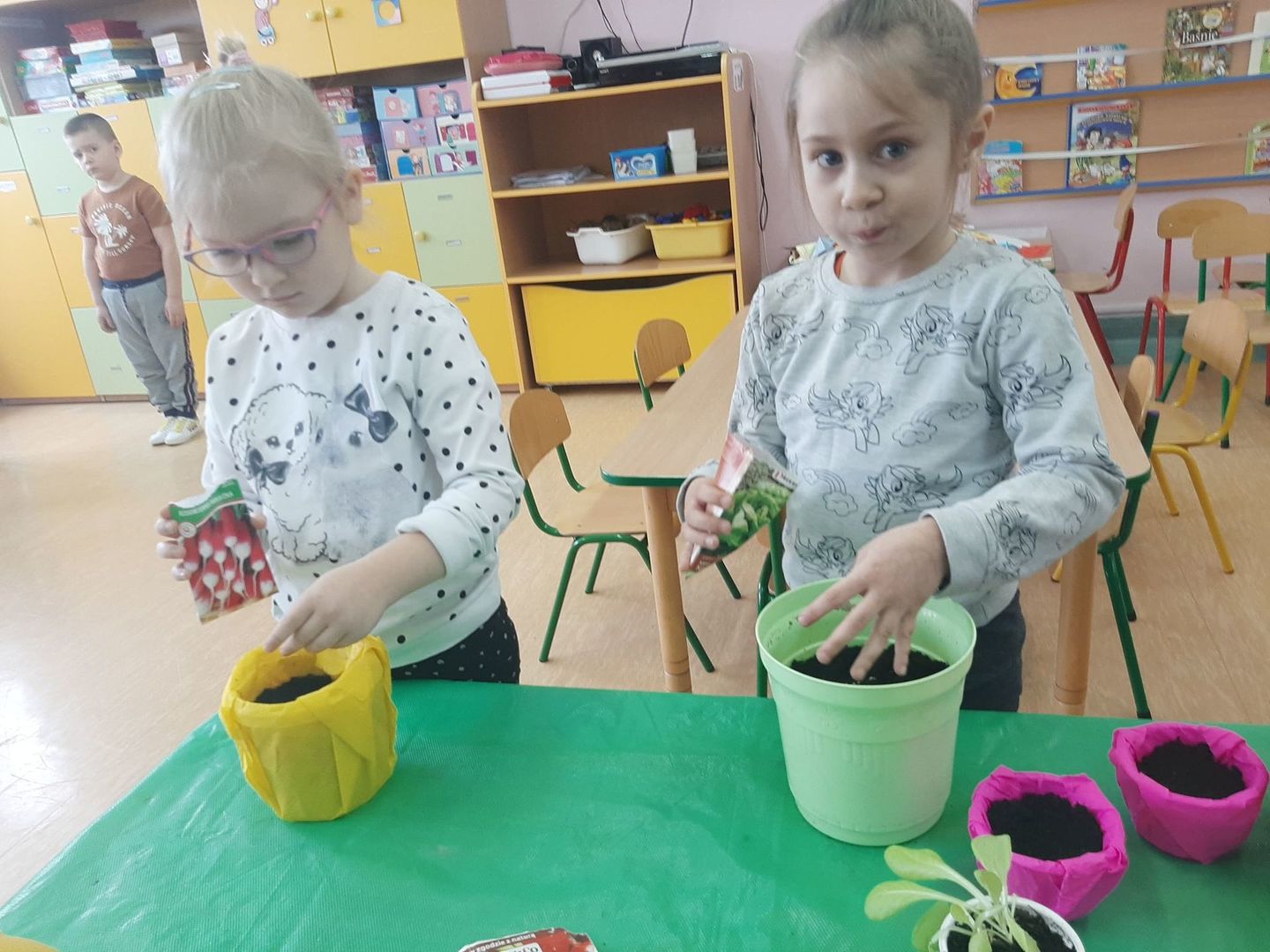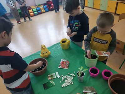 Siejemy, sadzimy i obserwujemy :) Bawimy się w ogrodników, dowiadujemy się, jak należy przygotować podłoże, jak sadzić cebulki, a jak siać nasiona, a także jak podlewać i dbać o nasze warzywa: szczypiorek, sałatę, rzodkiewkę.