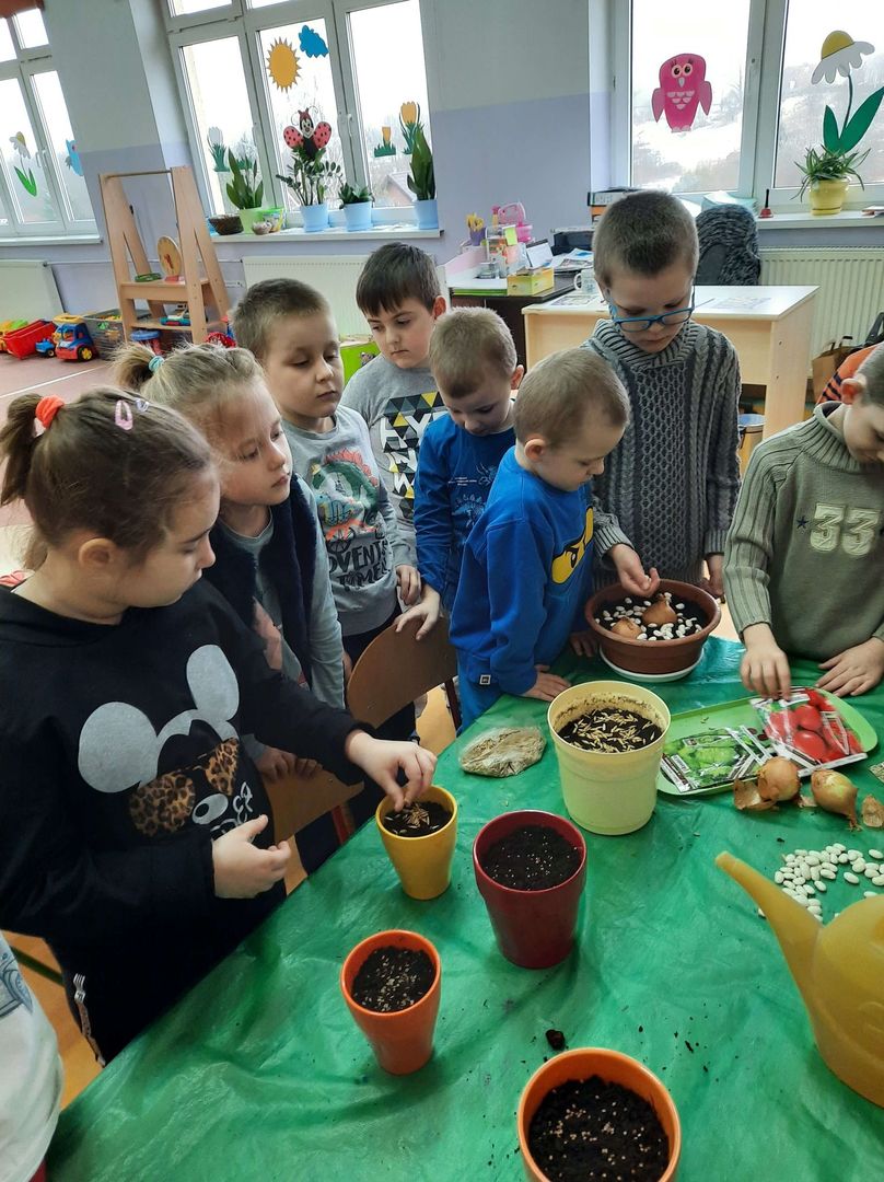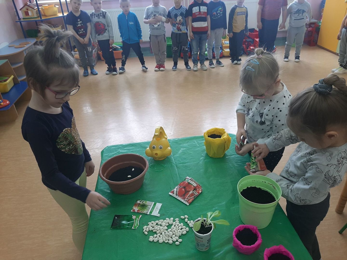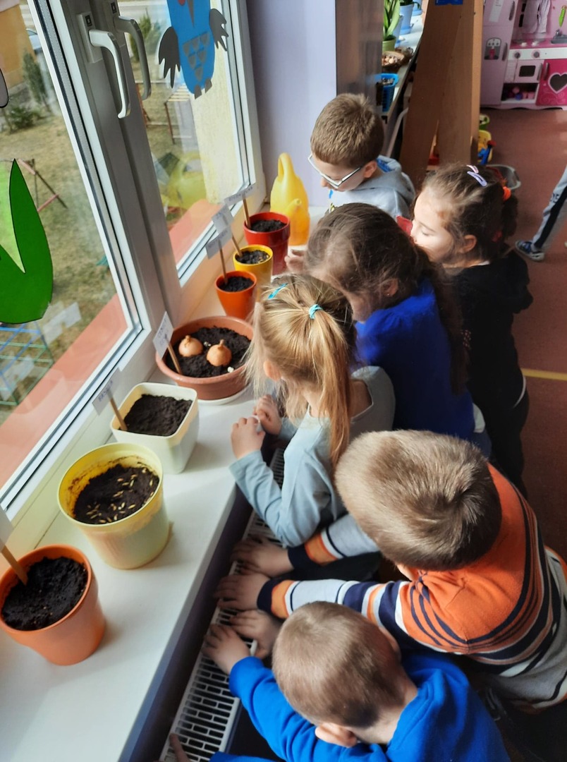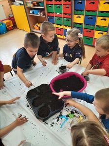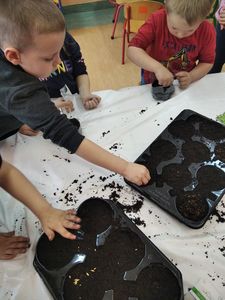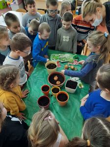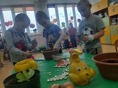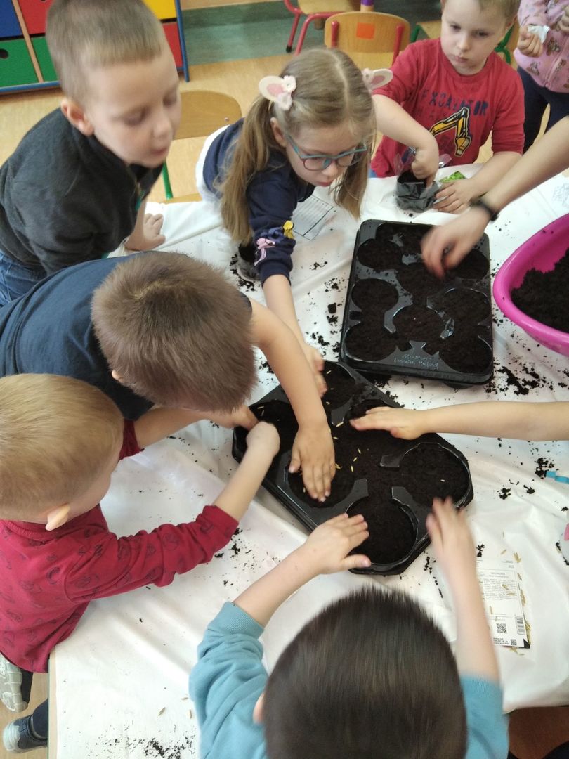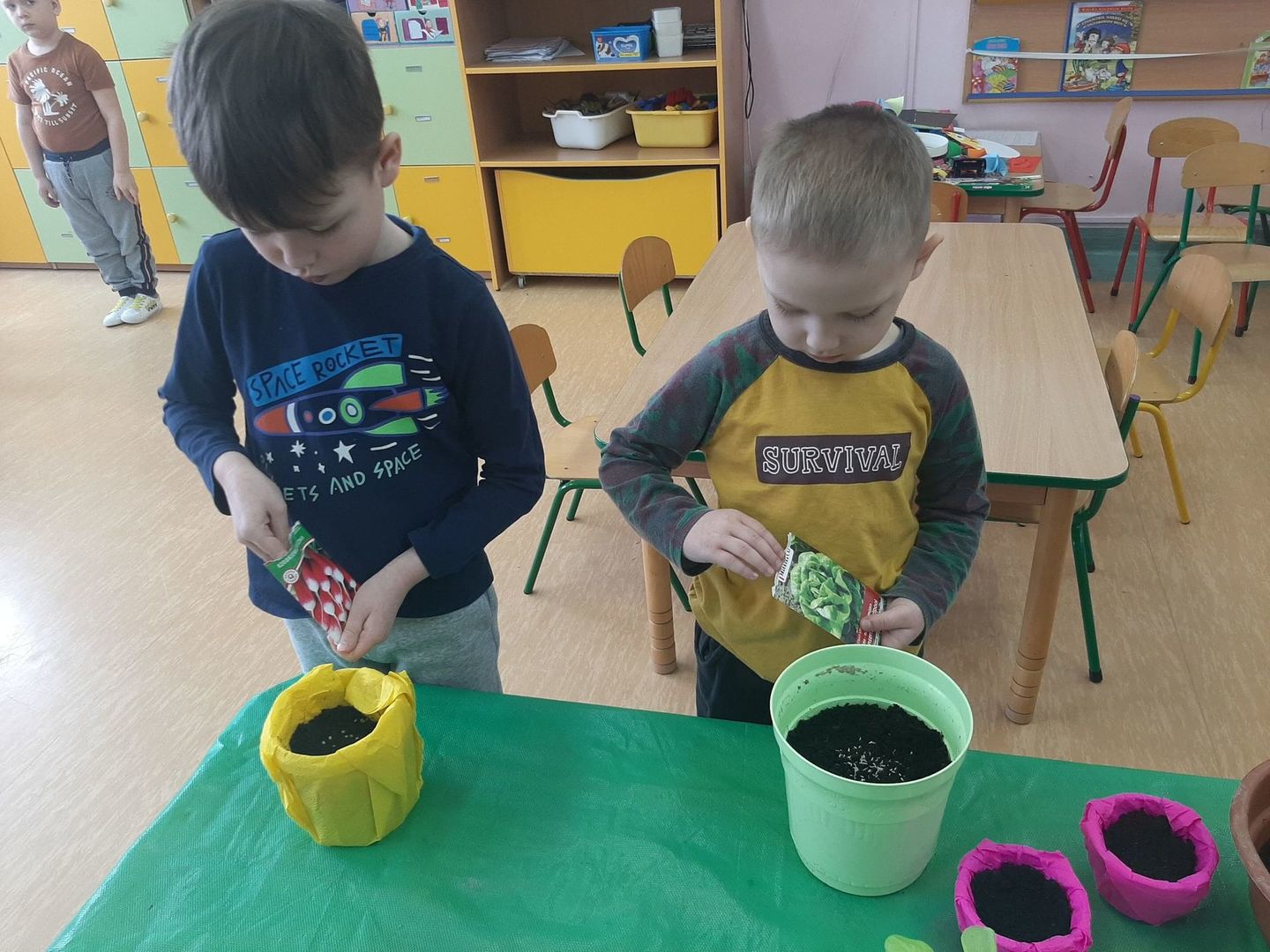 Siejemy, sadzimy i obserwujemy :) Bawimy się w ogrodników, dowiadujemy się, jak należy przygotować podłoże, jak sadzić cebulki, a jak siać nasiona, a także jak podlewać i dbać o nasze warzywa: szczypiorek, sałatę, rzodkiewkę.