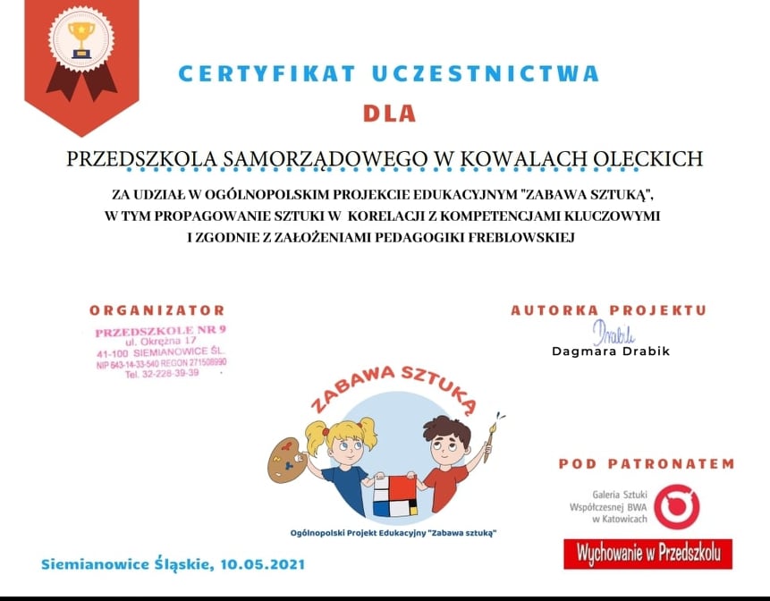 Podczas realizacji zajęć dzieci miały okazje do aktywności w procesie zabawy. Zapoznały się z wybranymi dziełami i ich twórcami. Poznały różnorodne technikami plastyczne. Rozwinęły poczucia estetyki i wrażliwości na piękno poprzez udział w wystawach i prezentacjach zbiorowych poprzez łącze Internetowe. Miały okazję doskonalenia umiejętności swobodnej wypowiedzi, w tym wyrażania odczuć związanych z odbiorem sztuki. Doskonaliły myślenie i postrzeganie matematyczne do rozwiązywania problemów codziennych w sytuacjach związanych z wykorzystaniem edukacji przez sztukę. Kształtowały orientację przestrzenną. Rozwijały zainteresowania światem przyrody poprzez wykorzystywanie dzieł sztuki.