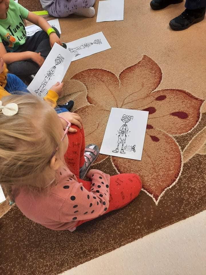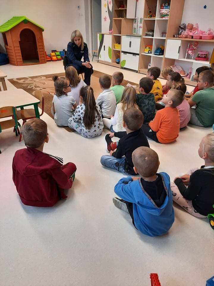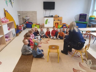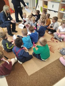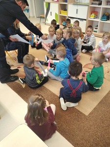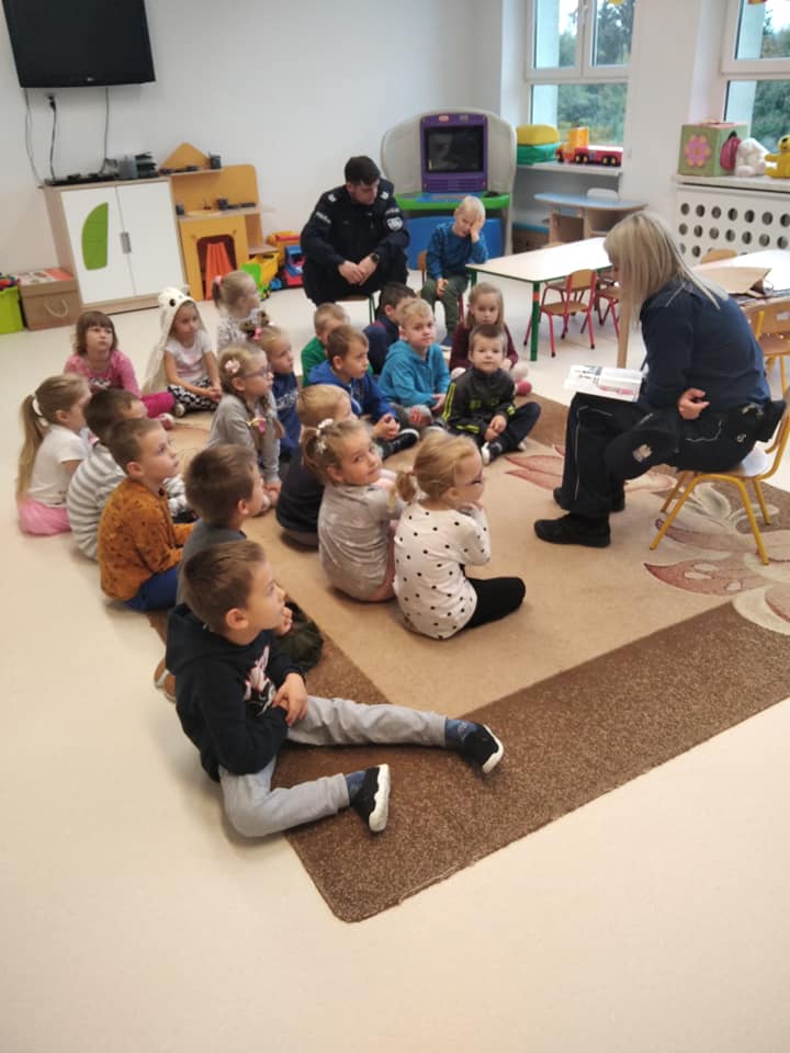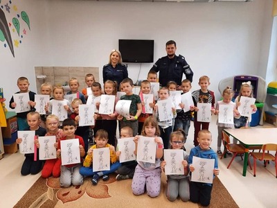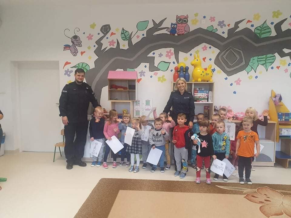Jak na wrzesień przystało, Policjanci odwiedzili nasze przedszkole. Rozmawiali z dziećmi na poważne tematy, a mianowicie: o bezpiecznej zabawie, zasadach poruszania się po drodze. Zwrócili uwagę na korzystanie z fotelików oraz pasów bezpieczeństwa podczas jazdy samochodem. Funkcjonariusze wręczyli przedszkolakom elementy odblaskowe oraz kolorowanki.