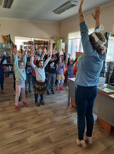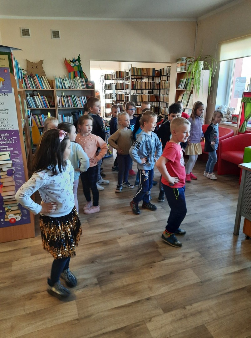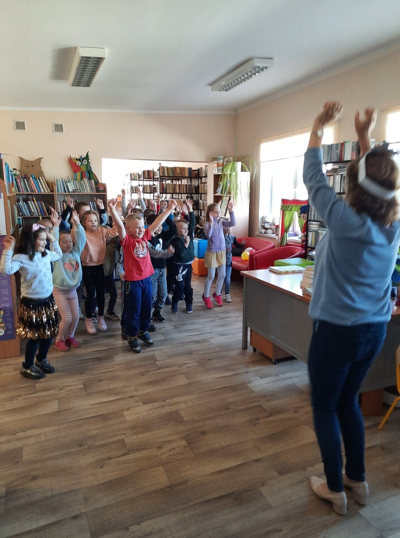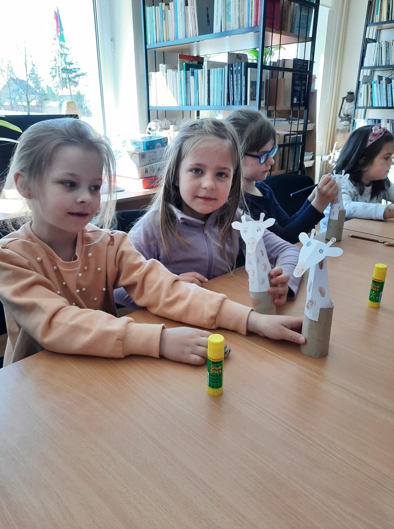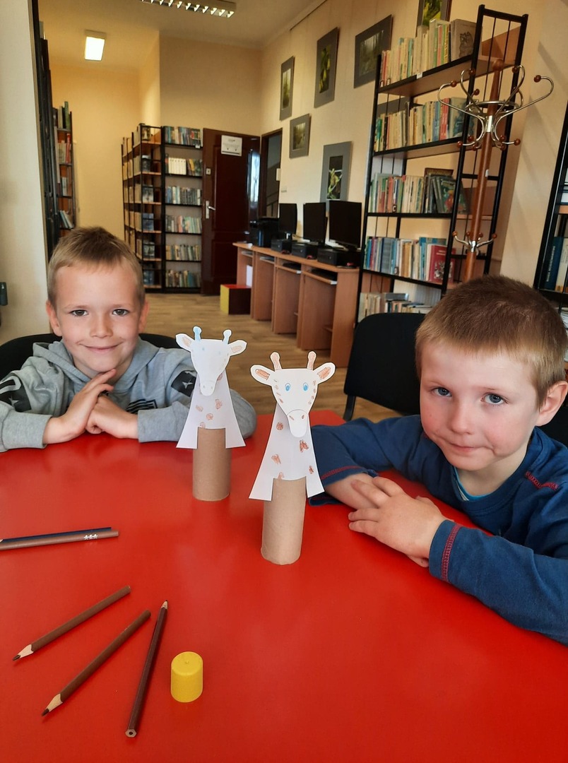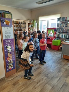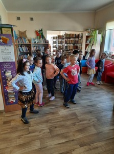 Dzieci złożyły życzenia dla Pani Beaty, która za każdym razem gdy przychodzimy do biblioteki zaskakuje nas nowymi opowieściami i zajęciami. Tym razem przeczytała dzieciom bardzo ciekawą książkę ,,Żyrafy nie umieją tańczyć". Przedstawiła historię Gerarda, która może stać się pretekstem do rozmów z dziećmi na temat pewności siebie oraz samoakceptacji.