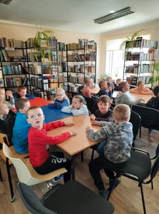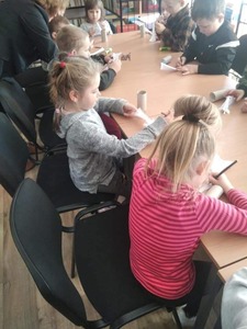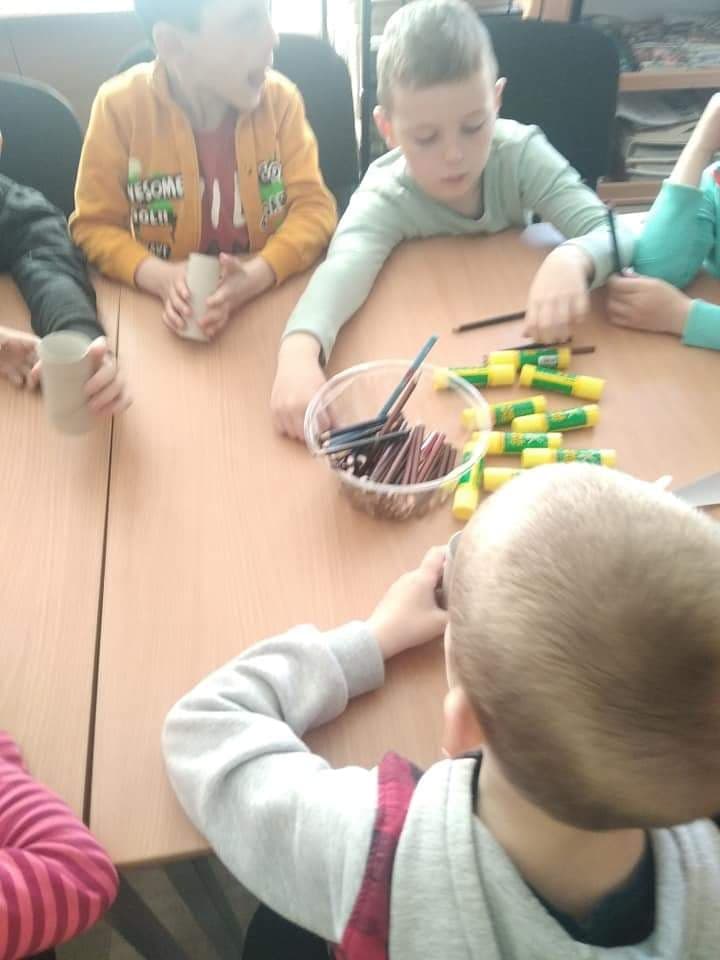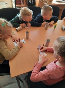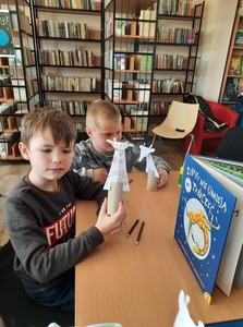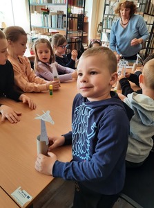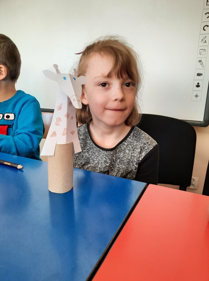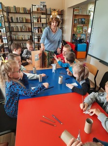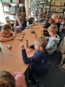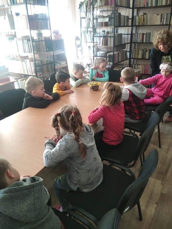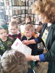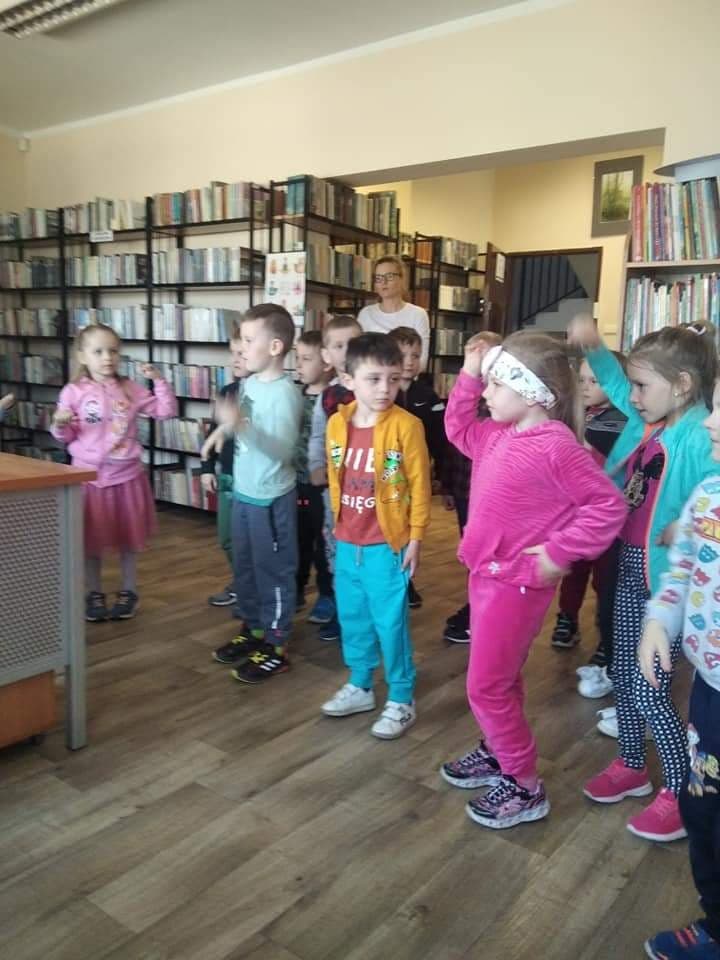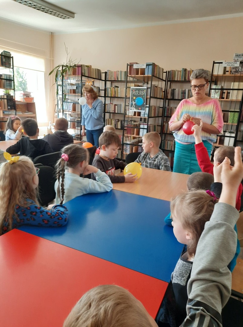 Dzieci złożyły życzenia dla Pani Beaty, która za każdym razem gdy przychodzimy do biblioteki zaskakuje nas nowymi opowieściami i zajęciami. Tym razem przeczytała dzieciom bardzo ciekawą książkę ,,Żyrafy nie umieją tańczyć". Przedstawiła historię Gerarda, która może stać się pretekstem do rozmów z dziećmi na temat pewności siebie oraz samoakceptacji.