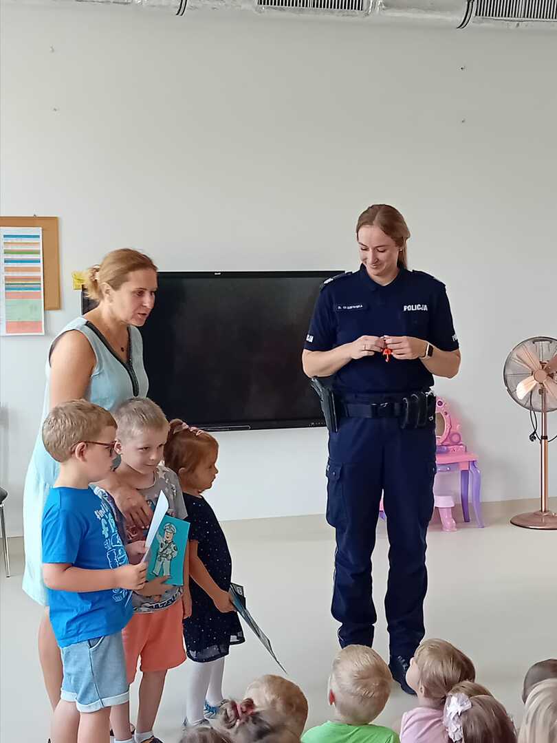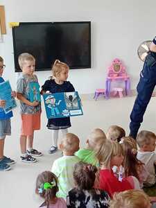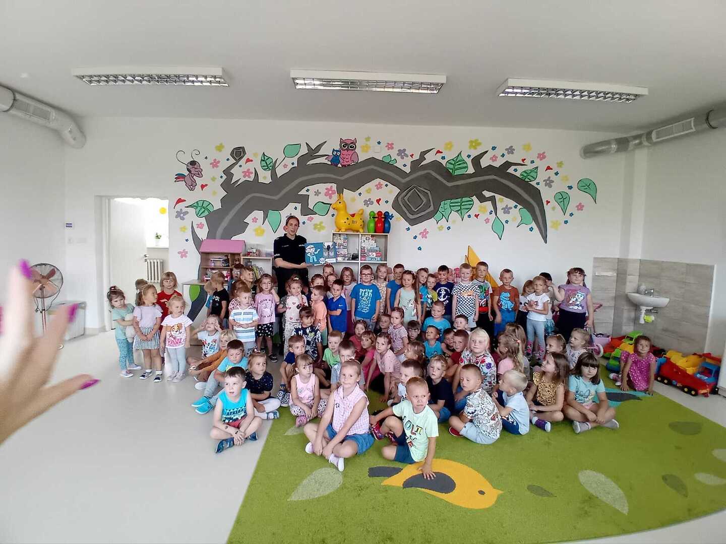 We wrześniu w naszym przedszkolu rozpoczął się cykl zajęć związanych z bezpieczeństwem na drodze. Dzieci zapoznawały się z elementarnymi zasadami ruchu drogowego. Na pobliskim skrzyżowaniu, ubrane w kamizelki odblaskowe, uczyły się poprawnego przechodzenia przez jezdnię. Dzisiaj nasze przedszkole odwiedziła Pani Policjantka, która wprowadziła przedszkolaków w perspektywę postrzegania róznorakiego bezpieczeństwa.