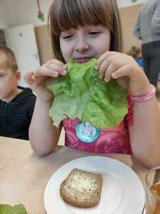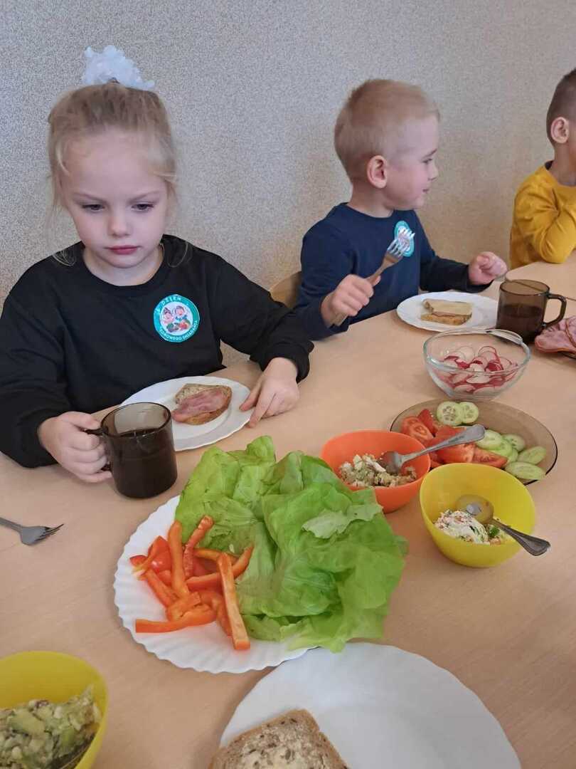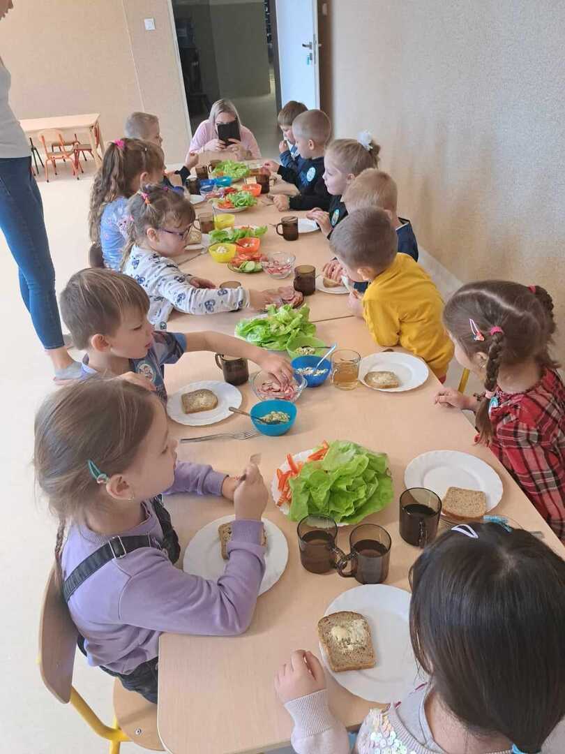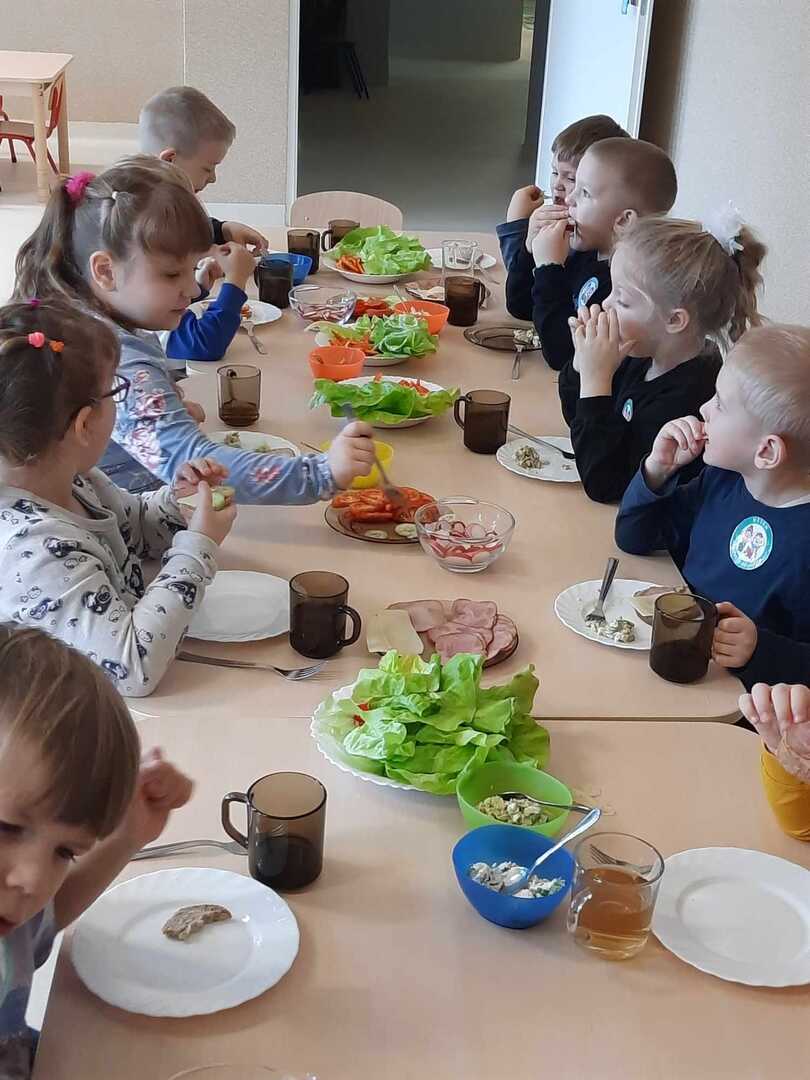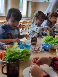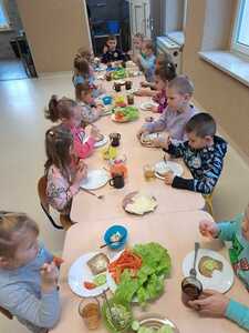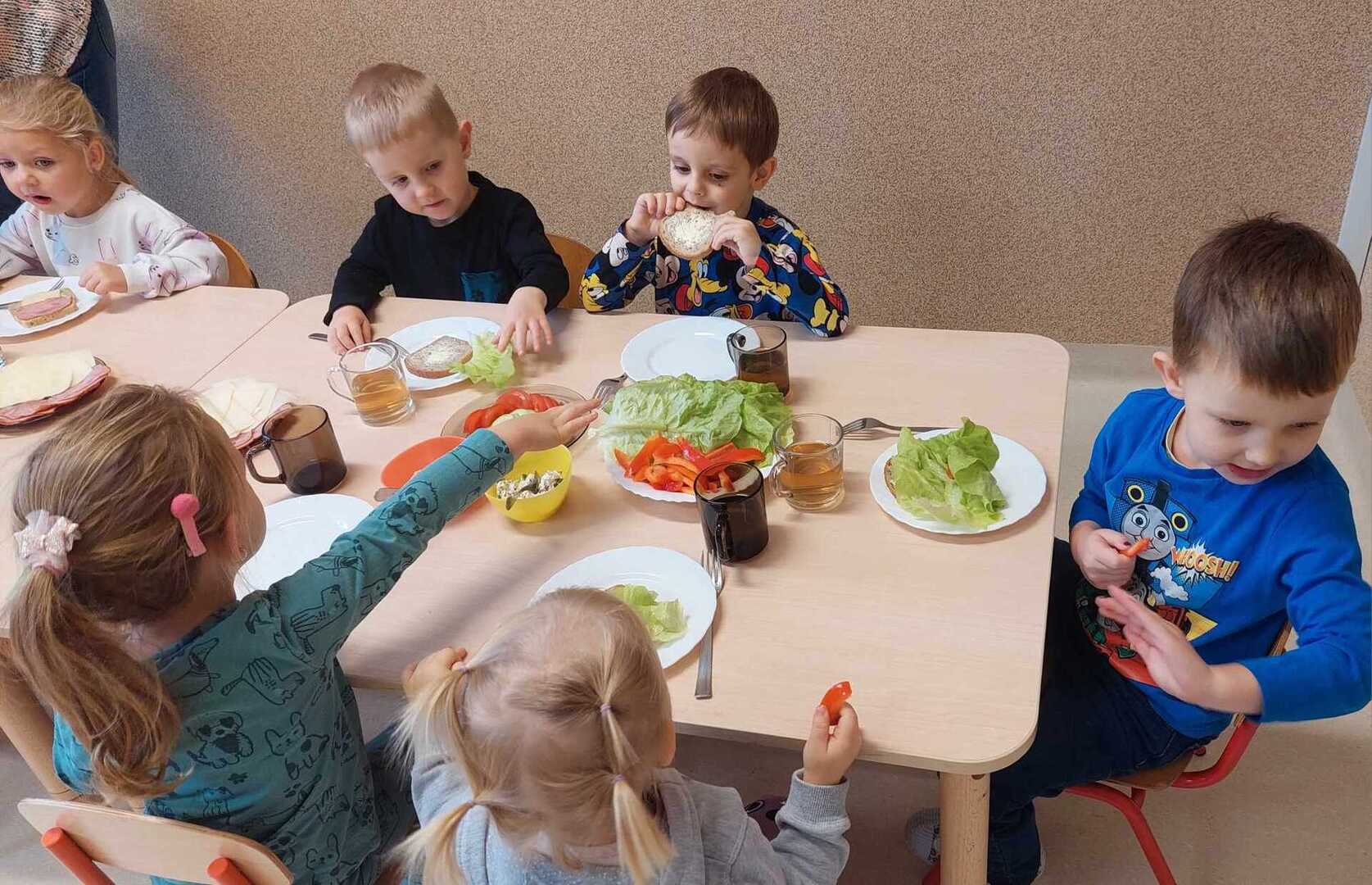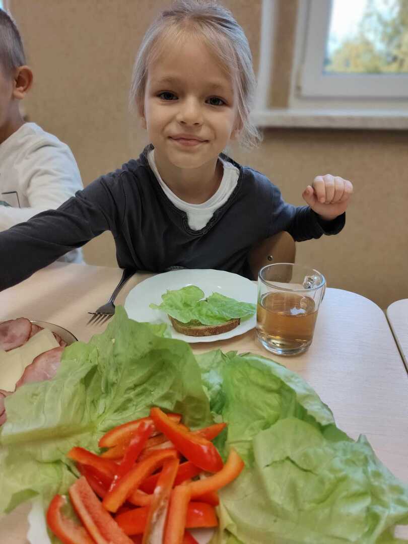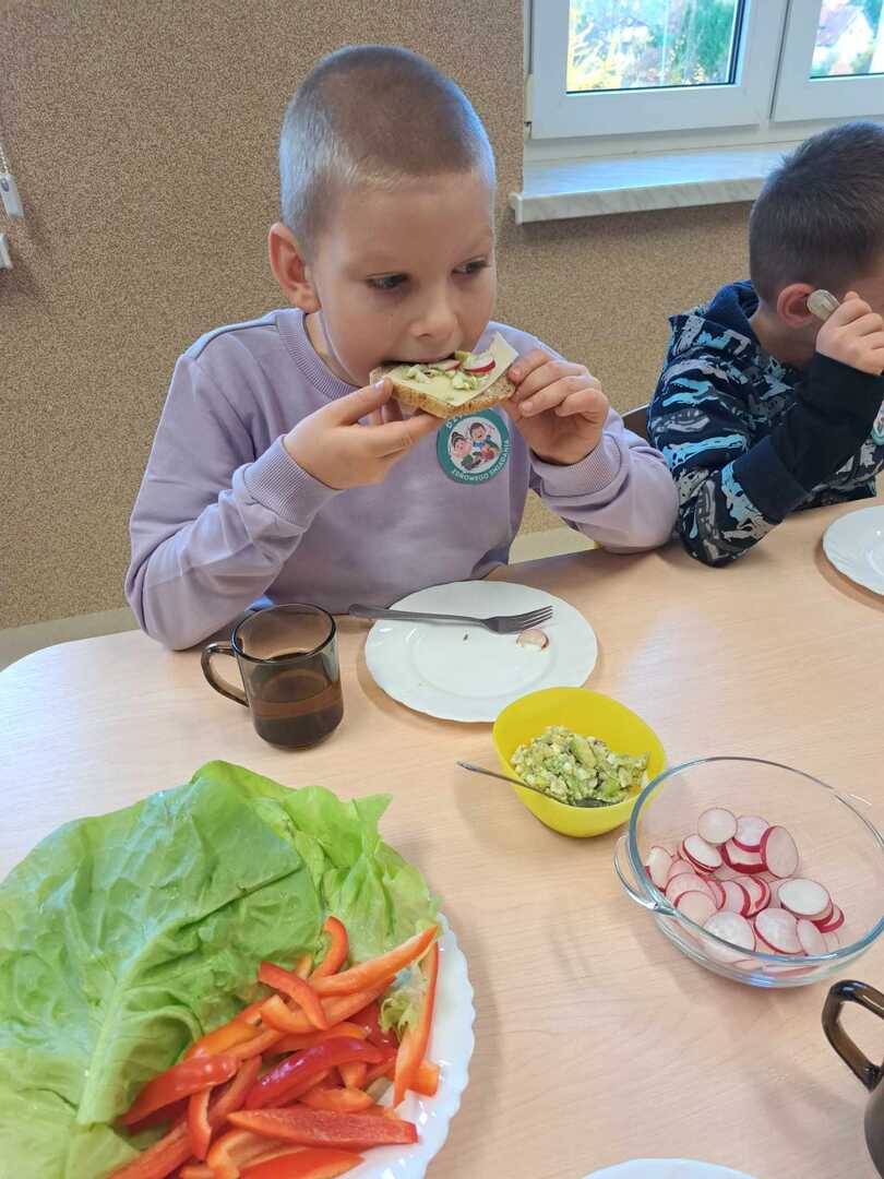 Zadaniem dzieci było wybrać świeże warzywa, owoce, chude mięso oraz pełnoziarniste pieczywo. Pod czujnym okiem nauczycieli i pracowników przedszkola, maluchy układały pomidory, ogórki, paprykę, a także smarowały pastą z awokado czy hummusem. Następnie, z pełnym zaangażowaniem pałaszowały swoje zdrowe i kolorowe kompozycje.