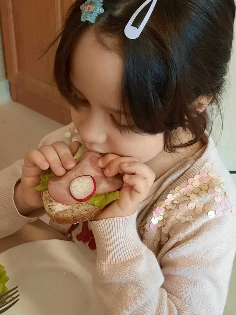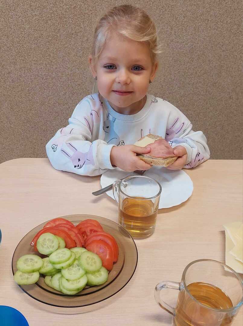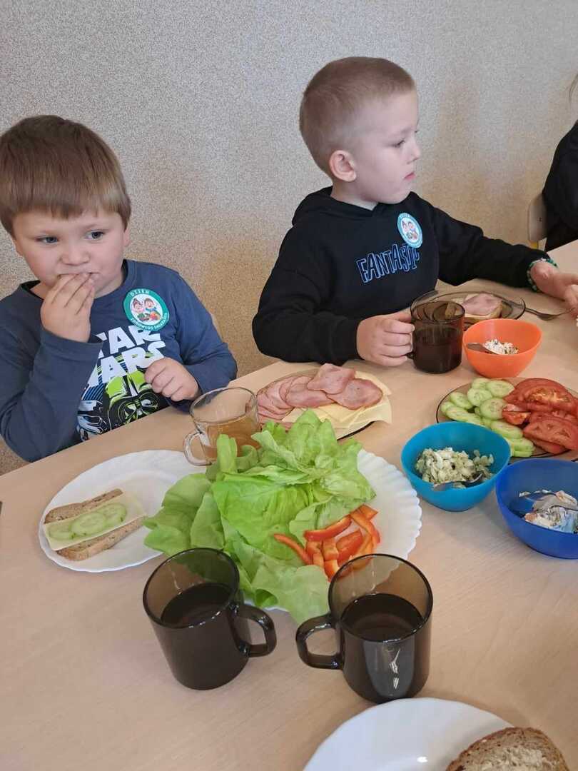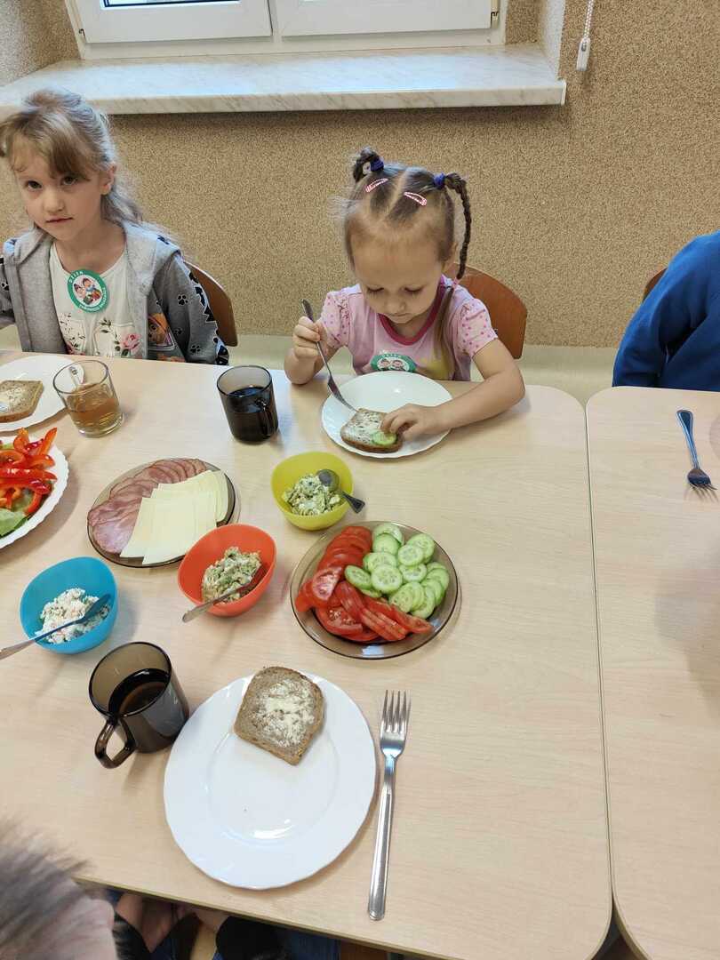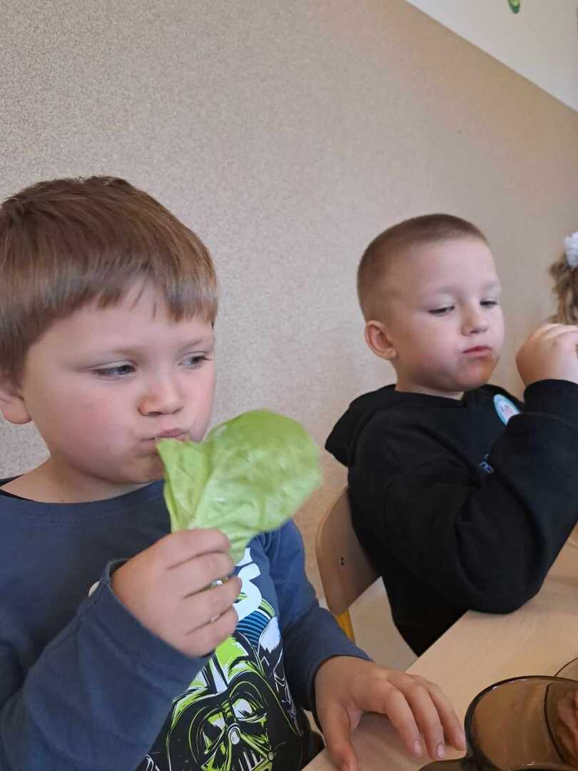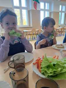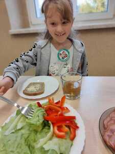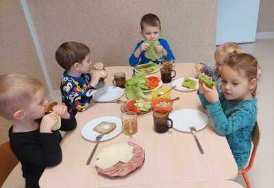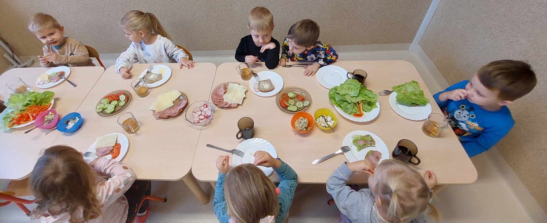 Zadaniem dzieci było wybrać świeże warzywa, owoce, chude mięso oraz pełnoziarniste pieczywo. Pod czujnym okiem nauczycieli i pracowników przedszkola, maluchy układały pomidory, ogórki, paprykę, a także smarowały pastą z awokado czy hummusem. Następnie, z pełnym zaangażowaniem pałaszowały swoje zdrowe i kolorowe kompozycje.
