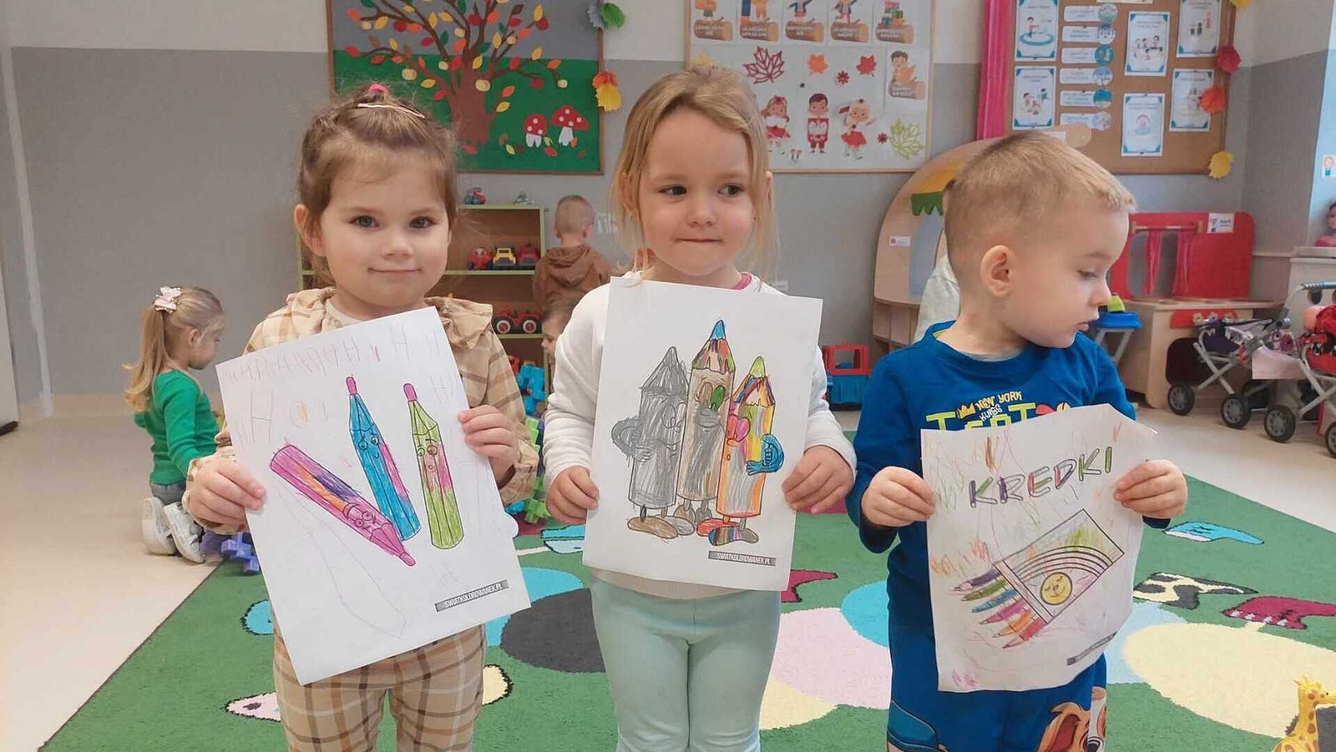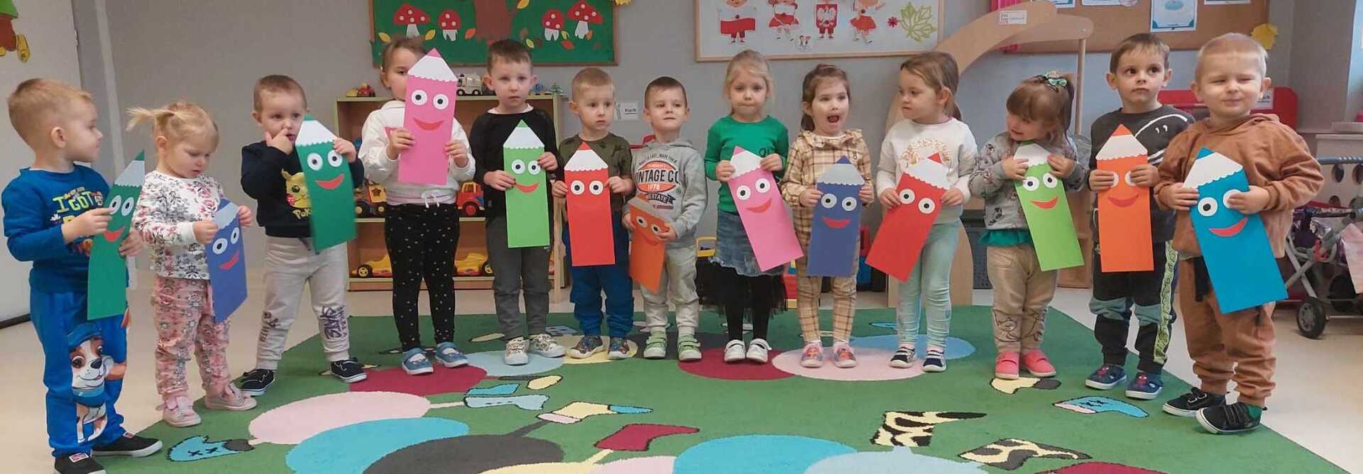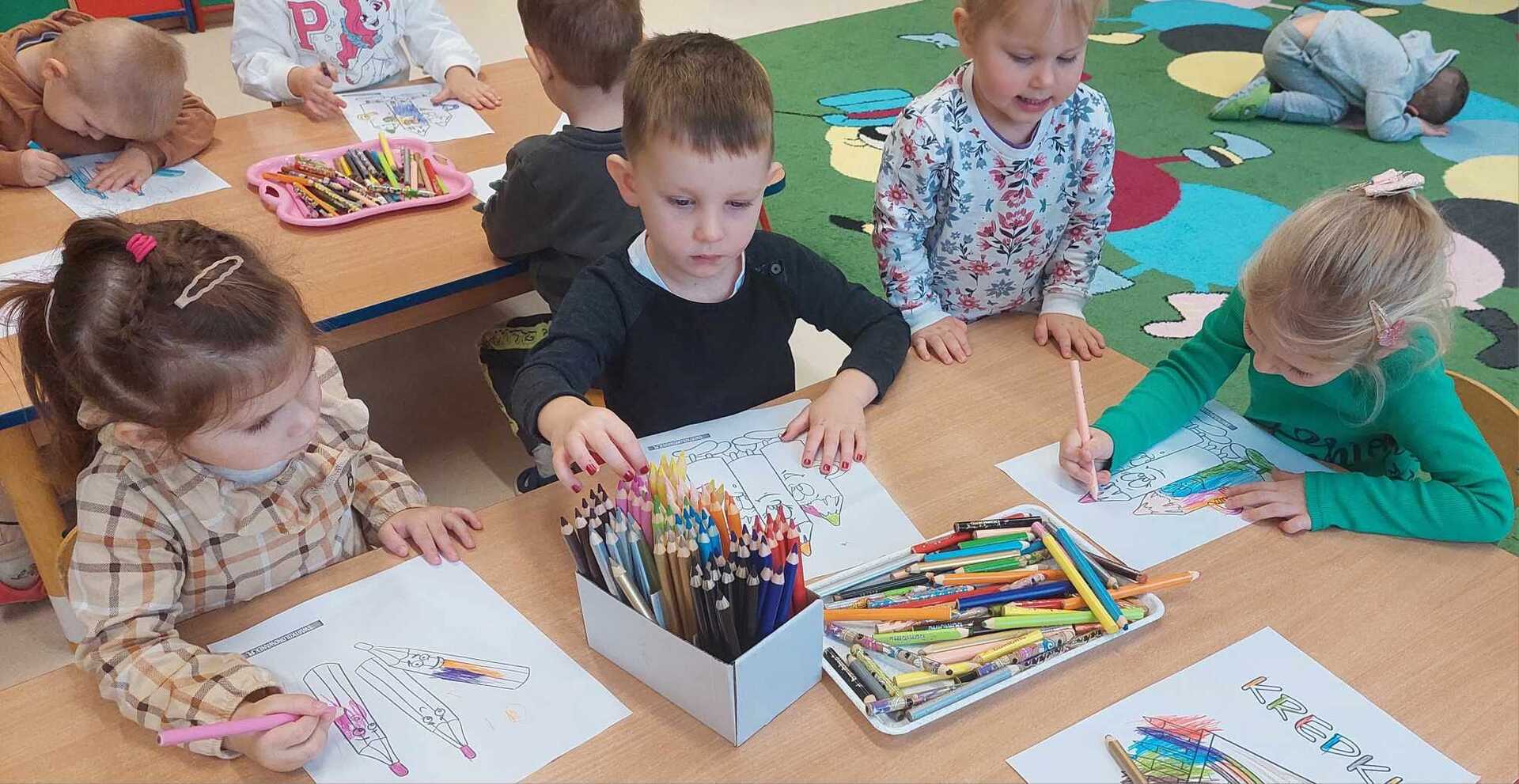 ,,Kolorowe kredki w pudełeczku noszę, kolorowe kredki bardzo lubią mnie, kolorowe kredki kiedy je poproszę, namalują wszystko to co chcę".
