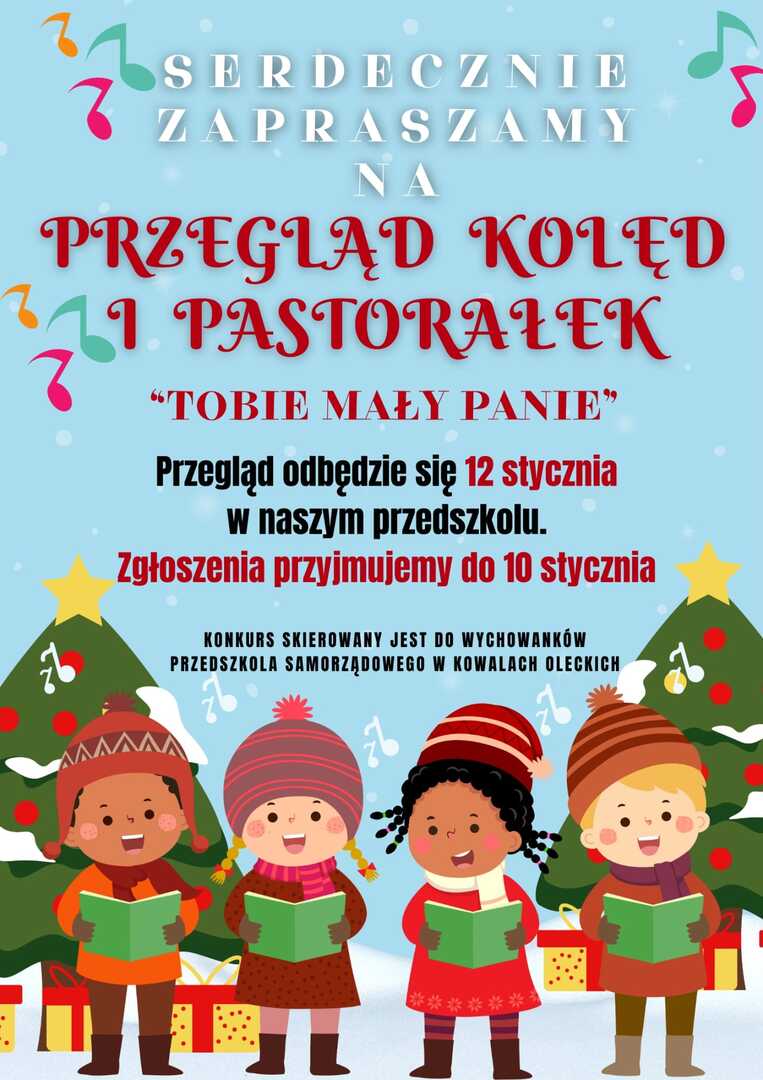 Z radością ogłaszamy pierwszy dzień zimy jako okazję do zorganizowania wspaniałego Przeglądu kolęd i pastorałek w naszym przedszkolu! Serdecznie zapraszamy wszystkie dzieci z Przedszkola Samorządowego w Kowalach Oleckich do wzięcia udziału w tym niezwykłym wydarzeniu, które odbędzie się 12 stycznia.