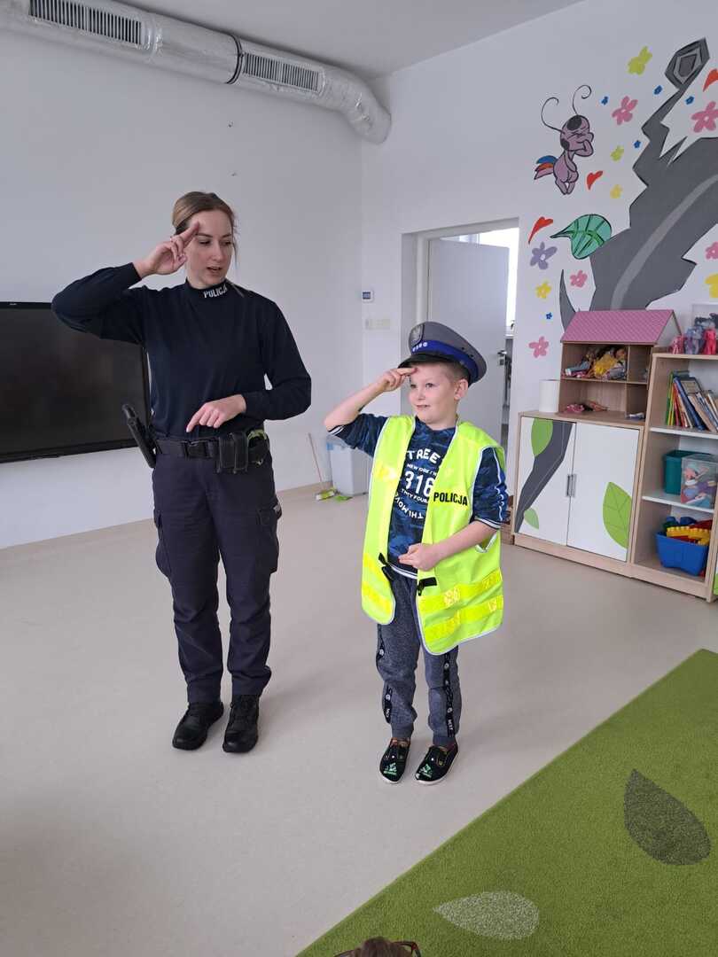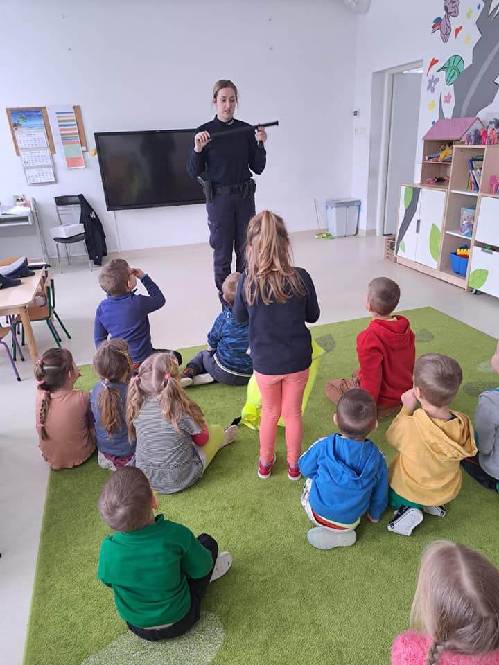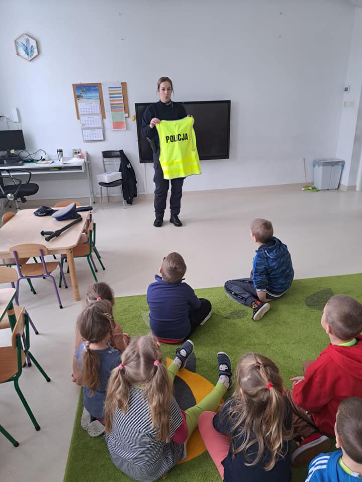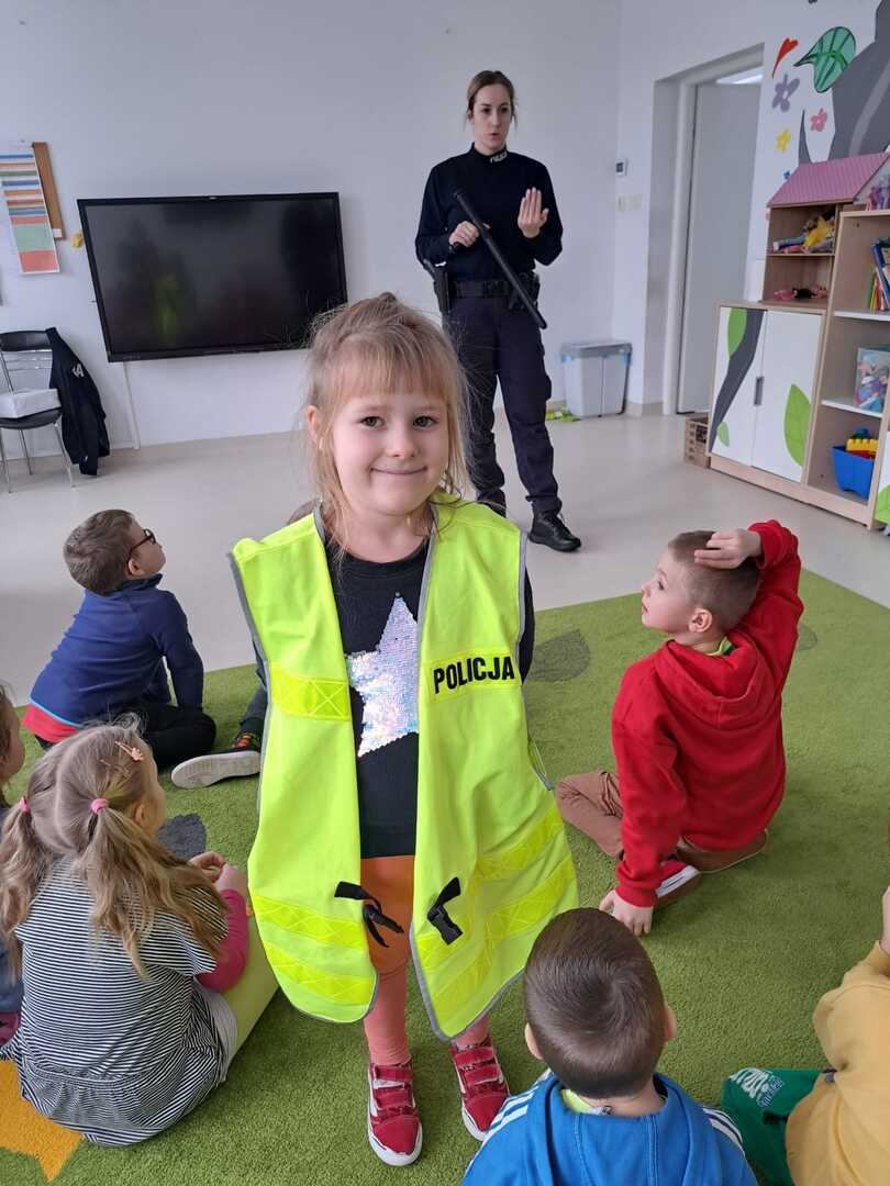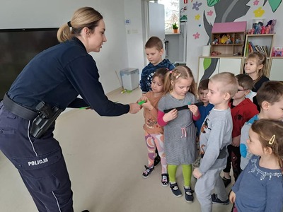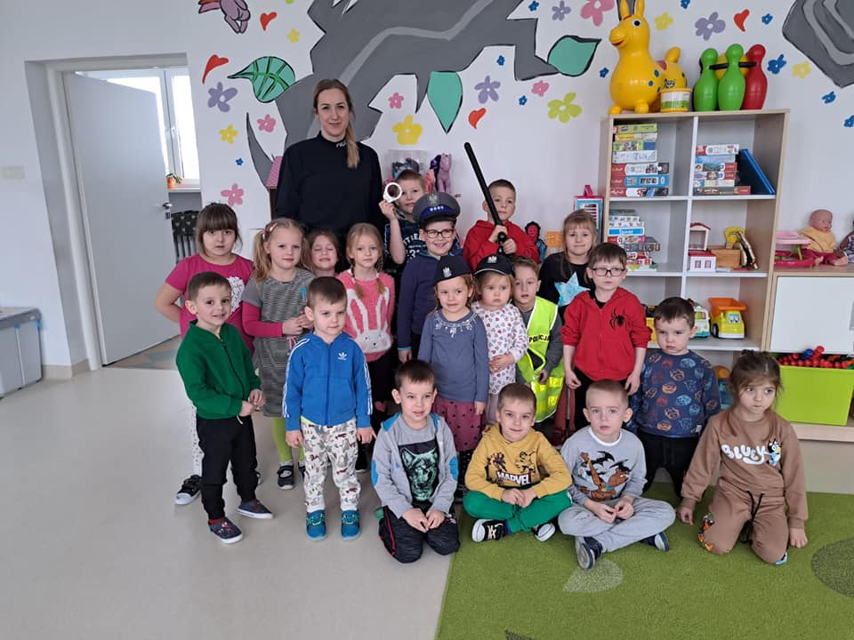 Nasi przedszkolacy uczestniczyli w ciekawych zajęciach prowadzonych przez panią policjantkę. Tematem spotkania było poznanie podstawowych zasad bezpieczeństwa podczas zimowego wypoczynku.Pani policjant przypomniała dzieciom o zachowaniu rozwagi w trakcie zabaw na śniegu i lodzie. Przestrzegała przed zabawami w miejscach niedozwolonych, gdzie może dojść do wypadku.Na zajęciach utrwalono także podstawowe numery alarmowe, które przedszkolaki doskonale znają. Dzieci chętnie odpowiadały na pytania i słuchały rad.