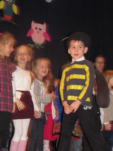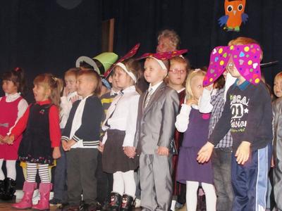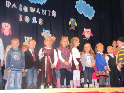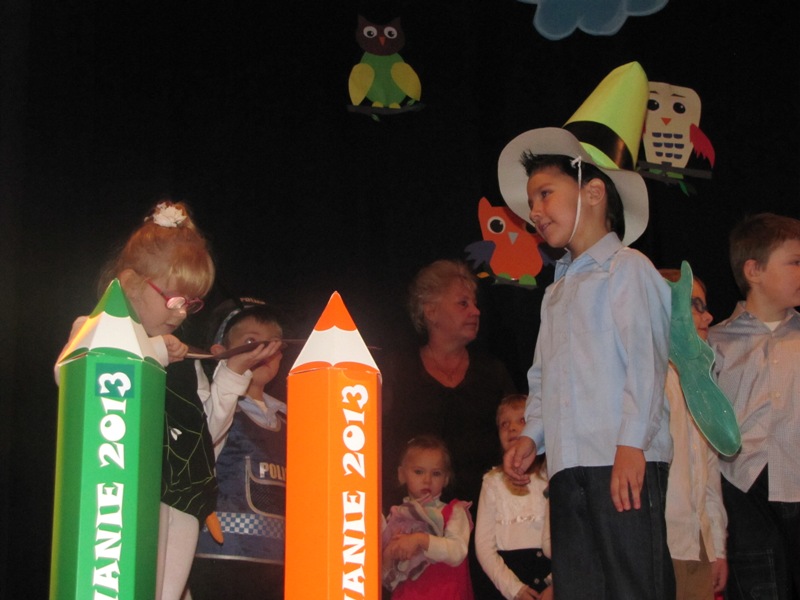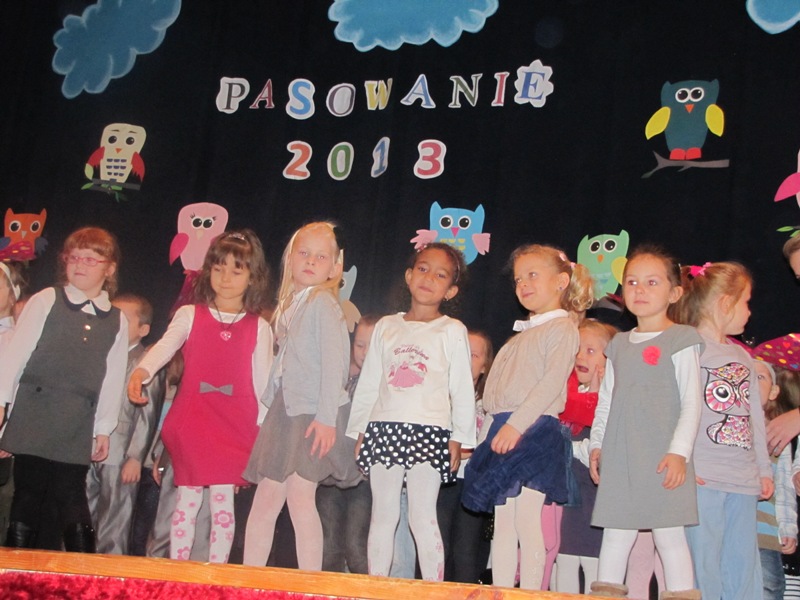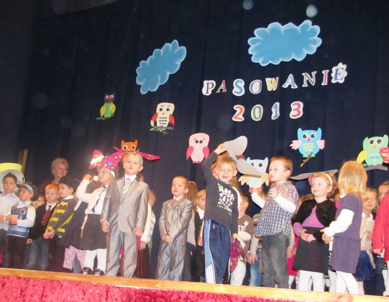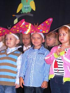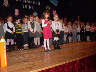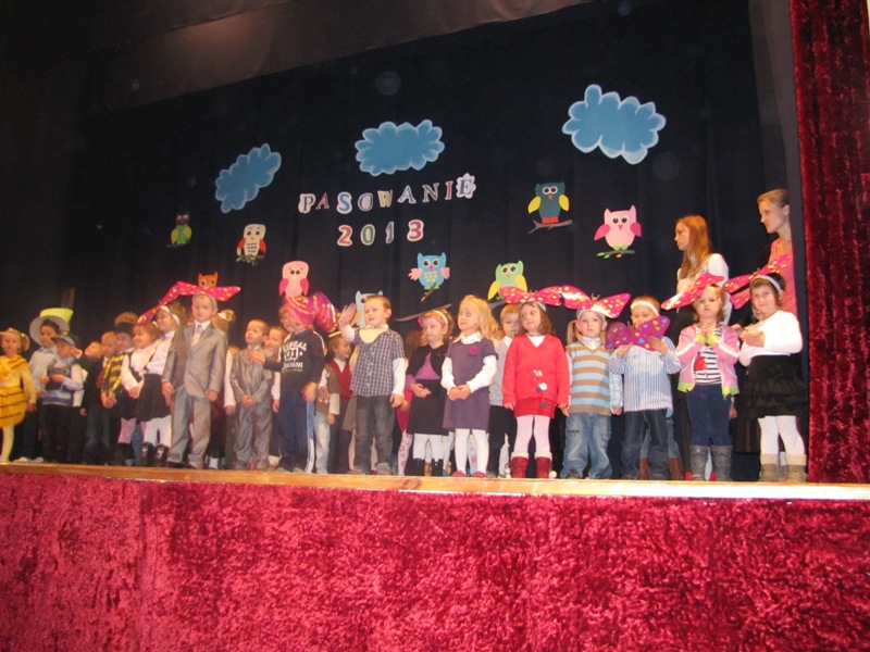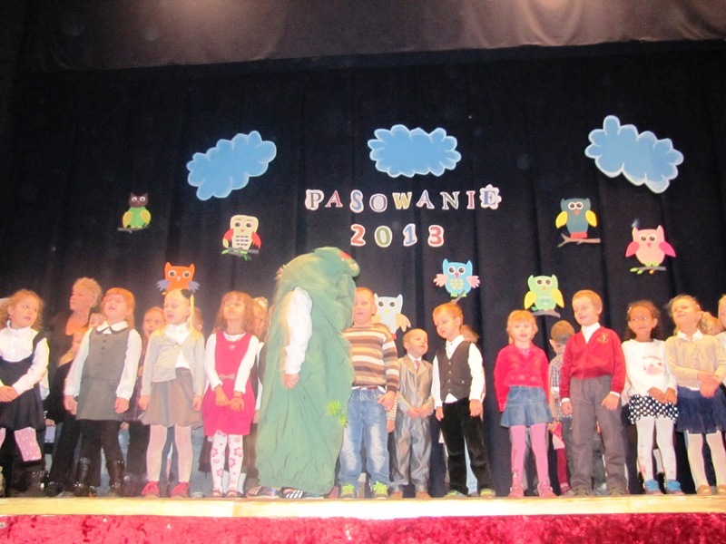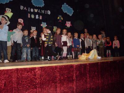 Uroczystości towarzyszyła piękna jesienna aura. Dopełnieniem uroku tego dnia były barwne stroje dzieci , wiersze i piosenki. A przy słowno-muzycznej improwizacji ,,Pszczółki Mai” wszyscy odpłynęliśmy w marzenia. Potem dzieci złożyły przyrzeczenie. Przejście przez magiczne koło i pasowanie przez panią dyrektor atrapą tęczowego lizaka oznaczało gotowość bycia przedszkolakiem. Natomiast my - wychowawczynie poprowadzimy je przez edukację przedszkolną ,, nie najłatwiejszą drogą ale najpiękniejszą”.
