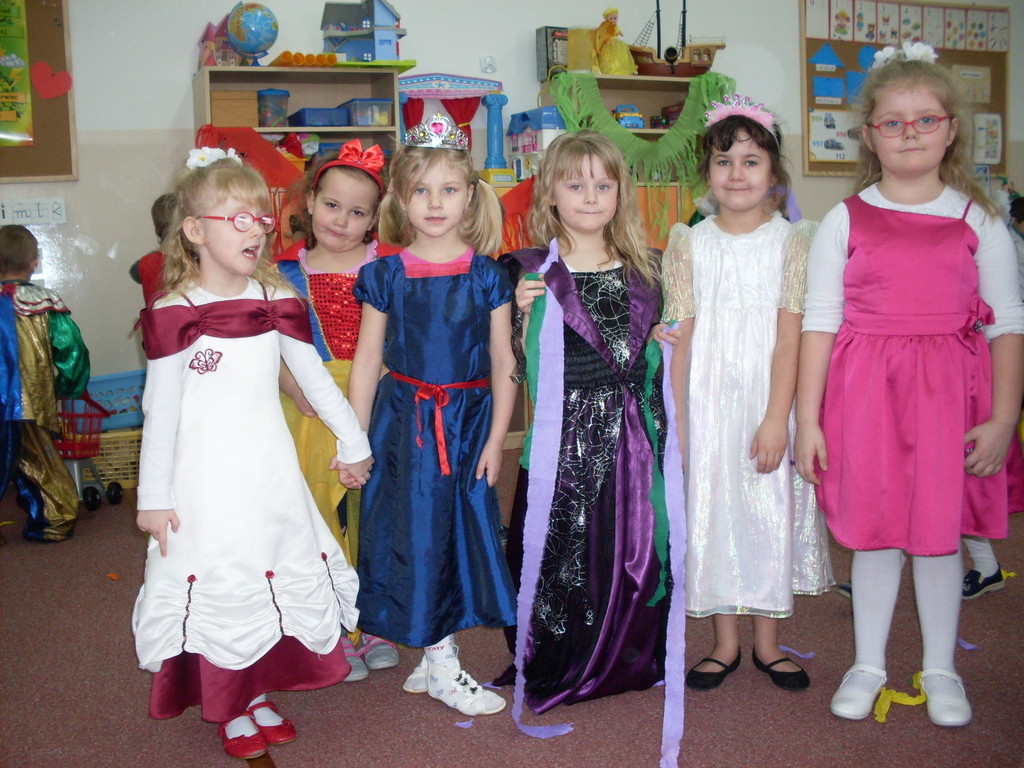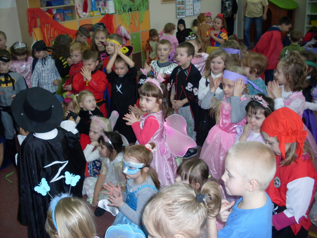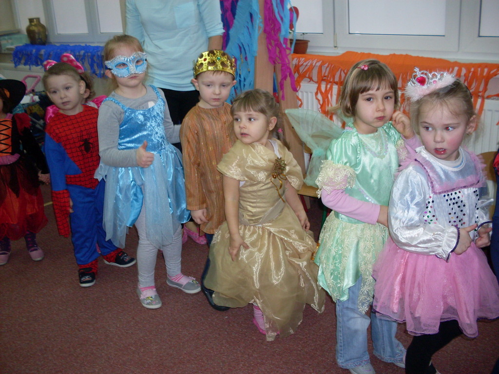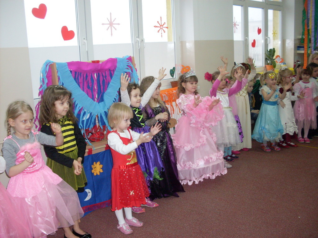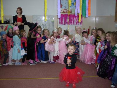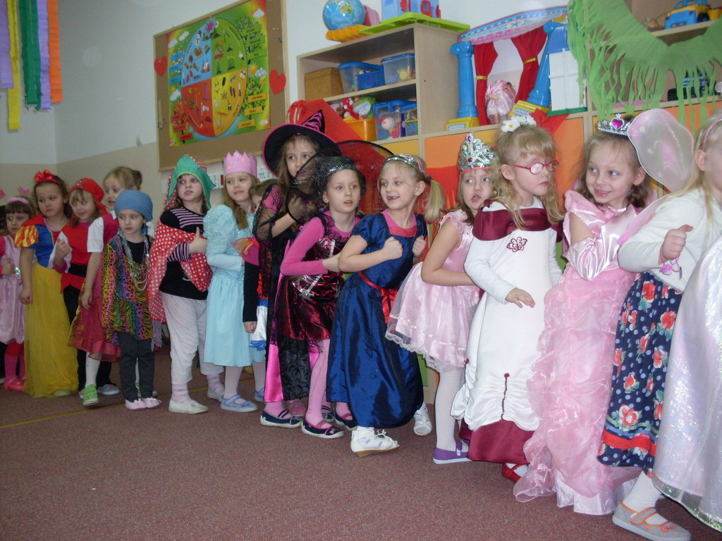 W czwartek, 20 lutego 2014 roku przedszkolaki miały okazję ,,dotknąć” karnawałowej tradycji i zaistnieć w roli bajkowych bohaterów. Rodzice zadbali o barwne stroje dzieci, a tańce przy muzyce wyzwoliły ich aktywność. Akcentem uświetniającym zabawę był m in. taniec ,,Krasnoludek” i ,,Taniec z gwiazdami”, który wymagał umiejętności liczenia. W atmosferę wspaniałej zabawy swój wkład miały: dobra muzyka, wystrój sali i w roli głównej, stroje dzieci. Takie i podobne zabawy wzmacniają koloryt dnia codziennego w naszym przedszkolu.