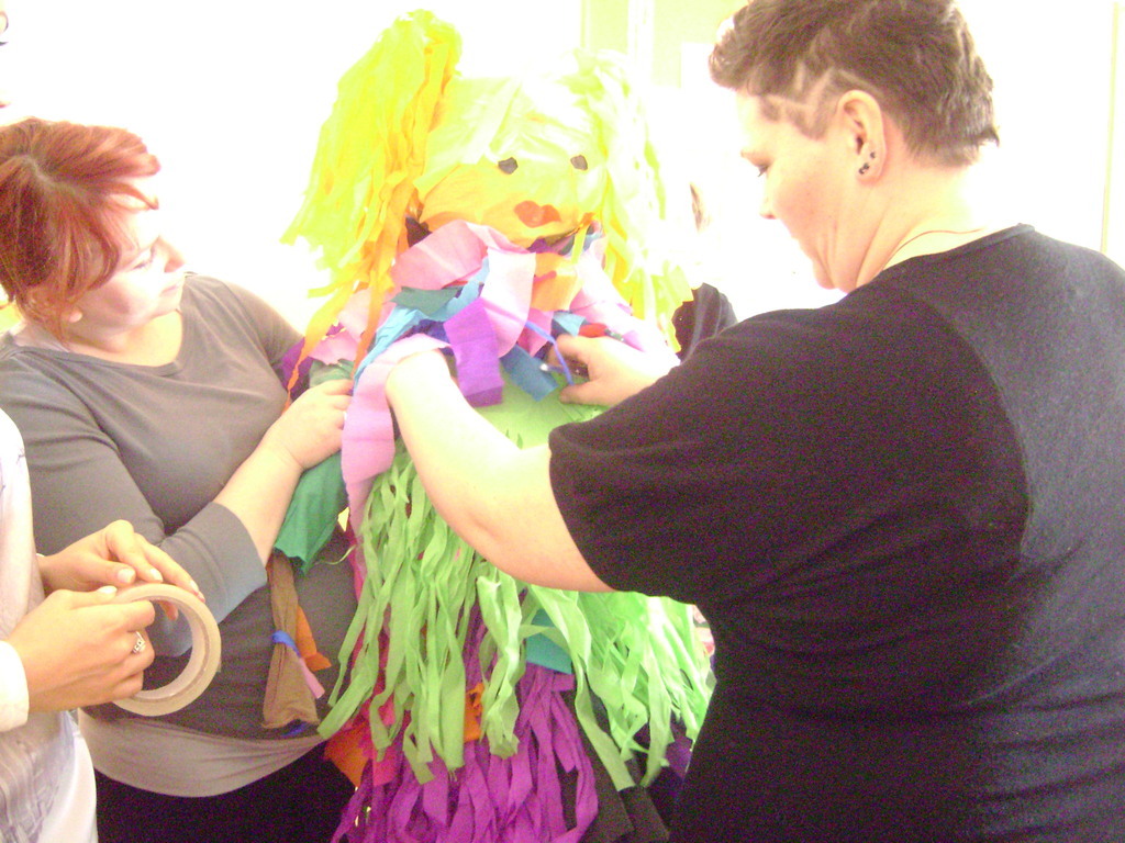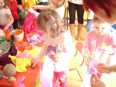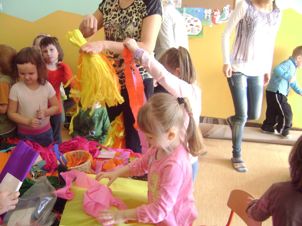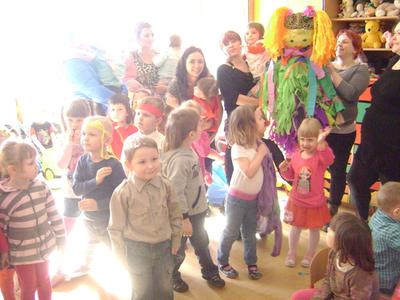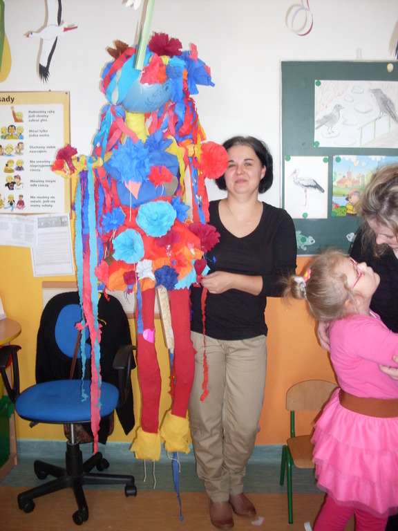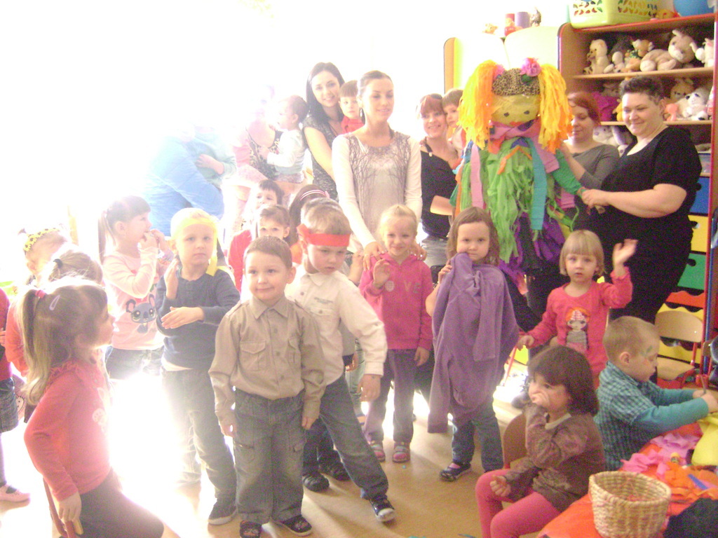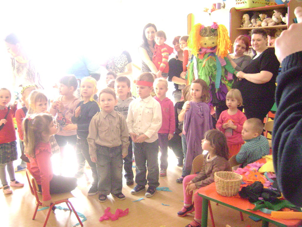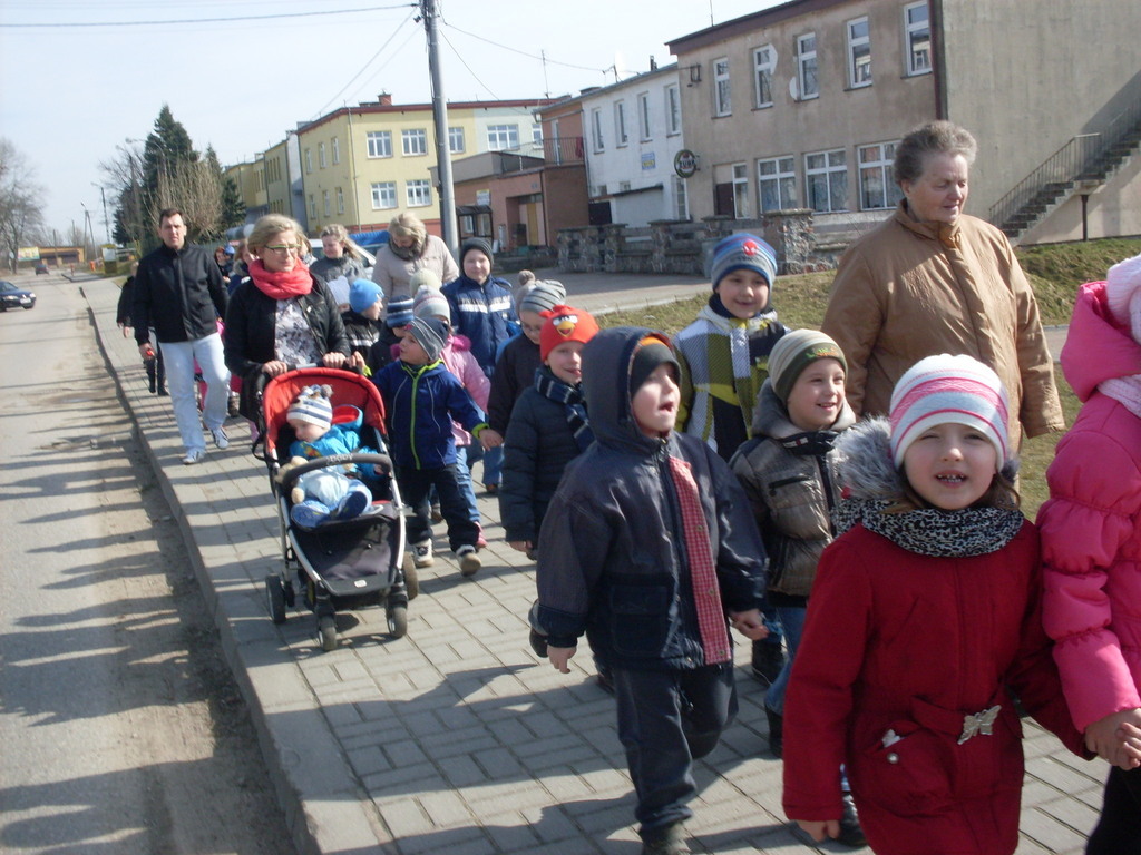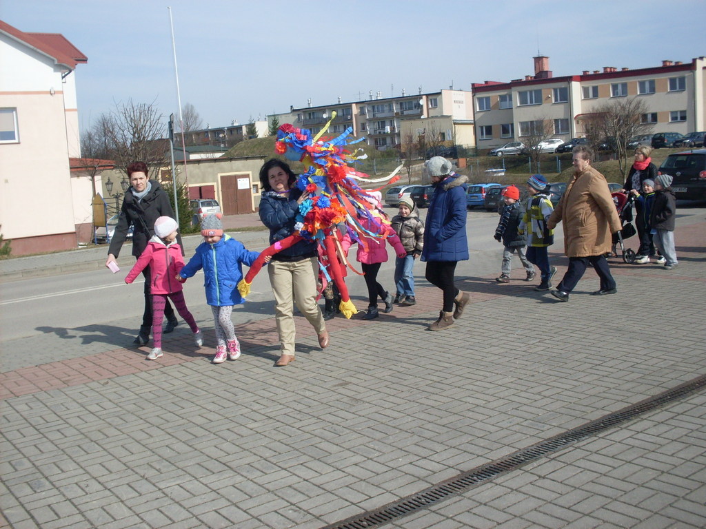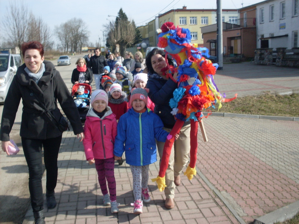 Wszystkie dzieci w pogodnym i radosnym nastroju, jak dzisiejszy wiosenny dzień, wykonały wspólnie z rodzicami Marzannę i symbolicznie wyprowadziły ją z Kowali Oleckich.