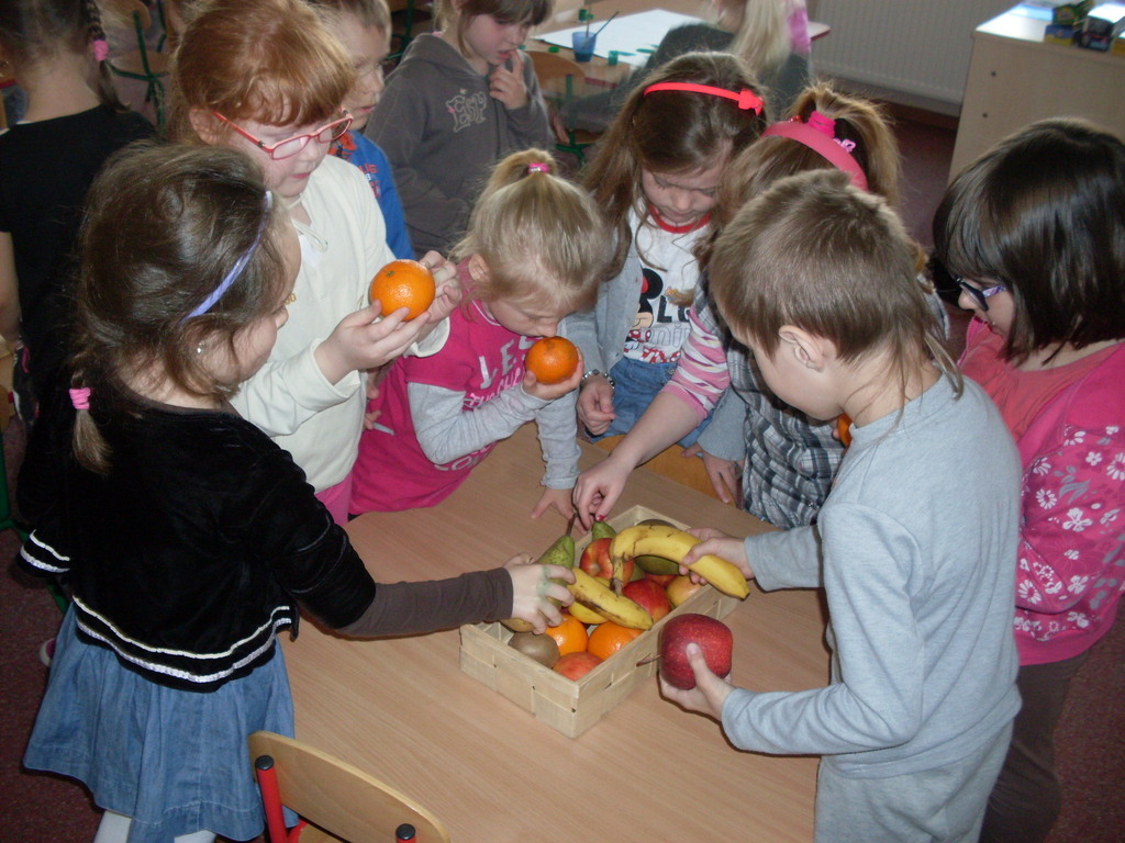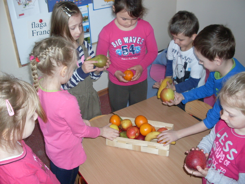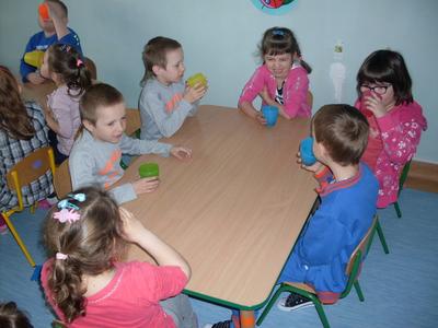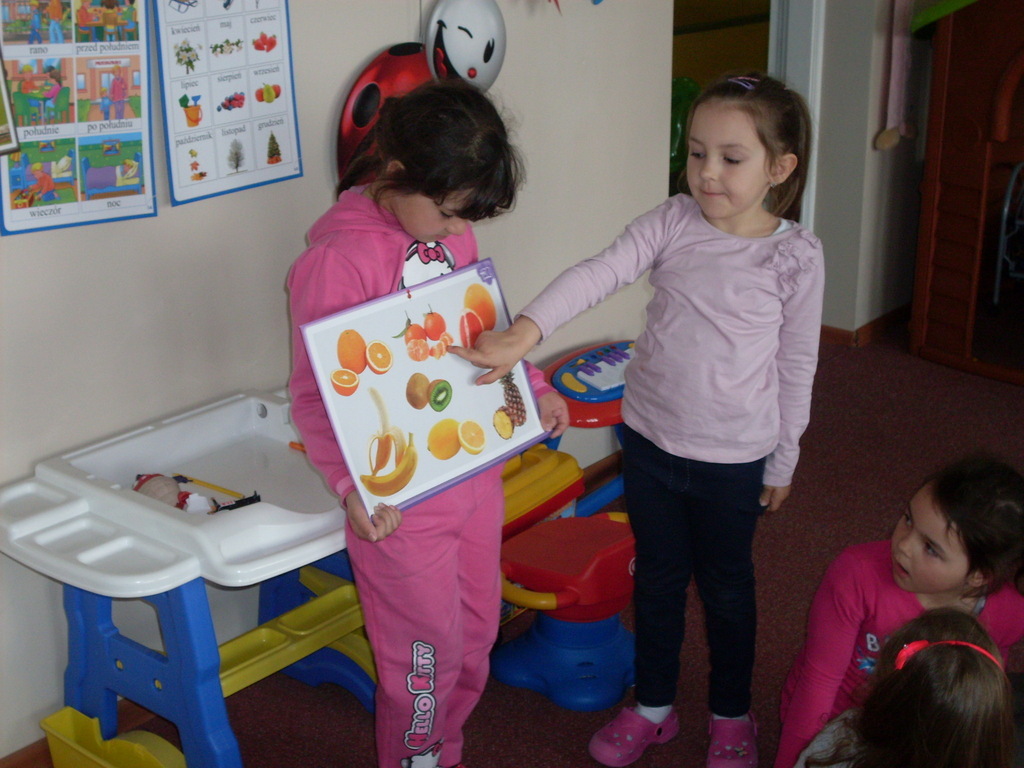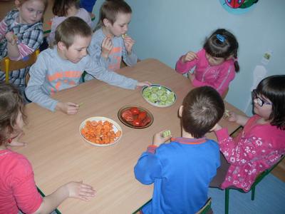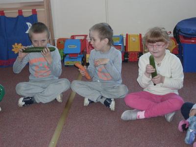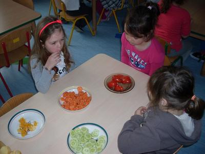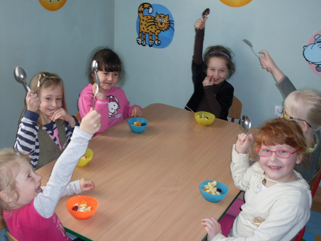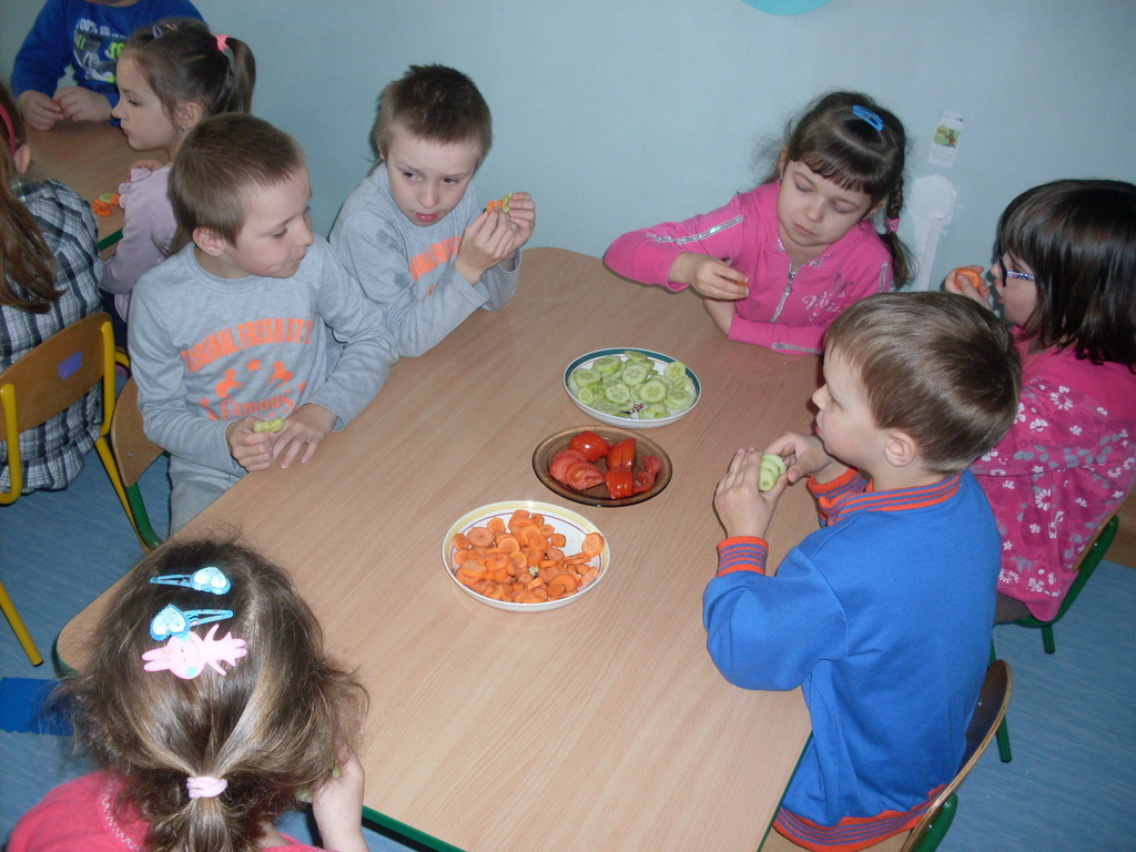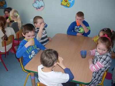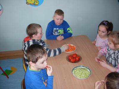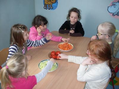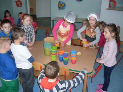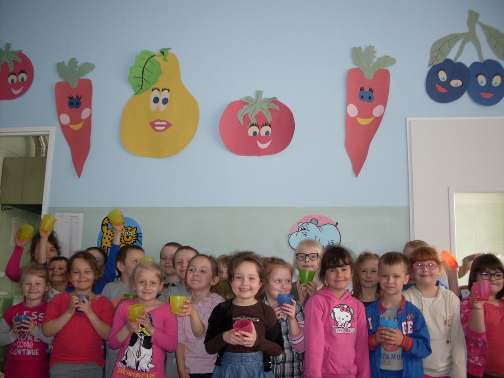 W tym dniu w jadłospisie honorowe miejsce zajęły owoce, warzywa i soki. Było więc słodko, kwaśno i zdrowo. Dzień pachniał owocami i warzywami. Dzieci wykonywały różne zadania, które przeplatane były zabawami. Oprócz degustacji owoców i warzyw przedszkolaki miały okazje wypić własnoręcznie wycisnięty sok z pomarańczy. Swoją przygodę z witaminkami odzwierciedliły w pracach plastycznych.