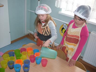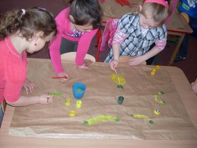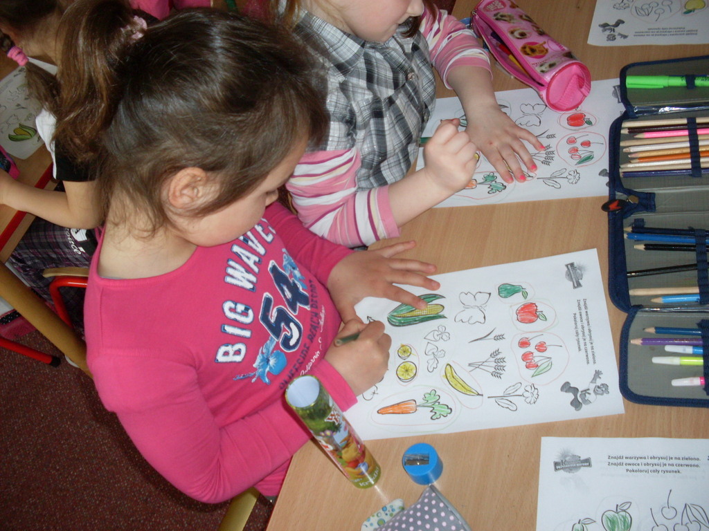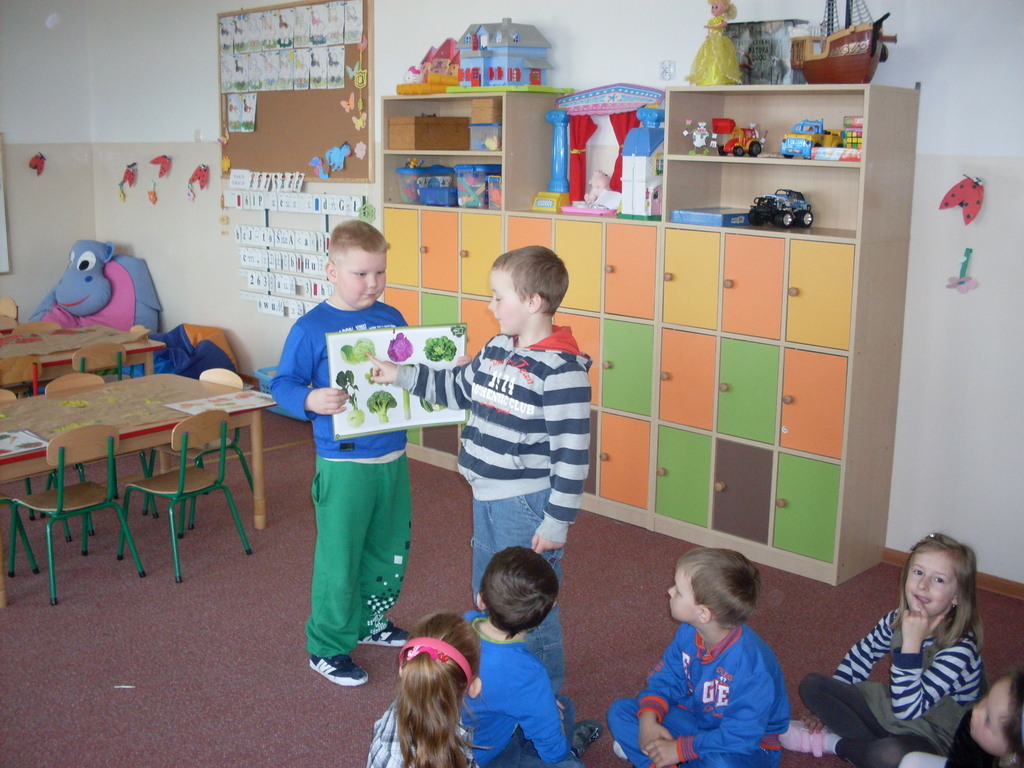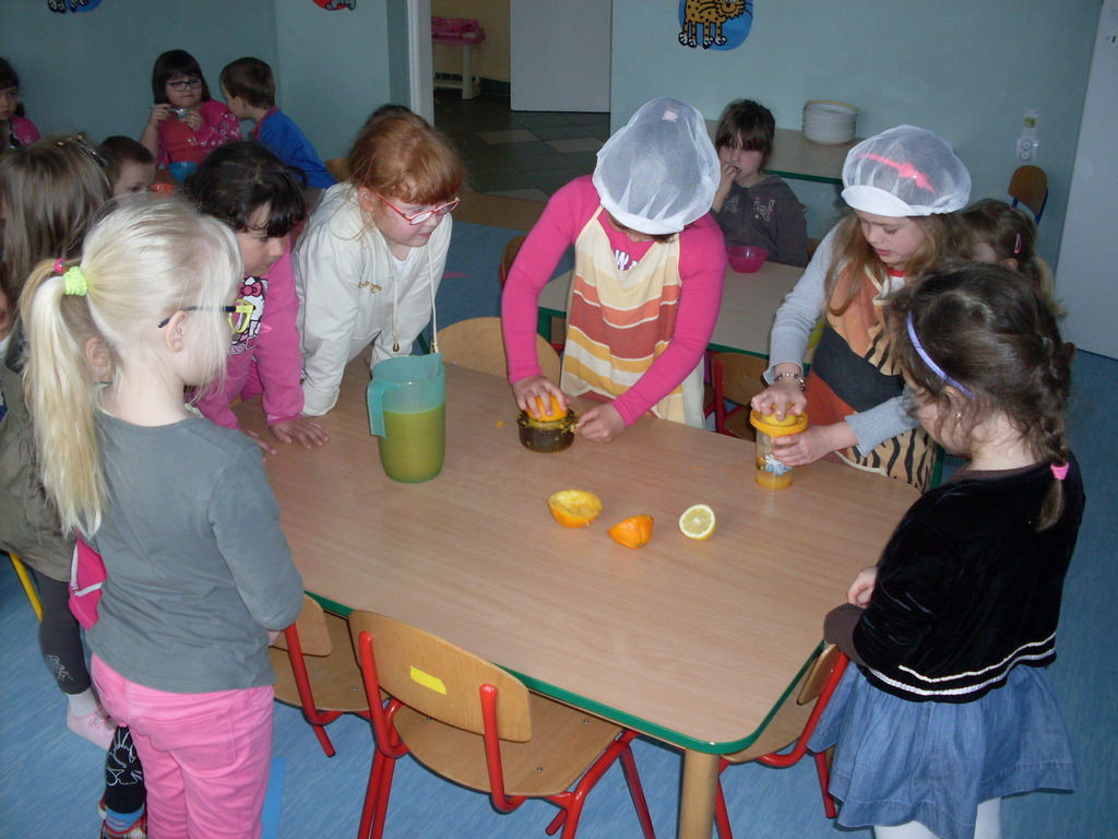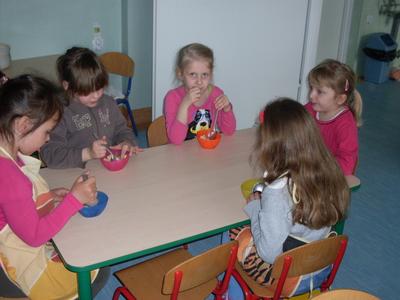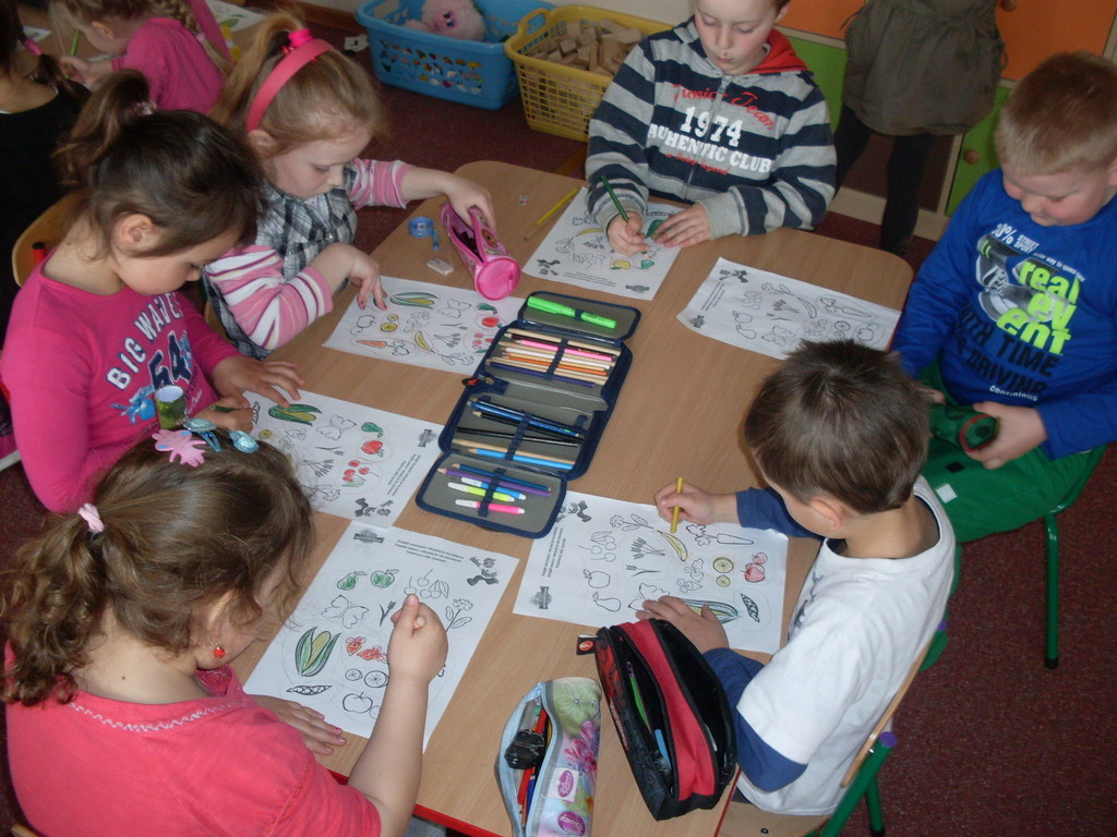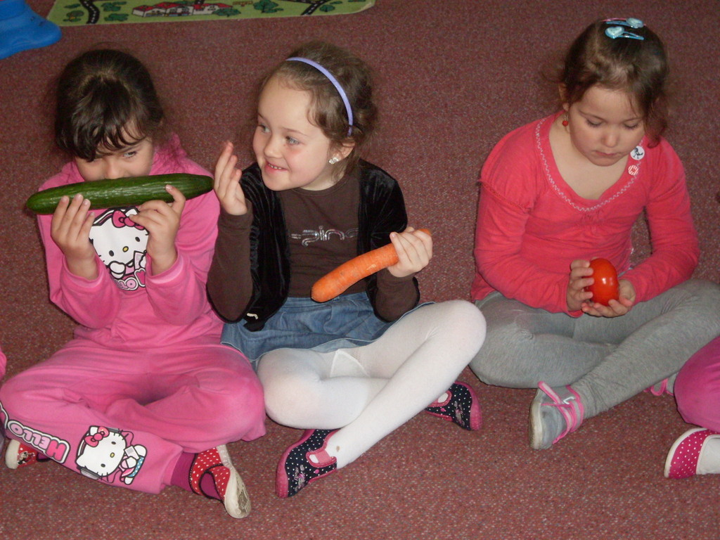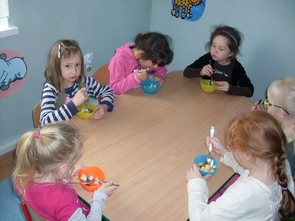 W tym dniu w jadłospisie honorowe miejsce zajęły owoce, warzywa i soki. Było więc słodko, kwaśno i zdrowo. Dzień pachniał owocami i warzywami. Dzieci wykonywały różne zadania, które przeplatane były zabawami. Oprócz degustacji owoców i warzyw przedszkolaki miały okazje wypić własnoręcznie wycisnięty sok z pomarańczy. Swoją przygodę z witaminkami odzwierciedliły w pracach plastycznych.